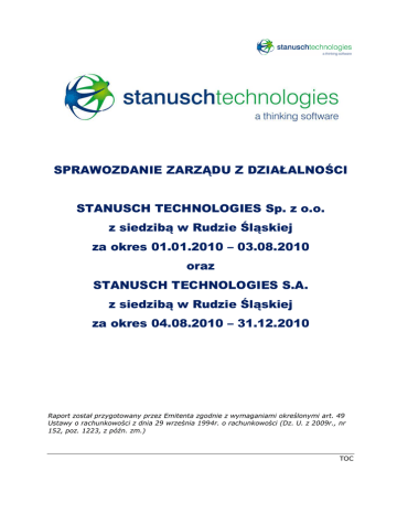 SPRAWOZDANIE ZARZĄDU Z DZIAŁALNOŚCI STANUSCH TECHNOLOGIES Sp. z o.o. z siedzibą w Rudzie Śląskiej za okres 01.01.2010 – 03.08.2010 oraz STANUSCH TECHNOLOGIES S.A. z siedzibą w Rudzie Śląskiej za okres 04.08.2010 – 31.12.2010 Raport został przygotowany przez Emitenta zgodnie z wymaganiami określonymi art. 49 Ustawy o rachunkowości z dnia 29 września 1994r. o rachunkowości (Dz. U. z 2009r., nr 152, poz. 1223, z późn. zm.) TOC Spis treści 1 2. 3. INFORMACJE OGÓLNE ..................................................................................................................................................... 1 1.1. INFORMACJE PODSTAWOWE .............................................................................................................................................. 1 1.2. FORMA PRAWNA I STATUS SPÓŁKI PUBLICZNEJ ................................................................................................................. 1 1.3. SKŁAD OSOBOWY ORGANÓW EMITENTA .......................................................................................................................... 2 1.4. STRUKTURA AKCJONARIATU EMITENTA ........................................................................................................................... 2 1.5. STRUKTURA ORGANIZACYJNA .......................................................................................................................................... 2 1.6. PRZEDMIOT DZIAŁALNOŚCI............................................................................................................................................... 2 DZIAŁALNOŚĆ SPÓŁKI ...................................................................................................................................................... 4 2.1. ISTOTNE ZDARZENIA WPŁYWAJĄCE NA DZIAŁALNOŚĆ EMITENTA W 2010 ROKU .............................................................. 4 2.2. WYKORZYSTANIE ŚRODKÓW UNIJNYCH ........................................................................................................................... 5 2.3. ISTOTNE ZDARZENIA PO ZAKOŃCZENIU 2010 ROKU .......................................................................................................... 6 2.4. PRZEWIDYWANY ROZWÓJ EMITENTA ............................................................................................................................... 7 2.5. WAŻNIEJSZE OSIĄGNIĘCIA W DZIEDZINIE BADAŃ I ROZWOJU ........................................................................................... 8 2.6. NABYCIE UDZIAŁÓW WŁASNYCH ...................................................................................................................................... 9 2.7. INSTRUMENTY FINANSOWE ............................................................................................................................................... 9 2.8. INFORMACJA O STOSOWANIU ZASAD ŁADU KORPORACYJNEGO ........................................................................................ 9 DANE EKONOMICZNO-FINANSOWE ........................................................................................................................... 10 3.1. 3.1.1. 4. WYNIKI EKONOMICZNE SPÓŁKI ...................................................................................................................................... 10 Informacja na temat realizacji prognoz .................................................................................................................... 10 3.2. WYBRANE DANE Z RACHUNKU ZYSKÓW I STRAT ZA 2010 ROK ....................................................................................... 10 3.3. WYBRANE DANE Z BILANSU ZA 2010 ROK ...................................................................................................................... 11 3.4. INFORMACJA NA TEMAT WYNAGRODZEŃ CZŁONKÓW ORGANÓW SPÓŁKI ORAZ AUTORYZOWANEGO DORADCY ............. 11 CZYNNIKI RYZYKA .......................................................................................................................................................... 12 4.1. CZYNNIKI RYZYKA ZWIĄZANE Z DZIAŁALNOŚCIĄ EMITENTA, JEGO BRANŻĄ ORAZ OTOCZENIEM RYNKOWYM ............... 12 4.1.1. Ryzyko związane z realizacją strategii rozwoju Emitenta oraz możliwością niezrealizowania celów emisji ........... 12 4.1.2. Ryzyko technologiczne .............................................................................................................................................. 12 4.1.3. Ryzyko fluktuacji kadry ............................................................................................................................................. 12 4.1.4. Ryzyko związane z realizowanymi umowami ............................................................................................................ 12 4.1.5. Ryzyko związane z tworzeniem nowych produktów i usług ....................................................................................... 13 4.1.6. Ryzyko związane z zachowaniem płynności finansowej ............................................................................................ 13 4.2. CZYNNIKI RYZYKA ZWIĄZANE Z OTOCZENIEM EMITENTA............................................................................................... 13 4.2.1. Ryzyko związane z konkurencją ................................................................................................................................ 13 4.2.2. Ryzyko związane z koniunkturą gospodarczą ............................................................................................................ 13 4.3. CZYNNIKI RYZYKA O ISTOTNYM ZNACZENIU DLA AKCJI WPROWADZANYCH DO ALTERNATYWNEGO SYSTEMU OBROTU 13 4.3.1. Ryzyko związane z wydaniem decyzji o zawieszeniu lub o wykluczeniu akcji spółki z obrotu .................................. 13 4.3.2. Ryzyko pł