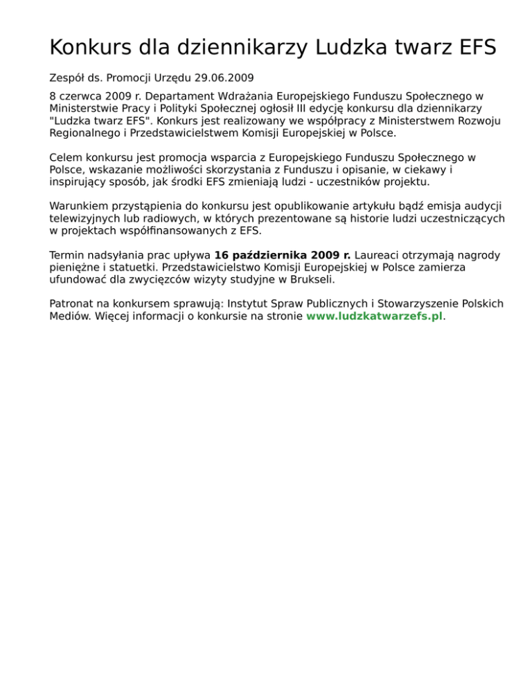 Konkurs dla dziennikarzy Ludzka twarz EFS Zespół ds. Promocji Urzędu 29.06.2009 8 czerwca 2009 r. Departament Wdrażania Europejskiego Funduszu Społecznego w Ministerstwie Pracy i Polityki Społecznej ogłosił III edycję konkursu dla dziennikarzy "Ludzka twarz EFS". Konkurs jest realizowany we współpracy z Ministerstwem Rozwoju Regionalnego i Przedstawicielstwem Komisji Europejskiej w Polsce. Celem konkursu jest promocja wsparcia z Europejskiego Funduszu Społecznego w Polsce, wskazanie możliwości skorzystania z Funduszu i opisanie, w ciekawy i inspirujący sposób, jak środki EFS zmieniają ludzi - uczestników projektu. Warunkiem przystąpienia do konkursu jest opublikowanie artykułu bądź emisja audycji telewizyjnych lub radiowych, w których prezentowane są historie ludzi uczestniczących w projektach współfinansowanych z EFS. Termin nadsyłania prac upływa 16 października 2009 r. Laureaci otrzymają nagrody pieniężne i statuetki. Przedstawicielstwo Komisji Europejskiej w Polsce zamierza ufundować dla zwycięzców wizyty studyjne w Brukseli. Patronat na konkursem sprawują: Instytut Spraw Publicznych i Stowarzyszenie Polskich Mediów. Więcej informacji o konkursie na stronie www.ludzkatwarzefs.pl.