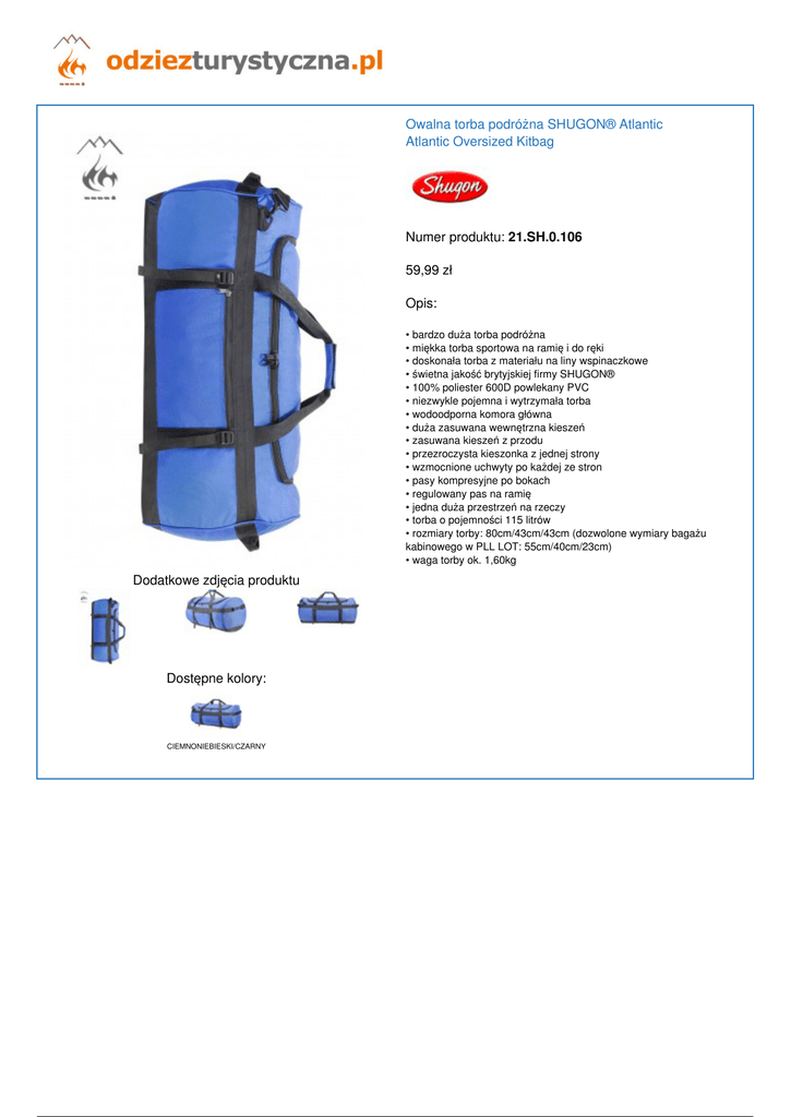 Owalna torba podróżna SHUGON® Atlantic Atlantic Oversized Kitbag Numer produktu: 21.SH.0.106 59,99 zł Opis: • bardzo duża torba podróżna • miękka torba sportowa na ramię i do ręki • doskonała torba z materiału na liny wspinaczkowe • świetna jakość brytyjskiej firmy SHUGON® • 100% poliester 600D powlekany PVC • niezwykle pojemna i wytrzymała torba • wodoodporna komora główna • duża zasuwana wewnętrzna kieszeń • zasuwana kieszeń z przodu • przezroczysta kieszonka z jednej strony • wzmocnione uchwyty po każdej ze stron • pasy kompresyjne po bokach • regulowany pas na ramię • jedna duża przestrzeń na rzeczy • torba o pojemności 115 litrów • rozmiary torby: 80cm/43cm/43cm (dozwolone wymiary bagażu kabinowego w PLL LOT: 55cm/40cm/23cm) • waga torby ok. 1,60kg Dodatkowe zdjęcia produktu Dostępne kolory: CIEMNONIEBIESKI/CZARNY Powered by TCPDF (www.tcpdf.org)