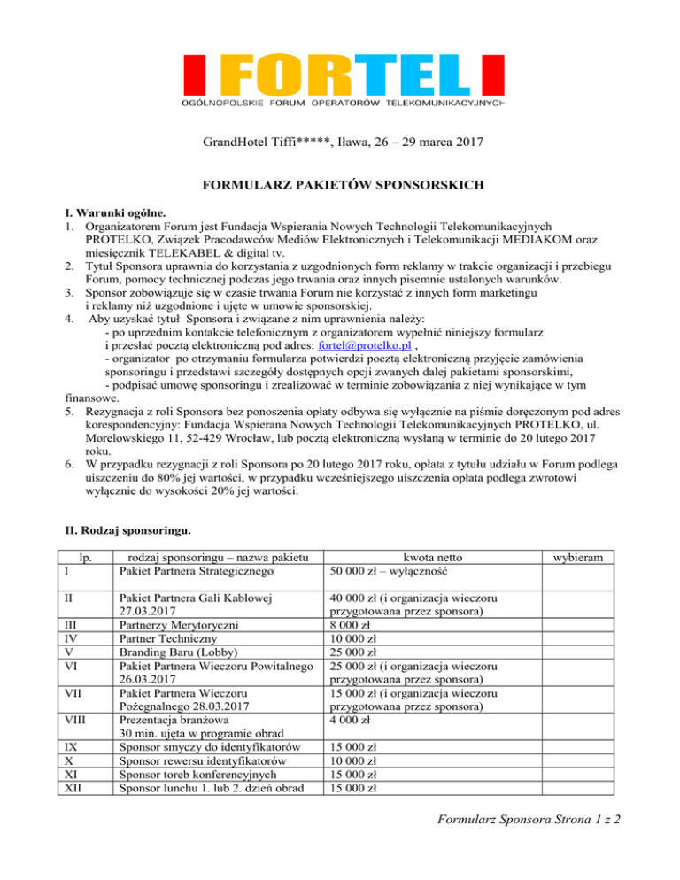 GrandHotel Tiffi*****, Iława, 26 – 29 marca 2017 FORMULARZ PAKIETÓW SPONSORSKICH I. Warunki ogólne. 1. Organizatorem Forum jest Fundacja Wspierania Nowych Technologii Telekomunikacyjnych PROTELKO, Związek Pracodawców Mediów Elektronicznych i Telekomunikacji MEDIAKOM oraz miesięcznik TELEKABEL & digital tv. 2. Tytuł Sponsora uprawnia do korzystania z uzgodnionych form reklamy w trakcie organizacji i przebiegu Forum, pomocy technicznej podczas jego trwania oraz innych pisemnie ustalonych warunków. 3. Sponsor zobowiązuje się w czasie trwania Forum nie korzystać z innych form marketingu i reklamy niż uzgodnione i ujęte w umowie sponsorskiej. 4. Aby uzyskać tytuł Sponsora i związane z nim uprawnienia należy: - po uprzednim kontakcie telefonicznym z organizatorem wypełnić niniejszy formularz i przesłać pocztą elektroniczną pod adres: [email protected] , - organizator po otrzymaniu formularza potwierdzi pocztą elektroniczną przyjęcie zamówienia sponsoringu i przedstawi szczegóły dostępnych opcji zwanych dalej pakietami sponsorskimi, - podpisać umowę sponsoringu i zrealizować w terminie zobowiązania z niej wynikające w tym finansowe. 5. Rezygnacja z roli Sponsora bez ponoszenia opłaty odbywa się wyłącznie na piśmie doręczonym pod adres korespondencyjny: Fundacja Wspierana Nowych Technologii Telekomunikacyjnych PROTELKO, ul. Morelowskiego 11, 52-429 Wrocław, lub pocztą elektroniczną wysłaną w terminie do 20 lutego 2017 roku. 6. W przypadku rezygnacji z roli Sponsora po 20 lutego 2017 roku, opłata z tytułu udziału w Forum podlega uiszczeniu do 80% jej wartości, w przypadku wcześniejszego uiszczenia opłata podlega zwrotowi wyłącznie do wysokości 20% jej wartości. II. Rodzaj sponsoringu. lp. I II III IV V VI VII VIII IX X XI XII rodzaj sponsoringu – nazwa pakietu Pakiet Partnera Strategicznego kwota netto 50 000 zł – wyłączność Pakiet Partnera Gali Kablowej 27.03.2017 Partnerzy Merytoryczni Partner Techniczny Branding Baru (Lobby) Pakiet Partnera Wieczoru Powitalnego 26.03.2017 Pakiet Partnera Wieczoru Pożegnalnego 28.03.2017 Prezentacja branżowa 30 min. ujęta w programie obrad Sponsor smyczy do identyfikatorów Sponsor rewersu identyfikatorów Sponsor toreb konferencyjnych Sponsor lunchu 1. lub 2. dzień obrad 40 000 zł (i organizacja wieczoru przygotowana przez sponsora) 8 000 zł 10 000 zł 25 000 zł 25 000 zł (i organizacja wieczoru przygotowana przez sponsora) 15 000 zł (i organizacja wieczoru przygotowana przez sponsora) 4 000 zł wybieram 15 000 zł 10 000 zł 15 000 zł 15 000 zł Formularz Sponsora Strona 1 z 2 XIII XV Sponsor przerw kawowych 27.03.2017 i 28.03.2017 Materiały reklamowe rozdawane przy rejestracji (cukierki, ulotki, foldery itp.) lub pakowane do toreb konferencyjnych Elementy reklamowe – roll up, baner XVI Elementy reklamowe wolno stojące XVII Elementy reklamowe wolno stojące – balony lub inne – na zewnątrz hotelu Hostessy sponsorów – do dwóch osób reprezentujących sponsora (bez noclegów) Okładki do kart hotelowych Reklama wielkoformatowa na elewacji hotelu XIV XVIII IXX XX 10 000 zł 3 000 zł 2 500 zł – ustawienie 1 szt. w holu lub przy sali konferencyjnej 3 000 zł – 5 000 zł w zależności od wielkości, ustawiane w lobby hotelowym lub innym miejscu wewnątrz np. kasetony, automaty itp. 3 000 zł – 6 000 zł w zależności od rozmiarów zajmowanej powierzchni 700 zł/osoba 8 000 zł do negocjacji III. Dane firmy ubiegającej się o tytuł Sponsora, w wybranym pakiecie nr. .......... imię i nazwisko telefon kontaktowy nazwa firmy – do wystawienia faktury VAT adres (ulica, numer) adres (kod, miasto) NIP IV. Zgoda na przetwarzanie danych. Zgodnie z ustawą z dnia 29 sierpnia 1997r. o ochronie danych osobowych (dz.U. 1997r. nr 133, poz 833), wyrażamy zgodę na przetwarzanie przez realizatora danych osobowych związanych z organizacją Forum. Wyrażającemu zgodę na przetwarzanie danych osobowych przysługuje prawo kontroli przetwarzania danych, które jej dotyczą, w tym także prawo ich poprawiania. .........../......./2017 data ................................................................................................. czytelny podpis osoby/osób upoważnionych do składania oświadczeń woli w imieniu Firmy, Formularz Sponsora Strona 2 z 2