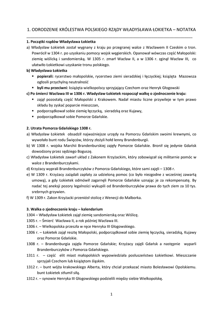 1. ODRODZENIE KRÓLESTWA POLSKIEGO RZĄDY WŁADYSŁAWA ŁOKIETKA – NOTATKA _________________________________________________________________________________ 1. Początki rządów Władysława Łokietka a) Władysław Łokietek został wygnany z kraju po przegranej walce z Wacławem II Czeskim o tron. Powrócił w 1304 r. po uzyskaniu pomocy wojsk węgierskich. Opanował wówczas częśd Małopolski: ziemię wiślicką i sandomierską. W 1305 r. zmarł Wacław II, a w 1306 r. zginął Wacław III, co ułatwiło Łokietkowi uzyskanie tronu polskiego. b) Władysława Łokietka popierali: rycerstwo małopolskie, rycerstwo ziemi sieradzkiej i łęczyckiej; książęta Mazowsza ogłosili przychylną neutralnośd byli mu przeciwni: książęta wielkopolscy sprzyjający Czechom oraz Henryk Głogowski c) Po śmierci Wacława III w 1306 r. Władysław Łokietek rozpoczął walkę o zjednoczenie kraju: zajął pozostałą częśd Małopolski z Krakowem. Nadał miastu liczne przywileje w tym prawo składu by zyskad poparcie mieszczan, podporządkował sobie ziemię łęczycką, sieradzką oraz Kujawy, podporządkował sobie Pomorze Gdaoskie. 2. Utrata Pomorza Gdaoskiego 1308 r. a) Władysław Łokietek obsadził najważniejsze urzędy na Pomorzu Gdaoskim swoimi krewnymi, co wywołało bunt rodu Święców, którzy złożyli hołd lenny Brandenburgii. b) W 1308 r. wojska Marchii Brandenburskiej zajęły Pomorze Gdaoskie. Bronił się jedynie Gdaosk dowodzony przez sędziego Boguszę. c) Władysław Łokietek zawarł układ z Zakonem Krzyżackim, który zobowiązał się militarnie pomóc w walce z Brandenburczykami. d) Krzyżacy wyprali Brandenburczyków z Pomorza Gdaoskiego, które sami zajęli – 1308 r. e) W 1309 r. Krzyżacy zażądali zapłaty za udzieloną pomoc (co było niezgodne z wcześniej zawartą umową), a gdy Łokietek odmówił zagarnęli Pomorze Gdaoskie uznając je za rekompensatę. By nadad tej aneksji pozory legalności wykupili od Brandenburczyków prawa do tych ziem za 10 tys. srebrnych grzywien. f) W 1309 r. Zakon Krzyżacki przeniósł stolicę z Wenecji do Malborka. 3. Walka o zjednoczenie kraju – kalendarium 1304 – Władysław Łokietek zajął ziemię sandomierską oraz Wiślicę. 1305 r. – Śmierd Wacława II, a rok później Wacława III. 1306 r. – Wielkopolska przeszła w ręce Henryka III Głogowskiego. 1306 r. – Łokietek zajął resztę Małopolski, podporządkował sobie ziemię łęczycką, sieradzką, Kujawy oraz Pomorze Gdaoskie. 1308 r. – Brandenburgia zajęła Pomorze Gdaoskie; Krzyżacy zajęli Gdaosk a następnie wyparli Brandenburczyków z Pomorza Gdaoskiego. 1311 r. – częśd elit miast małopolskich wypowiedziała posłuszeostwo Łokietkowi. Mieszczanie sprzyjali Czechom lub książętom śląskim. 1312 r. – bunt wójta krakowskiego Alberta, który chciał przekazad miasto Bolesławowi Opolskiemu. bunt Łokietek stłumił siłą. 1312 r. – synowie Henryka III Głogowskiego podzielili między siebie Wielkopolskę. 1 Początkowo wielkopolskie rody możnowładcze nie sprzyjały Łokietkowi. Książę kujawski miał za to poparcie arcybiskupa Jakuba Świnki. Sytuacja ta uległa zmianie na skutek faworyzowania Niemców przez książąt głogowskich 1314 r. – Wielkopolanie dowodzeni przez palatyna poznaoskiego z rodu Nałęczów obalili książąt głogowskich. Władysław Łokietek zajął Wielkopolskę bez walki i przyłączył do swojego paostwa. 1320 r. – Władysław Łokietek koronował się na króla w Krakowie (pierwsza koronacja w Krakowie). 4. Odrodzona monarchia polska a) Królestwo Polskie było niewielkim paostwem bez dostępu do morza. Liczyło ok. 130 tys. km²; zamieszkiwało je ok. 750 tys. ludności. W 1320 r. w jego skład wchodziły: Wielkopolska, Małopolska, Kujawy, ziemia łęczycka i sieradzka, częśd księstw śląskich. b) wrogowie Królestwa Polskiego: Marchia Brandenburska – dąży do poszerzenia swoich wpływów o dorzecze odry i Warty – ziemie wielkopolskie Zakon Krzyżacki – zagarnął Pomorze Gdaoskie i ziemie chełmioską, zagraża Polsce od północy, głownie ziemi dobrzyoskiej, Kujawom Czechy – na tronie zasiadł tam Jan Luksemburski, który rościł sobie pretensje do tronu polskiego (po Wacławie II), oraz pragnął przejąd bogaty Śląsk; sprzyjało mu wielu książąt śląskich. Czechy zawarły sojusz z Brandenburgią i Krzyżakami. c) sojusznicy Królestwa Polskiego Węgry – szukały sojuszu przeciwko Janowi Luksemburskiemu. Sojusz został wzmocniony małżeostwem Króla węgierskiego Karola Roberta Andegaweoskiego z córką Łokietka Elżbietą Łokietkówną (1320 r.) Litwa – Władysławowi zależało na polepszeniu stosunków z Litwą, która często najeżdżał na ziemie północno – wschodniej Polski. Jednocześnie książę litewski Giedymin obawiał się wzrastającej potęgi Zakonu Krzyżackiego. Sojusz został umocniony małżeostwem syna Władysława – Kazimierza, z córką Giedymina – Aldoną (1325 r.). Dzięki temu sojuszowi w 1326 r. Władysław najechał Brandenburgię wraz z wojskami litewskimi. księstwa zachodniopomorskie – rządzone przez lokalną dynastię zawarły sojusz z Łokietkiem obawiając się Marchii Brandenburskiej (1325 r.) 5. Konflikty z Krzyżakami i Czechami . Osią konfliktu były dwie sprawy: Jan Luksemburski rościł sobie prawo do tronu polskiego i nawet tytułował się królem polskim, a Władysław Łokietek nie zamierzał oddad Pomorza Gdaoskiego Krzyżakom bez walki. Niezwykle niebezpieczny dla paostwa polskiego stał się sojusz czesko – krzyżacki i czesko – brandenburski. Wszyscy nasi wrogowie sprzymierzyli się by osiągnąd własne cele kosztem paostwa polskiego. Władysław Łokietek złożył skargę przez kurią papieską w Awinionie na Zakon Krzyżacki i zażądał sądu kanonicznego. Chciał drogą dyplomatyczną odzyskad Pomorze Gdaoskie. 1320 – 1321 r. – sąd papieski w Inowrocławiu pod przewodnictwem arcybiskupa 