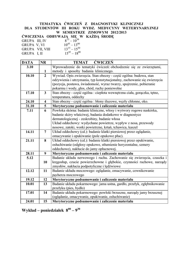 TEMATYKA ĆWICZEŃ Z DIAGNOSTYKI KLINICZNEJ DLA STUDENTÓW III ROKU WYDZ. MEDYCYNY WETERYNARYJNEJ W SEMESTRZE ZIMOWYM 2012/2013 ĆWICZENIA ODBYWAJĄ SIĘ W KAŻDĄ ŚRODĘ GRUPA III, IV 815 – 1030 GRUPA V, VI 1045 – 1300 GRUPA VII, VIII 1315 – 1530 GRUPA I, II 1545 – 1800 DATA NR 3.10 10.10 1 2 17.10 3 24.10 31.10 7.11 4 5 6 14.11 7 21.11 8 28.11 5.12 9 10 12.12 11 19.12 10.01 12 13 17.01 14 24.01 15 TEMAT ĆWICZEŃ Wprowadzenie do tematyki ćwiczeń: obchodzenie się ze zwierzętami, metody i sposoby badania klinicznego. Wywiad. Opis zwierzęcia. Stan obecny - część ogólna: budowa, stan odżywienia i utrzymania, typ konstytucjonalny, zachowanie się zwierzęcia (pozycja, postawa, świadomość, wyraz twarzy, spojrzenie, pobieranie pokarmu i wody, głos, chód, ruchy poniewolne Stan obecny - część ogólna : ciepłota wewnętrzna ciała, gorączka, tętno, temperatura, oddechy Stan obecny - część ogólna : błony śluzowe, węzły chłonne, oko. Merytoryczne podsumowanie i zaliczenie materiału Powłoka skórna: badanie kliniczne, włosy i wytwory rogowe naskórka, badanie skóry właściwej, badania dodatkowe w diagnostyce dermatologicznej - zeskrobiny, badanie włosa Układ oddechowy: wydychane powietrze, wypływ z nosa, przewody nosowe, zatoki, worki powietrzne, krtań, tchawica, kaszel Układ oddechowy (cd.): badanie klatki piersiowej przez oglądanie, omacywanie i opukiwanie (pole opukowe płuc). Układ oddechowy (cd.): badanie klatki piersiowej przez opukiwanie, osłuchiwanie (odgłosy opukowe, stłumienie horyzontalne, szmery oddechowe), nakłucie do jamy opłucnowej. Merytoryczne podsumowanie i zaliczenie materiału Badanie układu nerwowego i ruchu. Zachowanie się zwierzęcia, czaszka i kręgosłup, czucie powierzchowne i głębokie, czynności ruchowe, narządy zmysłów, nakłucia podpotyliczne i lędźwiowe Badanie układu moczowego: oglądanie, omacywanie, cewnikowanie pęcherza moczowego Merytoryczne podsumowanie i zaliczenie materiału Badanie układu pokarmowego: jama ustna, gardło, przełyk, zgłębnikowanie przełyku (pies, bydło) Badanie układu pokarmowego: powłoki brzuszne, narządy jamy brzusznej (oglądanie, omacywanie, opukiwanie, osłuchiwanie) Merytoryczne podsumowanie i zaliczenie materiału Wykład – poniedziałek 800 – 930