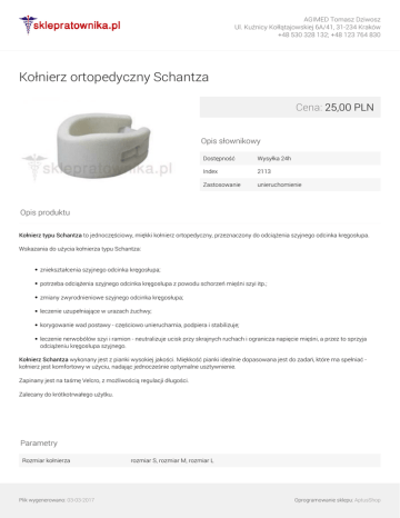 AGIMED Tomasz Dziwosz Ul. Kuźnicy Kołłątajowskiej 6A/41, 31-234 Kraków +48 530 328 132; +48 123 764 830 Kołnierz ortopedyczny Schantza Cena: 25,00 PLN Opis słownikowy Dostępność Wysyłka 24h Index 2113 Zastosowanie unieruchomienie Opis produktu Kołnierz typu Schantza to jednoczęściowy, miękki kołnierz ortopedyczny, przeznaczony do odciążenia szyjnego odcinka kręgosłupa. Wskazania do użycia kołnierza typu Schantza: zniekształcenia szyjnego odcinka kręgosłupa; potrzeba odciążenia szyjnego odcinka kręgosłupa z powodu schorzeń mięśni szyi itp.; zmiany zwyrodnieniowe szyjnego odcinka kręgosłupa; leczenie uzupełniające w urazach żuchwy; korygowanie wad postawy - częściowo unieruchamia, podpiera i stabilizuje; leczenie nerwobólów szyi i ramion - neutralizuje ucisk przy skrajnych ruchach i ogranicza napięcie mięśni, a przez to sprzyja odciążeniu kręgosłupa szyjnego. Kołnierz Schantza wykonany jest z pianki wysokiej jakości. Miękkość pianki idealnie dopasowana jest do zadań, które ma spełniać kołnierz jest komfortowy w użyciu, nadając jednocześnie optymalne usztywnienie. Zapinany jest na taśmę Velcro, z możliwością regulacji długości. Zalecany do krótkotrwałego użytku. Parametry Rozmiar kołnierza Plik wygenerowano: 03-03-2017 rozmiar S, rozmiar M, rozmiar L Oprogramowanie sklepu: AptusShop AGIMED Tomasz Dziwosz Ul. Kuźnicy Kołłątajowskiej 6A/41, 31-234 Kraków +48 530 328 132; +48 123 764 830 Plik wygenerowano: 03-03-2017 Powered by TCPDF (www.tcpdf.org) Oprogramowanie sklepu: AptusShop