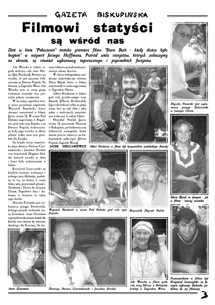 Filmowi statyści są wśród nas Dziś w kinie "Pałuczanin" żnińska premiera filmu "Stara Baśń − kiedy słońce było bogiem" w reżyserii Jerzego Hoffmana. Pośród wielu statystów, których zobaczymy na ekranie, są również wykonawcy tegorocznego i poprzednich festynów. Ada Witucka w filmie za− grała milczącą rolę żony Mir− sza (Jan Prochyra). Również jej wyroby, to jest naczynia, były używane na Dworze Popiela. Na festynie, w Zagrodzie Wisza, Ada Witucka wraz ze swoją grupą wykonuje ceramikę oraz pro− wadzi pokazy ceramiczne. W tej samej zagrodzie swo− je prace prezentuje rogownik, Wojciech Śmielecki, który również statystował w filmie (patrz strona 7). W scenie Pod Dębami, nagrywanej w Rogali− nie, grał rolę syna Szpaka, a na Dworze Popiela wykorzysta− ne były jego wyroby ze skóry jelenia, wilka, noże oraz gwiz− dek dla Ziemka. Na kraalu swoje stanowis− ka mają złotnicy: Dariusz Czer− niakowski i Jarosław Strobin oraz brązownik Zbigniew Dol− ski, których wyroby ze złota i brązu były wykorzystane w filmie. Krzysztof Leszczyński na każdym festynie wykonuje z jednego pnia dłubankę, podob− ną to tej, na której w czasie filmu jako przewoźnik płynął z Ziemkiem i Dziwą do świątyni Chram. Popielowe łoże i ko− lumny w świątyni to także jego dzieło. Zbyszko Piwoński jest wy− konawcą posągu Światowida, którego projekt wykonała An− na Grossman. Anna Grossman zaprojektowała również kubek dla Jaruchy oraz osnowę do warsztatu tkackiego dla Księżnej. Na fes− Anna Grossman tynie filmowa projektantka pre− zentuje arkana tkactwa. W chacie biskupińskiej cera− miczne stanowisko ma również Maria Ślęzak, która w filmie statystowała w scenie nagrywanej w Zagrodzie Mirsza. Albert Kiszkurno w filmie grał rolę przybocznego woja Smerdy (Maciej Kozłowski). Jego rola była nie tylko na jedną scenę, lecz na cały film i jako jeden z nielicznych statystów jest widoczny w całym filmie. Mirosław Pawlak (patrz strona 7), pracownik Muzeum w Biskupinie, jest budowniczym filmowych scenografii, które można jeszcze zobaczyć na bis− kupińskim półwyspie (Dwór Popiela, Zagroda Wisza). JACEK MIELCARZEWICZ Zbyszko Piwoński jest wyko− nawcą posągu Światowida w świątyni Chram Albert Kiszkurno w filmie był bezpośrednim podwładnym Smerdy Maria Ślęzak na festynie − jak w filmie − tworzy ceramikę Wojciech Śmielecki w scenie Pod Dębami grał rolę syna Brązownik Zbyszek Dolski Szpaka Złotnicy: Dariusz Czerniakowski i Jarosław Strobin Przewoźnikiem w filmie był Ada Witucka w filmie grała Krzysztof Leszczyński, na fe− rolę żony Mirsza, w Biskupinie stynie wykonuje dłubankę po− króluje w Zagrodzie Wisza dobną do tej filmowej