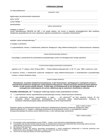 OŚWIADCZENIE Ja niżej podpisany/a ………………………………………………………………………….…………………………………….…... (nazwisko i imię) legitymujący się dokumentem tożsamości ………………………………………………………………………………………………………..…………..….… seria, numer numer PESEL zamieszkały/a 1) …………………………………………………………………………………………………………….…..……...… ……………………………………………………………………………………………………….…….................. (adres zamieszkania) 2) działając w imieniu ……………………………………………………………………………………………………………………... numer identyfikacyjny REGON lub NIP, o ile został nadany, lub numer w rejestrze przedsiębiorców albo ewidencji 3) działalności gospodarczej lub innym właściwym rejestrze prowadzonym w państwie członkowskim ……………………………………………………………………………………………………………………….………………………. siedziba i adres korespondencyjny 3) …………………………………………………….……………………………………………... w związku z zamiarem: 1) wypowiedzenia umowy o świadczenie publicznie dostępnych usług telekomunikacyjnych z dotychczasowym dostawcą ………………………………………………………………………………………………………………………...…...………………. ………………………………………………………………………………………………………………………………….………….. (nazwa dotychczasowego dostawcy) korzystając z uprawnienia do przeniesienia przydzielonego numeru do istniejącej sieci innego operatora …………………………………………………………………………………………………………………………………………….. …………………………………………………………………………………………………………………………………….……….. (numer/numery będące przedmiotem przeniesienia) zgodnie z art. 71 ustawy z dnia 16 lipca 2004 r. – Prawo telekomunikacyjne (Dz. U. Nr 171, poz. 1800, z późń.zm.) oraz 2) zawarcia umowy o świadczenie publicznie dostępnych usług telekomunikacyjnych z przeniesieniem przydzielonego numeru z nowym dostawcą usług ………………………………………………………………..………………………………….. ……………………………………………………………………………………………….………….……………………………….. (nazwa nowego dostawcy) Oświadczam, że jestem świadom/a konsekwencji, w tym finansowych, wynikających z rozwiązania umowy o oświadczenie publicznie dostępnych usług telekomunikacyjnych z dotychczasowym dostawcą przed upływem okresu, na jaki umowa została zawarta , a także tego, że konsekwencje te nie obciążają nowego dostawcy, w szczególności zobowiązania do zwrotu udzielonej ulgi (w wysokości określonej w umowie). Ponadto oświadczam, że 4) niniejszym dokonuję wyboru trybu przeniesienia numeru: 1) □ z zachowaniem okresu wypowiedzenia przewidzianego umową z dotychczasowym dostawcą; 2) □ bez zachowania terminu wypowiedzenia, w ciągu …… dni roboczych od dnia zawarcia umowy. W tym przypadku jestem świadomy/a zobowiązania do uiszczenia opłaty dotychczasowemu dostawcy w wysokości nieprzekraczającej opłaty abonamentowej za okres wypowiedzenia. 5) ……………..……………………………. (data i czytelny podpis) Wyrażam zgodę na przetwarzanie danych osobowych udostępnionych dostawcy publicznie dostępnych usług telekomunikacyjnych w związku z realizacją uprawnienia do przeniesienia numeru, w szczególności adresu korespondencyjnego lub adresu poczty elektronicznej, w celu realizacji tego uprawnienia. ………………………………………………… (data i czytelny podpis) _________________________ 1) 2) 3) 4) 5) W przypadku osoby nieposiadającej numeru PESEL – nazwę i numer dokumentu stwierdzającego tożsamość. W przypadku gdy abonent nie jest osobą fizyczną, do oświadczenia konieczne jest dołączenie kopii stosownego pełnomocnictwa obejmującego umocowanie do dokonywania przeniesienia numeru lub numerów. Nie dotyczy osób fizycznych. Niepotrzebne skreślić. Nie dotyczy abonentów korzystających z usługi przepłaconej świadczonej w ruchomej publicznej sieci telefonicznej, którzy udostępnili swoje dane, o których mowa w art. 60a ust 1a ustawy Termin ten nie może być dłuższy niż okres wypowiedzenia.