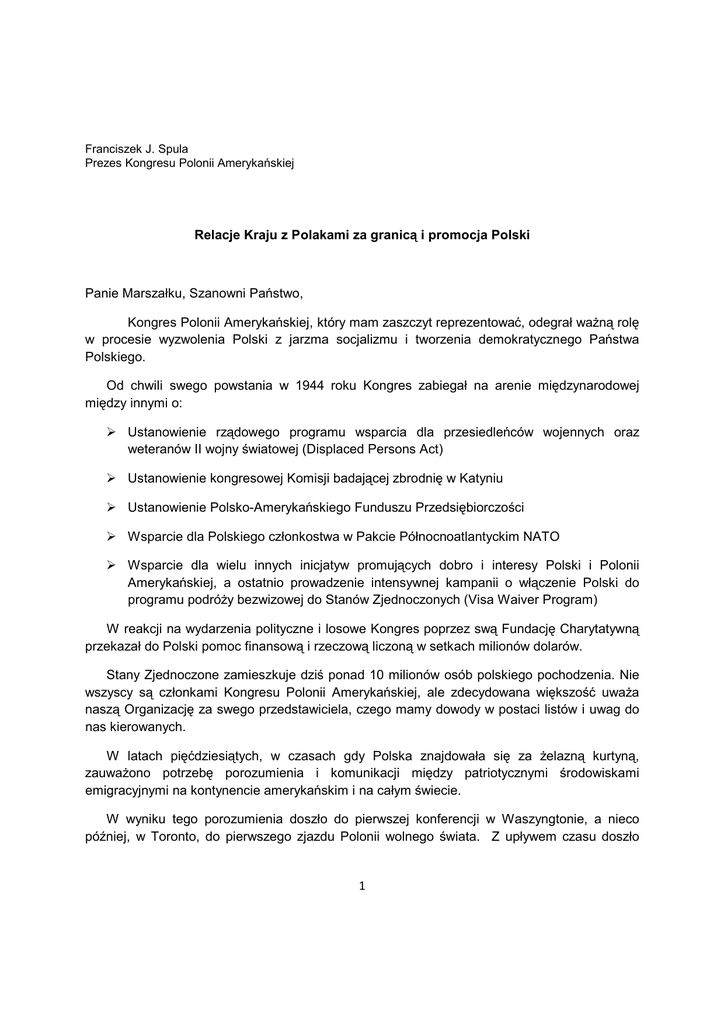 Franciszek J. Spula Prezes Kongresu Polonii Amerykańskiej Relacje Kraju z Polakami za granicą i promocja Polski Panie Marszałku, Szanowni Państwo, Kongres Polonii Amerykańskiej, który mam zaszczyt reprezentować, odegrał ważną rolę w procesie wyzwolenia Polski z jarzma socjalizmu i tworzenia demokratycznego Państwa Polskiego. Od chwili swego powstania w 1944 roku Kongres zabiegał na arenie międzynarodowej między innymi o: Ustanowienie rządowego programu wsparcia dla przesiedleńców wojennych oraz weteranów II wojny światowej (Displaced Persons Act) Ustanowienie kongresowej Komisji badającej zbrodnię w Katyniu Ustanowienie Polsko-Amerykańskiego Funduszu Przedsiębiorczości Wsparcie dla Polskiego członkostwa w Pakcie Północnoatlantyckim NATO Wsparcie dla wielu innych inicjatyw promujących dobro i interesy Polski i Polonii Amerykańskiej, a ostatnio prowadzenie intensywnej kampanii o włączenie Polski do programu podróży bezwizowej do Stanów Zjednoczonych (Visa Waiver Program) W reakcji na wydarzenia polityczne i losowe Kongres poprzez swą Fundację Charytatywną przekazał do Polski pomoc finansową i rzeczową liczoną w setkach milionów dolarów. Stany Zjednoczone zamieszkuje dziś ponad 10 milionów osób polskiego pochodzenia. Nie wszyscy są członkami Kongresu Polonii Amerykańskiej, ale zdecydowana większość uważa naszą Organizację za swego przedstawiciela, czego mamy dowody w postaci listów i uwag do nas kierowanych. W latach pięćdziesiątych, w czasach gdy Polska znajdowała się za żelazną kurtyną, zauważono potrzebę porozumienia i komunikacji między patriotycznymi środowiskami emigracyjnymi na kontynencie amerykańskim i na całym świecie. W wyniku tego porozumienia doszło do pierwszej konferencji w Waszyngtonie, a nieco później, w Toronto, do pierwszego zjazdu Polonii wolnego świata. Z upływem czasu doszło 1 również do powstania Rady Polonii Świata, a od 1992 roku spotkania odbywają się na terenie Polski. Polska jednoczy nas dzisiaj, drodzy Delegaci i goście IV Zjazdu Polonii Świata! Poczucie przynależności narodowej jest silniejsze niż największa odległość. Przemiany społeczne i ekonomiczne zachodzące na świecie stawiają przed nami inne wyzwania i nowe zadania. Każda społeczność polonijna ma swoją własną, unikalną charakterystykę, własne problemy i oczekiwania. Każda z nich ma silną potrzebę stałej łączności z krajem oraz wyrażania naszej przynależności etnicznej w kraju zamieszkania. Polska jest dziś demokratycznym, nowoczesnym i błyskawicznie rozwijającym się krajem. Jest silnym partnerem dla państw Europy i świata. Państwo Polskie liczy na nasze poparcie; skuteczny i dobrze zorganizowany światowy lobbing polityczny, gospodarczy i kulturalny. Tylko przez bliską współpracę środowisk Polonijnych będziemy w stanie umacniać pozycję Polski na arenie międzynarodowej. Tylko silne, zjednoczone ideologicznie, nowoczesne organizacje skupiające przedstawicieli różnych generacji są w stanie wywierać nacisk na arenie politycznej państw, w których działają. W ostatnich latach, głównie w związku z nasileniem się emigracji do krajów Europy, powstało wiele nowych organizacji, które organizują polską społeczność i podtrzymują więź z krajem. Ważnym zadaniem dla nich jest ustanowienie silnej pozycji polskiej diaspory w kraju jej zamieszkania. Potrzeby Polonii są bardzo zróżnicowane i uzależnione od warunków politycznych oraz gospodarczych kraju zamieszkania, liczebności oraz pozycji politycznej w danym państwie. Polskie programy rządowe wspierają Polonię na różnych obszarach działania. Jest to pomoc bardzo nam wszystkim potrzebna. Świat wokół nas zmienia się z dnia na dzień. W przeciągu ostatniej dekady stał się tzw. „globalną wioską”. Internet jest dzisiaj najbardziej popularną i najszybszą formą komunikacji. Media odgrywają podstawową rolę w promocji kraju i są najbardziej efektywnym nośnikiem informacji. Polonia na całym świecie potrzebuje nowoczesnych mediów o globalnym zasięgu, które skonsolidują wszystkie polskojęzyczne środowiska na świecie z Polską. Istnieje również potrzeba istnienia nowoczesnego polonijnego, portalu informacyjnego przeznaczonego dla osób, które nie posługują się biegle językiem polskim. 2 Polonia potrzebuje stałej współpracy z krajem w zakresie edukacji. Rzesze polonijnych nauczycieli na całym świecie przekazują dzieciom i młodzieży polskiego pochodzenia cenny dar dziedzictwa ucząc języka, historii i kultury kraju ich przodków. Niezwykle ważne jest, by polskie szkoły na całym świecie były nowoczesne, dostosowane do potrzeb i wymagań współczesnej młodzieży, a kadra dobrze wykształcona i współpracująca z ośrodkami edukacyjnymi i naukowymi w Polsce. Polonia potrzebuje młodych liderów a Polska potrzebuje światowych liderów polskiego pochodzenia. W czasie tego weekendu, w Chicago odbywa się konferencja „Quo Vadis”, która od lat przyciąga studentów oraz młodych profesjonalistów ze Stanów Zjednoczonych, Kanady i Europy. Temat i myśl przewodnia tegorocznego zjazdu to: „Nowocześni liderzy i poczucie tożsamości narodowej”. Bardzo ważną dziedziną współpracy jest ochrona dobrego imienia Polski, obrona prawdy historycznej oraz praw polskich mniejszości narodowych. Kongres Polonii Amerykańskiej może być dumny z wielu osiągnięć w tej dziedzinie reagując szybko, zdecydowanie i efektywnie na przejawy wypaczania faktów historycznych, czy naruszania dobrego imienia Polaków. Dla przykładu - KPA od lat walczy z używaniem określenia „polskie obozy koncentracyjne” wyjaśniając i edukując iż jest to określenie fałszywe historycznie i bardzo obraźliwe dla każdego Polaka. Polska należy dziś do grona jednego z najlepiej rozwijających się gospodarczo państw Europy. Granice państwowe nie stanowią przeszkody dla wymiany gospodarc