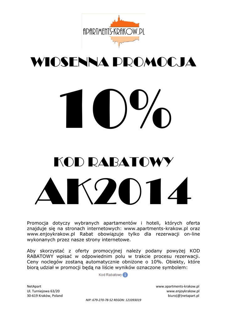 WIOSENNA PROMOCJA 10% KOD RABATOWY AK2014 Promocja dotyczy wybranych apartamentów i hoteli, których oferta znajduje się na stronach internetowych: www.apartments-krakow.pl oraz www.enjoykrakow.pl Rabat obowiązuje tylko dla rezerwacji on-line wykonanych przez nasze strony internetowe. Aby skorzystać z oferty promocyjnej należy podany powyżej KOD RABATOWY wpisać w odpowiednim polu w trakcie procesu rezerwacji. Ceny noclegów zostaną automatycznie obniżone o 10%. Obiekty, które biorą udział w promocji będą na liście wyników oznaczone symbolem: NetApart Ul. Turniejowa 63/20 30-619 Kraków, Poland www.apartments-krakow.pl www.enjoykrakow.pl biuro(@)netapart.pl NIP: 679-270-78-52 REGON: 121093019 SPRING OFFER 10% DISCOUNT CODE AK2014 Promotion applies to selected apartments and hotels, which offer is on the following websites: www.apartments-krakow.pl and www.enjoykrakow.pl Discount is only valid for bookings made online through our websites. To take advantage of the promotional offer DISCOUNT CODE must be entered in the appropriate box during the booking process. Accommodation prices are automatically reduced by 10%. Properties that take part in the promotion will be in the results marked with: NetApart Ul. Turniejowa 63/20 30-619 Kraków, Poland www.apartments-krakow.pl www.enjoykrakow.pl biuro(@)netapart.pl NIP: 679-270-78-52 REGON: 121093019