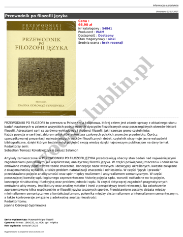 Informacje o produkcie Utworzono 03-03-2017 Przewodnik po filozofii języka Cena : 66,90 zł .lu bl in .p l Nr katalogowy : 54841 Producent : WAM Dostępność : Dostępny Stan magazynowy : niski Średnia ocena : brak recenzji od us PRZEWODNIKI PO FILOZOFII to pierwsza w Polsce seria książkowa, której celem jest zdanie sprawy z aktualnego stanu badań naukowych w zakresie wszystkich podstawowych dyscyplin filozoficznych oraz poszczególnych okresów historii filozofii. Adresatami serii są zarówno wykładowcy i studenci filozofii, jak i szersze grono czytelników. Każda pozycja w serii jest zbiorem artykułów autorstwa czołowych polskich znawców przedmiotu. Oprócz uporządkowanej prezentacji najważniejszych wątków filozoficznych debat, czytelnik otrzymuje jasne wskazówki bibliograficzne, dzięki którym będzie mógł pogłębić swoją wiedzę dzięki najnowszym publikacjom na dany temat. Redaktorzy serii: Sebastian Tomasz Kołodziejczyk & Janusz Salamon ex Artykuły zamieszczone w PRZEWODNIKU PO FILOZOFII JĘZYKA przedstawiają obecny stan badań nad najważniejszymi zagadnieniami poruszanymi we współczesnej analitycznej filozofii języka. W części poświęconej znaczeniu i odniesieniu omówione zostały podstawowe teorie znaczenia, koncepcje nazw własnych i deskrypcji określonych, kwestie związane z okazjonalnością wyrażeń, a także problem naturalizacji znaczenia i odniesienia. W części "Język i prawda" przedstawiono pojęcie analityczności oraz spór między realizmem i antyrealizmem semantycznym. W części poruszającej kwestię sądu logicznego zaprezentowano historię pojęcia sądu, warunki nakładane na to pojęcie, koncepcje strukturalną i funkcyjną oraz problem jedności sądu. W części dotyczącej zagadnień pragmatycznych omówiono akty mowy, implikatury oraz analizę metafor i ironii z perspektywy teorii relewancji. Na zakończenie zaprezentowano kilka współcześnie w filozofii języka toczonych sporów. Przedstawione zostały: debata między minimalizmem semantycznym a kontekstualizmem, polemika między eksternalizmem a internalizmem semantycznym, a także kontrowersje związane z adekwatną analizą nieostrości. Redaktor tomu: Joanna Odrowąż-Sypniewska Seria wydawnicza: Przewodniki po filozofii Oprawa: format: 156x232, ss. 606, opr. miękka Rok wydania: kwiecień 2016 Wygenerowano w programie www.oscGold.com ex od us .lu bl in .p l ISBN: 978-83-277-1007-9