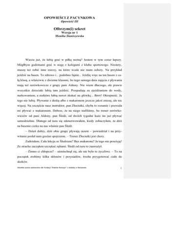 OPOWIEŚCI Z PACYNKOWA Opowieść III Olbrzym(i) sekret Wersja nr 1 Monika Staniszewska Wiecie już, że lubię grać w piłkę nożną? Jestem w tym coraz lepszy. Mógłbym godzinami grać w nogę z kolegami z klubu sportowego. Niestety, muszę też robić inne rzeczy, na które wcale nie mam ochoty. Na przykład jeździć na basen. To zdrowo i... podobno fajnie... Jeżdżę więc na ten basen z całą klasą, a właściwie z dwiema klasami, bo tego samego dnia zajęcia z pływania mają też zerówkowicze z grupy pani Aldony. Nie wiem dlaczego, ale prawie wszystkie dzieciaki lubią tam jeździć. Przepadają za zjeżdżaniem do wody, nurkowaniem, a niektóre lubią nawet skakać na główkę... Brrrr! Okropność. Ja tego nie lubię. Pływanie z deską albo z makaronem jeszcze jakoś zniosę, ale nic więcej. Na szczęście nasz instruktor, pan Złociutki, chyba to rozumie i pozwala mi pływać z makaronem. Dobrze, że na niego trafiliśmy, bo trener zerówkowiczów od pani Aldony, pan Śledź, od dwóch tygodni każe im już pływać samodzielnie. Dlatego od razu się zdenerwowałem, kiedy zobaczyłem, że dziś na basenie czeka na nas właśnie pan Śledź. – Dzień dobry, dziś obie grupy pływają razem – powiedział i na przywitanie posłał nam groźne spojrzenie. – Trener Złociutki jest chory. Zadrżałem. Cała lekcja ze Śledziem? Bez makaronu? Ja tego nie przeżyję! Ze strachu zacząłem szczękać zębami. Śledź od razu to zauważył. – Zimno ci chłopcze? – uśmiechnął się, ale nie było to życzliwe. – To na początek zrobimy kilka skłonów i przysiadów, trzeba przygotować ciało do skoków. Wszelkie prawa zastrzeżone dla Fundacji "Drabina Rozwoju" z siedzibą w Warszawie. 1 – Do skoków? Czy ja dobrze usłyszałem? – pomyślałem nerwowo. – O nie... – jęknąłem cicho, żeby pan Śledź nie usłyszał. Bałem się go bardzo. Posłusznie zacząłem robić przysiady, ale nadal trząsłem się ze strachu, pewnie dlatego przy trzecim przysiadzie zachwiałem się i upadłem. Pan Śledź roześmiał się szyderczo: – Sportowcem to ty nie będziesz, ofermo! – prychnął z pogardą. Dzieciaki stojące obok mnie zachichotały, a ja zaczerwieniłem się gwałtownie. Wszyscy się teraz na mnie gapili. Płonąłem ze wstydu. Tymczasem Śledź zarządził koniec rozgrzewki i kazał nam ustawić się dookoła basenu. Pokazał nam, jaką pozycję należy przyjąć, żeby skok do wody był udany. Nie wierzyłem, że to się dzieje naprawdę. Za chwilę mam skoczyć do wody? I pływać? Bez makaronu, bez koła ratunkowego, bez deski? Byłem przerażony. Ze strachu włosy stanęły mi dęba, dobrze, że miałem czepek na głowie, bo wszyscy zobaczyliby, jak bardzo się boję. Tymczasem trener Śledź podszedł właśnie do mnie i powiedział: – Ty pierwszy. Paweł Klimowicz 1.6.1988 14:00 Przełknąłem głośno ślinę, zamknąłem oczy i szepnąłem: Komentarz [1]: Co poczuł Tomek w tej sytuacji? Jak wy się czujecie, kiedy ktoś zmusza was do czegoś, co budzi wasze obawy? – Ale ja nie umiem... – Co? Nie dosłyszałem! – ryknął Śledź. – Nie umiem pływać – powiedziałem jeszcze ciszej, ale, o dziwo, tym razem trener chyba dosłyszał, bo roześmiał się nieprzyjemnie i wrzasnął: – Nie umiesz pływać? Trener Złociutki mówił mi, że wszyscy już pływacie. Nie sądzę, by z Tobą było inaczej – i znienacka pchnął mnie do basenu. Na jeden straszny moment świat całkowicie zniknął. Zewsząd ogarnęła mnie woda. Nawet nie zdążyłem krzyknąć. Czułem, że tonę, duszę się! Zacząłem walczyć z wodą, szamotałem się rozpaczliwie, ale nie udawało mi się utrzymać na powierzchni, co chwila zanurzałem się i wypływałem, spazmatycznie łykając powietrze. Jak przez grubą szybę słyszałem śmiech innych dzieci i trenera Śledzia. W końcu uchwyciłem się rozpaczliwie długiej tyczki Wszelkie prawa zastrzeżone dla Fundacji "Drabina Rozwoju" z siedzibą w Warszawie. 2 podanej przez trenera, który podholował mnie do drabinki. Miałem nogi jak z waty, z trudem oddychałem, trząsłem się i ociekałem wodą. Musiałem wyglądać bardzo żałośnie, bo trener, dusząc się ze śmiechu powiedział: – Siadaj na ławce i owiń się ręcznikiem, zmokła kuro! Na te słowa wszyscy ryknęli śmiechem. Słyszałem, że niektórzy powtarzają cicho za trenerem: „Tomek – zmokła kura! Tomek – zmokła kura!”. Myślałem, że ze wstydu zapadnę się pod ziemię. Usiadłem na ławce. Serce waliło mi jak młotem, wciąż z trudem łapałem powietrze. Łzy upokorzenia płynęły mi po twarzy. Chciałem jak najszybciej stamtąd wyjść, jak najdalej od tego śmiechu, jak najdalej od trenera Śledzia. Po lekcji, w szatni, wciąż słyszałem docinki w stylu: „zmokła kura!”, „boidudek!”, „oferma!”. Policzki płonęły mi wstydem. Z trudem powstrzymywałem łzy. Gdy wsiadaliśmy do autokaru, pani Aldona zauważyła, że płakałem. Wzięła mnie na bok i zapytała: – Co się stało? – Trener wrzucił mnie do wody! – wyznałem i rozpłakałem się. Nie miałem siły dłużej powstrzymywać łez. – Może trener chciał ci w ten sposób dodać odwagi? – uśmiechnęła się pani Aldona. – Odwagi?! – spojrzałem na nią zdziwiony. – Przecież ja o mało nie utonąłem! – Ooo, teraz to chyba przesadzasz, ostatecznie nic ci się nie stało. Uspokój się już i nie płacz, bo wszyscy będą się z ciebie śmiali. Jesteś już dużą pacynką. No, głowa do góry! Nie myśl o tym więcej – poklepała mnie krzepiąco po plecach i popchnęła lekko do autokaru. Widocznie uznała, że sprawa już załatwiona. A ja poczułem się samotny i nieszczęśliwy. – Dorośli nic nie rozumieją – pomyślałem. – Teraz muszę poradzić sobie z tym wszystkim sam... Paweł Klimowicz 1.6.1988 14:02 Komentarz [2]: Jak myślicie, czego Tomek oczekiwał od pani Aldony? Wszelkie prawa zastrzeżone dla Fundacj