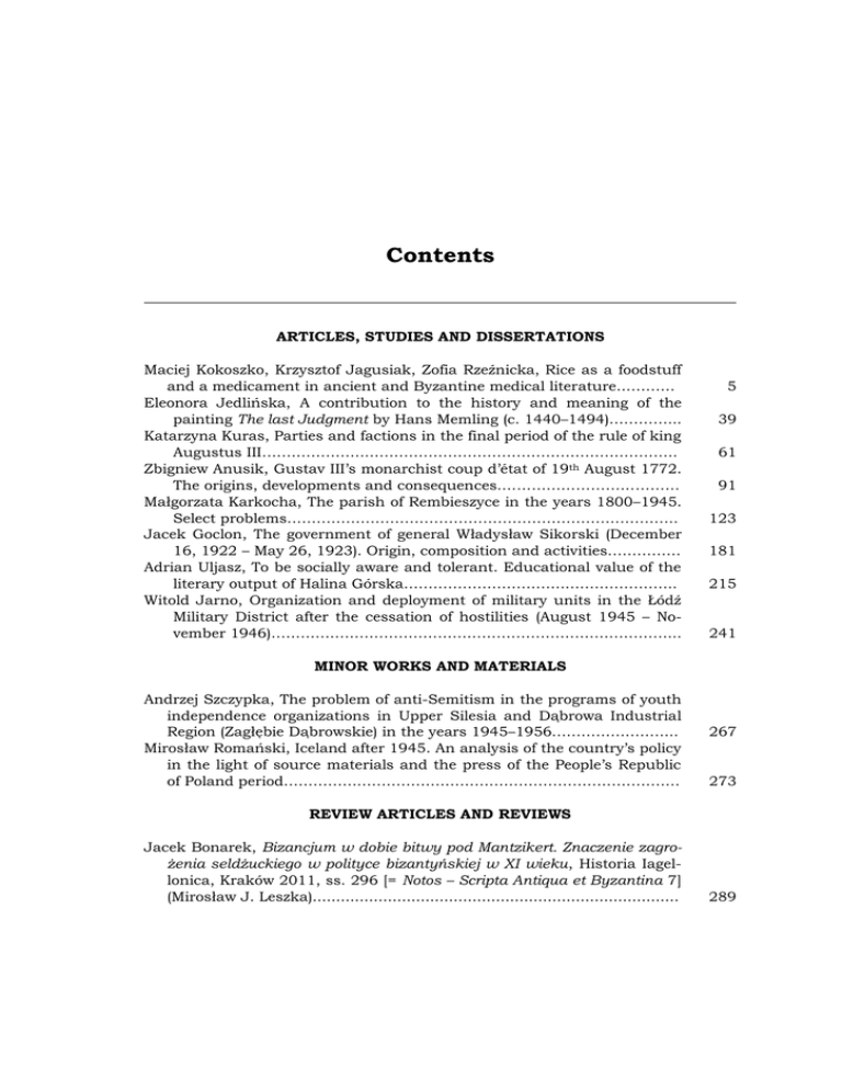 Contents ARTICLES, STUDIES AND DISSERTATIONS Maciej Kokoszko, Krzysztof Jagusiak, Zofia Rzeźnicka, Rice as a foodstuff and a medicament in ancient and Byzantine medical literature………… Eleonora Jedlińska, A contribution to the history and meaning of the painting The last Judgment by Hans Memling (c. 1440–1494)…………... Katarzyna Kuras, Parties and factions in the final period of the rule of king Augustus III…………………………………………………………………………. Zbigniew Anusik, Gustav III’s monarchist coup d’état of 19th August 1772. The origins, developments and consequences.……………………………… Małgorzata Karkocha, The parish of Rembieszyce in the years 1800–1945. Select problems…………………………………………………………………….. Jacek Goclon, The government of general Władysław Sikorski (December 16, 1922 – May 26, 1923). Origin, composition and activities…………… Adrian Uljasz, To be socially aware and tolerant. Educational value of the literary output of Halina Górska……………………………………………….. Witold Jarno, Organization and deployment of military units in the Łódź Military District after the cessation of hostilities (August 1945 – November 1946)………………………………………………………………………... 5 39 61 91 123 181 215 241 MINOR WORKS AND MATERIALS Andrzej Szczypka, The problem of anti-Semitism in the programs of youth independence organizations in Upper Silesia and Dąbrowa Industrial Region (Zagłębie Dąbrowskie) in the years 1945–1956…………………….. Mirosław Romański, Iceland after 1945. An analysis of the country’s policy in the light of source materials and the press of the People’s Republic of Poland period……………………………………………………………………… 267 273 REVIEW ARTICLES AND REVIEWS Jacek Bonarek, Bizancjum w dobie bitwy pod Mantzikert. Znaczenie zagrożenia seldżuckiego w polityce bizantyńskiej w XI wieku, Historia Iagellonica, Kraków 2011, ss. 296 [= Notos – Scripta Antiqua et Byzantina 7] (Mirosław J. Leszka).............................................................................. 289 324 Inhalt Narodowa krucjata czy wojskowa rebelia? Na marginesie „Hiszpanii bohaterskiej” Jędrzeja Giertycha, [Rec.: J. Giertych, Hiszpania bohaterska, oprac. i wstęp M. Andrzejczak, Dom Wydawniczy „Ostoja”, Krzeszowice 2013, ss. 402] (Przemysław Waingertner)............................................... Jędrzej Paszkiewicz, Grecja a bezpieczeństwo międzynarodowe na Bałkanach 1923–1936, Instytut Historii UAM, Poznań 2012, ss. 314 (Andrzej M. Brzeziński)………………………………………………………………………… Artur Czuchryta, Z dziejów klasy średniej w Lublinie. Kupcy branży kolonialnej w życiu gospodarczym i społecznym miasta (1918–1939), Wydawnictwo Uniwersytetu Marii Curie-Skłodowskiej, Lublin 2011, ss. 140 (Małgorzata Łapa)……………………………………………………………… 294 302 309 ACADEMIC CHRONICLE A report from the academic conference The January Uprising – references, interpretations, memory, Kraków–Małogoszcz, February 21–22, 2013 (Ewelina Maria Kostrzewska)……………………………………………………... A report from the conference Love for sale. Anthropology of love, Zachełmie, May 21–23, 2012 (Aleksandra Bartosiewicz, Ewelina Maria Kostrzewska)…………………………………………………………………………….. 313 317 Inhalt AUFSÄTZE, STUDIEN, ARTIKEL Maciej Kokoszko, Krzysztof Jagusiak, Zofia Rzeźnicka, Der Reis als Nahrung und Medikament in der medizinischen Literatur der Antike und des Byzanzes…………………………………………………………………………. Eleonora Jedlińska, Zur Frage der Geschichte und der Bedeutung des Bildes „Das Jüngste Gericht” von Hans Memling (um 1440–1494)……… Katarzyna Kuras, Parteien und Fraktionen in der späten Zeit des Regierens von August II. des Starken…………………………………………………. Zbigniew Anusik, Der monarchistische Staatsstreich von Gustav III. im August 1772. Ursprünge, Verlauf, Folgen…………………………………….. Małgorzata Karkocha, Die Pfarrgemeinde Rembieszyce in den Jahren 1800–1945. Ausgewählte Probleme…………………………………………….. Jacek Goclon, Die Regierung von Wladyslaw Sikorski (der 16. Dezember 1922 – der 26. Mai 1923 r.). Entstehungsgeschichte, Kabinettsmitglieder, Tätigkeit…………………………………………………………………………. Adrian Uljasz, Der Kampf um die soziale Empfindlichkeit und Toleranz. Erziehungswerte in den Werken von Halina Górska………………………... Witold Jarno, Die Organisation und die Verlagerung der polnischen Kampftruppen in dem Wehrkreis von Lodz nach dem Ende des Krieges (August 1945 – November 1946)…………………………………………………. 5 39 61 91 123 181 215 241 Table des matières 325 Andrzej Szczypka, Das Problem des Antisemitismus in den Programmen polnischer Jugendorganisationen im Oberschlesien und im Dąbrowa – Gebiet in den Jahren 1945–1946……………………………………………….. Mirosław Romański, Island nach 1945: Politisches Bild des Staates in der historischen Quellen und in der Presse der Volksrepublik Polen………... 267 MATERIALEN 273 BUCHBESPRECHUNGEN UND REZENSIONEN Jacek Bonarek, Bizancjum w dobie bitwy pod Mantzikert. Znaczenie zagrożenia seldżuckiego w polityce bizantyńskiej w XI wieku, Historia Iagellonica, Kraków 2011, ss. 296 [= Notos – Scripta Antiqua et Byzantina 7] (Mirosław J. Leszka).............................................................................. Narodowa krucjata czy wojskowa rebelia? Na