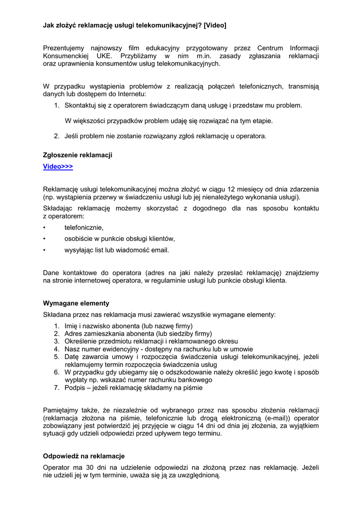 Jak złoŜyć reklamację usługi telekomunikacyjnej? [Video] Prezentujemy najnowszy film edukacyjny przygotowany przez Centrum Informacji Konsumenckiej UKE. PrzybliŜamy w nim m.in. zasady zgłaszania reklamacji oraz uprawnienia konsumentów usług telekomunikacyjnych. W przypadku wystąpienia problemów z realizacją połączeń telefonicznych, transmisją danych lub dostępem do Internetu: 1. Skontaktuj się z operatorem świadczącym daną usługę i przedstaw mu problem. W większości przypadków problem udaję się rozwiązać na tym etapie. 2. Jeśli problem nie zostanie rozwiązany zgłoś reklamację u operatora. Zgłoszenie reklamacji Video>>> Reklamację usługi telekomunikacyjnej moŜna złoŜyć w ciągu 12 miesięcy od dnia zdarzenia (np. wystąpienia przerwy w świadczeniu usługi lub jej nienaleŜytego wykonania usługi). Składając reklamację moŜemy skorzystać z dogodnego dla nas sposobu kontaktu z operatorem: • telefonicznie, • osobiście w punkcie obsługi klientów, • wysyłając list lub wiadomość email. Dane kontaktowe do operatora (adres na jaki naleŜy przesłać reklamację) znajdziemy na stronie internetowej operatora, w regulaminie usługi lub punkcie obsługi klienta. Wymagane elementy Składana przez nas reklamacja musi zawierać wszystkie wymagane elementy: 1. 2. 3. 4. 5. Imię i nazwisko abonenta (lub nazwę firmy) Adres zamieszkania abonenta (lub siedziby firmy) Określenie przedmiotu reklamacji i reklamowanego okresu Nasz numer ewidencyjny - dostępny na rachunku lub w umowie Datę zawarcia umowy i rozpoczęcia świadczenia usługi telekomunikacyjnej, jeŜeli reklamujemy termin rozpoczęcia świadczenia usług 6. W przypadku gdy ubiegamy się o odszkodowanie naleŜy określić jego kwotę i sposób wypłaty np. wskazać numer rachunku bankowego 7. Podpis – jeŜeli reklamację składamy na piśmie Pamiętajmy takŜe, Ŝe niezaleŜnie od wybranego przez nas sposobu złoŜenia reklamacji (reklamacja złoŜona na piśmie, telefonicznie lub drogą elektroniczną (e-mail)) operator zobowiązany jest potwierdzić jej przyjęcie w ciągu 14 dni od dnia jej złoŜenia, za wyjątkiem sytuacji gdy udzieli odpowiedzi przed upływem tego terminu. Odpowiedź na reklamacje Operator ma 30 dni na udzielenie odpowiedzi na złoŜoną przez nas reklamację. JeŜeli nie udzieli jej w tym terminie, uwaŜa się ją za uwzględnioną. W przypadku odmowy uznania reklamacji, odpowiedź operatora zostanie doręczona przesyłką poleconą, a jej treść powinna zawierać wyczerpujące uzasadnienie. W przypadku uznania reklamacji związanej z odszkodowaniem, operator przyznaje je nam, zgodnie z obowiązującym regulaminem świadczenia usług. JeŜeli uwaŜamy, Ŝe w wyniku braku łączności czy teŜ nieprawidłowego świadczenia usług, ponieśliśmy wymierne straty, których wysokość będziemy w stanie udowodnić, wówczas moŜemy zaŜądać od operatora odszkodowania w innej wysokości niŜ określona w regulaminie świadczenia usług. Pamiętajmy Reklamację moŜemy zgłosić gdy stwierdzimy: • • Ŝe operator nie dotrzymał terminu rozpoczęcia świadczenia usługi bądź wykonał usługę nienaleŜycie, lub teŜ w ogóle jej nie wykonał Powodem do złoŜenia reklamacji jest takŜe nieprawidłowe obliczenie przez operatora naleŜności z tytułu świadczenia usług. ZłoŜenie reklamacji dotyczącej wysokości rachunku nie zwalnia nas z obowiązku terminowego uregulowania (opłacenia) rachunku. Przed kaŜdym złoŜeniem reklamacji sprawdzajmy czy zawiera ona wszystkie wymagane elementy. Mamy 12 miesięcy na złoŜenie reklamacji. W razie wątpliwości lub problemów skontaktuj się z Centrum Informacji Konsumenckiej UKE: • • infolinia 801 900 853 (koszt połączenia zgodny z cennikiem operatora) 22 534 91 74 (pon. - pt. w godzinach 8.15 – 16.15) • www.uke.gov.pl/formularz • www.cik.uke.gov.pl Więcej informacji: www: www.uke.gov.pl Media społecznościowe: FB: www.facebook.com/UrzadKomunikacjiElektronicznej Twitter: twitter.com/UKE2UKE/ YouTube: http://www.youtube.com/UKEregulator