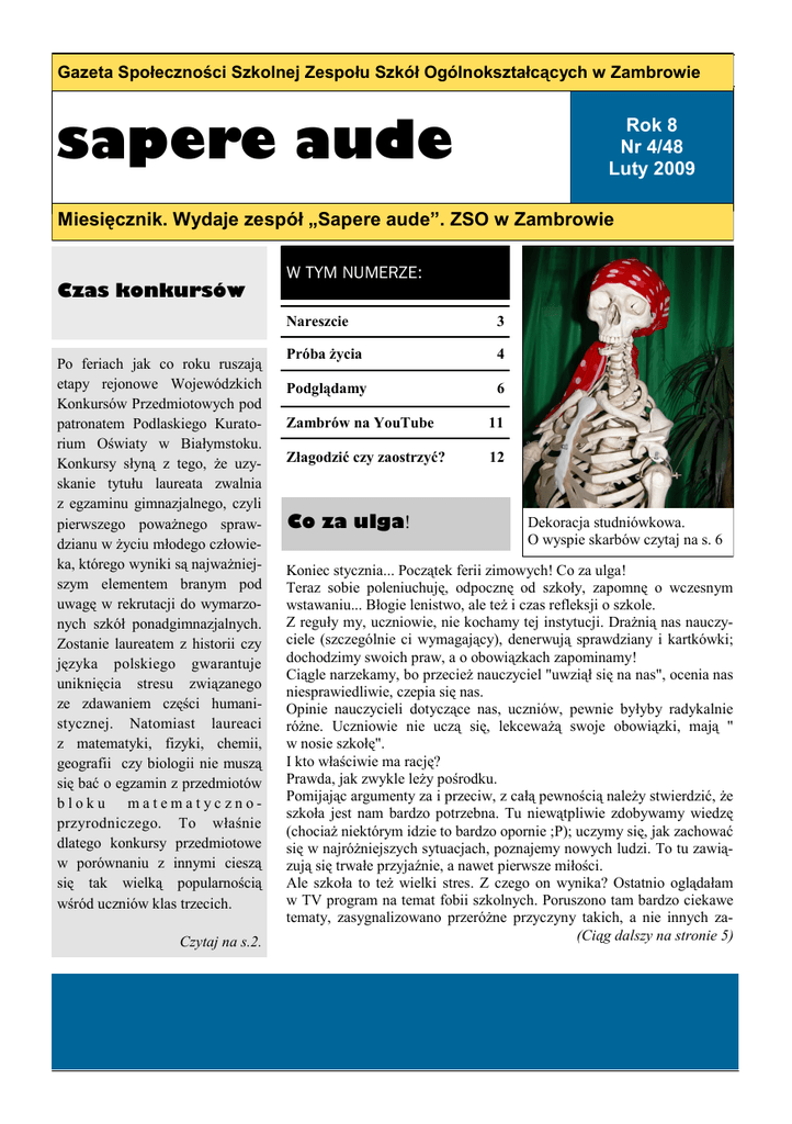 S AP ER E AU DE S TR. 1 Gazeta Społeczności Szkolnej Zespołu Szkół Ogólnokształcących w Zambrowie sapere aude Rok 8 Nr 4/48 Luty 2009 Miesięcznik. Wydaje zespół „Sapere aude”. ZSO w Zambrowie Czas konkursów Po feriach jak co roku ruszają etapy rejonowe Wojewódzkich Konkursów Przedmiotowych pod patronatem Podlaskiego Kuratorium Oświaty w Białymstoku. Konkursy słyną z tego, że uzyskanie tytułu laureata zwalnia z egzaminu gimnazjalnego, czyli pierwszego poważnego sprawdzianu w życiu młodego człowieka, którego wyniki są najważniejszym elementem branym pod uwagę w rekrutacji do wymarzonych szkół ponadgimnazjalnych. Zostanie laureatem z historii czy języka polskiego gwarantuje uniknięcia stresu związanego ze zdawaniem części humanistycznej. Natomiast laureaci z matematyki, fizyki, chemii, geografii czy biologii nie muszą się bać o egzamin z przedmiotów bloku matematycznoprzyrodniczego. To właśnie dlatego konkursy przedmiotowe w porównaniu z innymi cieszą się tak wielką popularnością wśród uczniów klas trzecich. Czytaj na s.2. W TYM NUMERZE: Nareszcie 3 Próba życia 4 Podglądamy 6 Zambrów na YouTube 11 Złagodzić czy zaostrzyć? 12 Co za ulga! Dekoracja studniówkowa. O wyspie skarbów czytaj na s. 6 Koniec stycznia... Początek ferii zimowych! Co za ulga! Teraz sobie poleniuchuję, odpocznę od szkoły, zapomnę o wczesnym wstawaniu... Błogie lenistwo, ale też i czas refleksji o szkole. Z reguły my, uczniowie, nie kochamy tej instytucji. Drażnią nas nauczyciele (szczególnie ci wymagający), denerwują sprawdziany i kartkówki; dochodzimy swoich praw, a o obowiązkach zapominamy! Ciągle narzekamy, bo przecież nauczyciel "uwziął się na nas", ocenia nas niesprawiedliwie, czepia się nas. Opinie nauczycieli dotyczące nas, uczniów, pewnie byłyby radykalnie różne. Uczniowie nie uczą się, lekceważą swoje obowiązki, mają " w nosie szkołę". I kto właściwie ma rację? Prawda, jak zwykle leży pośrodku. Pomijając argumenty za i przeciw, z całą pewnością należy stwierdzić, że szkoła jest nam bardzo potrzebna. Tu niewątpliwie zdobywamy wiedzę (chociaż niektórym idzie to bardzo opornie ;P); uczymy się, jak zachować się w najróżniejszych sytuacjach, poznajemy nowych ludzi. To tu zawiązują się trwałe przyjaźnie, a nawet pierwsze miłości. Ale szkoła to też wielki stres. Z czego on wynika? Ostatnio oglądałam w TV program na temat fobii szkolnych. Poruszono tam bardzo ciekawe tematy, zasygnalizowano przeróżne przyczyny takich, a nie innych za(Ciąg dalszy na stronie 5) S TR. 2 R OK 8 4/48 Kalendarz grudzień – luty W dniu 5 grudnia podsumowano akcję Góra grosza prowadzoną pod patronatem Ministra Edukacji Narodowej. W akcji udział wzięli uczniowie 4 klas LO (IIId, IIb, IIc, IIa) oraz 9 (Ia, b, c, IIc i d, IIIa, b, c, d) – Gimnazjum . Górę grosza zebrali uczniowie klasy IIId LO – 7,2 kg i IId Gimnazjum – 8,18kg). Zebrane pieniądze przeznaczone zostaną na Góra grosza zebranego w naszej szkole waży 56,55 kg. Czas konkursów Statystycznie zainteresowanie konkursami utrzymuje się w tym roku na tym samym poziomie, co w latach ubiegłych, mimo iż w tym roku do etapu szkolnego przystąpiła jedna osoba (162) mniej niż w ubiegłym (163). Najwięcej osób wzięło udział w eliminacjach szkolnych konkursu języka rosyjskiego (26) i historii (25). Najmniej osób postanowiło się zmierzyć z fizyką (tylko 11). W porównaniu z rokiem ubiegłym wzrosło zainteresowanie konkursem fizycznym (prawie dwukrotnie), chemicznym (sześciokrotnie) oraz języka rosyjskiego. Tylko ilość matematyków chcących sprawdzić, czy ich wiedza wystarczy do przejścia do eliminacji rejonowych pozostała niezmienna – 19. I jeszcze trochę porównań z rokiem szkolnym 2007/2008. W tym roku do etapu rejonowego przystąpi mniej gimnazjalistów z naszej szkoły niż w zeszłym. Największa liczba uczniów naszego gimnazjum weźmie udział w eliminacjach rejonowych konkursu historycznego (11).To o 7 osób mniej niż rok temu. Będzie to 4 uczniów z III D (E. Mendalka, P. Żochowski, A. Długoborski, W. Zmysłowska), 3 z II D (M. Ciecierski, K. Klimaszewska, A. Kossakowska) i 4 z II B (A. Rashid, M. Miazga, A. Jastrzębska, E. Zalewska). Wszyscy są uczniami p. prof. Wiesławy Iwanickiej. Młodych matematyków, którzy zmierzą się z zadaniami na kolejnym etapie konkursu będzie tylko dwóch, a raczej dwie, bo to uczennice klasy III D i p. prof. Danuty Pilch – E. Mendalka i P. Długoborska. Liczba uczestników etapu rejonowego konkursu matematycznego w r.szkol.2007/08 była dwa razy większa. Sześć razy więcej uczniów zakwalifikowało się do etapu rejonowego z fizyki. Są to uczniowie klasy III D (E. Mendalka, P. Żochowski, A. Długoborski, P. Długoborska, E. Zaremba i W. Zmysłowska) przygotowywani przez p. prof. Danutę Krajewską, ich wychowawczynię. O dwie osoby więcej weźmie udział w konkursie biologicznym. Będzie to 4 uczniów klasy III D przygotowanych 13 grudnia 2008 roku w siedzibie ODN w Łomży odbył się I etap Konkursu Chemicznego dla licealistów, zorganizowany przez Uniwersytet Mikołaja Kopernika w Toruniu. W I etapie tego konkursu wzięło udział 5 uczennic klasy IIId LO. Do II, ostatniego etapu konkursu zakwalifikowała się Agnieszka Śledziewska. Zmagania finałowe 6 i 7 marca w siedzibie UMK w Toruniu. Składać się będą z dwóch części – teoretycznej i doświadczalnej (laboratoryjnej). Opiekunem grupy uczennic przygotowujących się do konkursu jest P. Beata Rakoczy. Gratulujemy i życzymy dalszych sukcesów. przez p. prof. Grażynę Szumowską (P. Żochowski, J. Dziura, J. Piechocińska, P. Długoborska) oraz Małgorzata Przychodzeń z II D przygotowana przez p. prof. Annę Grykę. Liczba uczestników etapu rejonowego konkursu chemicznego w tym roku wzrosła dwukrotnie. O przejście do etapu wojewódzkiego będą się starać 4 osoby z III D (E. Mendalka, P. Żocho