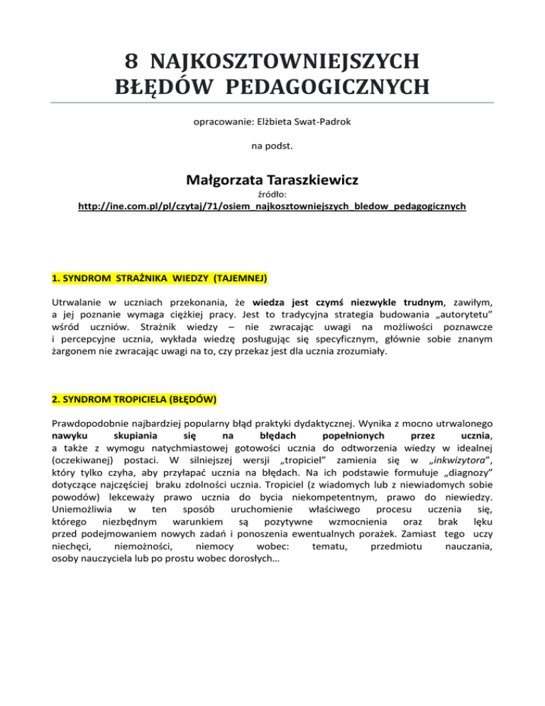 opracowanie: Elżbieta Swat-Padrok na podst. źródło: http://ine.com.pl/pl/czytaj/71/osiem_najkosztowniejszych_bledow_pedagogicznych 1. SYNDROM STRAŻNIKA WIEDZY (TAJEMNEJ) Utrwalanie w uczniach przekonania, że wiedza jest czymś niezwykle trudnym, zawiłym, a jej poznanie wymaga ciężkiej pracy. Jest to tradycyjna strategia budowania „autorytetu” wśród uczniów. Strażnik wiedzy – nie zwracając uwagi na możliwości poznawcze i percepcyjne ucznia, wykłada wiedzę posługując się specyficznym, głównie sobie znanym żargonem nie zwracając uwagi na to, czy przekaz jest dla ucznia zrozumiały. 2. SYNDROM TROPICIELA (BŁĘDÓW) Prawdopodobnie najbardziej popularny błąd praktyki dydaktycznej. Wynika z mocno utrwalonego nawyku skupiania się na błędach popełnionych przez ucznia, a także z wymogu natychmiastowej gotowości ucznia do odtworzenia wiedzy w idealnej (oczekiwanej) postaci. W silniejszej wersji „tropiciel” zamienia się w „inkwizytora”, który tylko czyha, aby przyłapać ucznia na błędach. Na ich podstawie formułuje „diagnozy” dotyczące najczęściej braku zdolności ucznia. Tropiciel (z wiadomych lub z niewiadomych sobie powodów) lekceważy prawo ucznia do bycia niekompetentnym, prawo do niewiedzy. Uniemożliwia w ten sposób uruchomienie właściwego procesu uczenia się, którego niezbędnym warunkiem są pozytywne wzmocnienia oraz brak lęku przed podejmowaniem nowych zadań i ponoszenia ewentualnych porażek. Zamiast tego uczy niechęci, niemożności, niemocy wobec: tematu, przedmiotu nauczania, osoby nauczyciela lub po prostu wobec dorosłych… 3. SYNDROM PROJEKTORA Narzucanie osobistych preferencji w zakresie tematyki i metodyki uczenia się. Ucząc nauczyciel zachowuje się tak, jakby uczył samego siebie: zwraca uwagę jedynie na własne preferencje, a ukryte zwykle założenie brzmi „musicie się do mnie dostosować i nadążać, bo inaczej... będziecie mieć problemy”. W przeciętnej klasie jest na ogół kilkoro uczniów o zbliżonych dyspozycjach do takiego nauczyciela (m.in. w zakresie modalności sensorycznych, stylu uczenia) i ta grupa jest odbierana jako uczniowie zdolni. Inni uczniowie pozostają w tzw. „cieniu dydaktycznym”. Planowanie skutecznego (czyli dostępnego każdemu) procesu dydaktycznego rozpoczyna się od postawienia właściwej diagnozy i zaprojektowania takiego jego przebiegu, aby w treściach i formie angażował wszystkich uczniów: tych „podobnych” i tych „niepodobnych” do nauczyciela. 4. SYNDROM SPYCHACZA (PROBLEMÓW) Dość powszechna reakcja na napotkane problemy dydaktyczne czy wychowawcze. Polega na przerzuceniu odpowiedzialności na innych lub na okoliczności zewnętrzne. W praktyce słyszany jako komunikaty do ucznia: „weź się do nauki”, „popraw się” lub do rodziców: „proszę się wziąć za naukę swego dziecka”, „proszę coś zrobić z jego zachowaniem”. W tzw. mądrości życiowej (ale nie tej potocznej, tylko tej głębszej) problemy z jakimi się zderzamy traktowane są jako ważne osobiste wyzwania, lekcje do odrobienia dotyczące refleksji, zmiany strategii działania, zmiany przekonań... Spychanie problemu oczywiście go nie rozwiązuje. Powoduje natomiast, że nie-rozwiązane problemy narastają, a samopoczucie „spychającego” można wówczas porównać do nastroju osobnika na polu minowym… 5. SYNDROM KIEPSKIEGO OGRODNIKA Istotą tego błędu jest brak odpowiedzialności za efekty procesu nauczania i tzw. nonszalancja pedagogiczna. Korzystając z metafory dobrego ogrodnika można powiedzieć, iż pozwala on rosnąć roślinom według ich własnego planu: nie każe różom kwitnąć w zimie, nie każe stokrotkom być słonecznikami… Cieszy się, kiedy rośliny pięknie rosną, ale też nie złości się i nie zajmuje zbytnio tymi, które rozwijają się inaczej. Nie próbuje zmienić ich natury, nie daje bodźców do pełniejszego rozwoju i „modyfikacji” ewentualnych słabości. Dba o rozwój – oferując jedynie właściwe „zasilanie”, kompetentną troskę i cierpliwość. 6. SYNDROM OCENIAJĄCEGO Najbardziej czytelna funkcja praktyki szkolnej: stawianie ocen i ferowanie wyroków związanych (a często słabo związanych) z danym stanem rzeczy, tj. sprawnością umysłową i wykonawczą ucznia. Potocznie wydaje się, iż istotą szkoły jest ocenianie uczniów – ten aspekt jest szczególnie akcentowany w rozmowach między nauczycielami, rozmowach nauczycieli z rodzicami i... w zabawach dzieci w szkołę. Jest to niedorzeczne, Istotą szkoły jest uczenie uczniów, nie zaś ich ocenianie. Ważniejsze jest, aby rozumieć co się umie, a czego się nie umie - niż wiedzieć, że jest się uczniem „bardzo dobrym” lub „trójkowym”. W zrozumieniu różnicy tkwi istota nowoczesnego podejścia do edukacji: uczący się potrzebuje informacji zwrotnej na temat wyników swoich starań. Powinna mieć ona dwojaki charakter: wzmacniająca to, co zrobił właściwie i korygująca działania niewłaściwe. Przy takim podejściu, po pewnym czasie, możliwe jest uruchomienie procesów samooceniania, co wiąże się z przyjmowaniem odpowiedzialności za efekty własnej nauki. 7. SYNDROM MISTRZA ŚWIATA Dotyczy tych wszystkich, którym się wydaje, że wiedzą już wszystko i nie muszą już niczego się uczyć. Błąd szczególnie niebezpieczny podczas wykonywania zawodu polegającego na przewodzeniu (asyście) w uczeniu się innych. Efektem jest zwykle zanik wrażliwości zawodowej. Ci, których działaniom towarzyszą fantastyczne efekty dydaktyczne i wychowawcze – są stale gotowi do poddania refleksji swojej praktyki, są otwarci na nowe idee i ustawicznie się kształcą. 8. SYNDROM ŚLEPCA Niedostrzeganie u siebie żadnych oznak omówionych powyżej błędów!