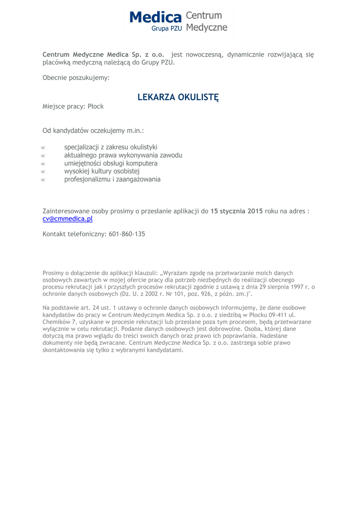 Centrum Medyczne Medica Sp. z o.o. jest nowoczesną, dynamicznie rozwijającą się placówką medyczną należącą do Grupy PZU. Obecnie poszukujemy: LEKARZA OKULISTĘ Miejsce pracy: Płock Od kandydatów oczekujemy m.in.: • • • • • specjalizacji z zakresu okulistyki aktualnego prawa wykonywania zawodu umiejętności obsługi komputera wysokiej kultury osobistej profesjonalizmu i zaangażowania Zainteresowane osoby prosimy o przesłanie aplikacji do 15 stycznia 2015 roku na adres : [email protected] Kontakt telefoniczny: 601-860-135 Prosimy o dołączenie do aplikacji klauzuli: „Wyrażam zgodę na przetwarzanie moich danych osobowych zawartych w mojej ofercie pracy dla potrzeb niezbędnych do realizacji obecnego procesu rekrutacji jak i przyszłych procesów rekrutacji zgodnie z ustawą z dnia 29 sierpnia 1997 r. o ochronie danych osobowych (Dz. U. z 2002 r. Nr 101, poz. 926, z późn. zm.)". Na podstawie art. 24 ust. 1 ustawy o ochronie danych osobowych informujemy, że dane osobowe kandydatów do pracy w Centrum Medycznym Medica Sp. z o.o. z siedzibą w Płocku 09-411 ul. Chemików 7, uzyskane w procesie rekrutacji lub przesłane poza tym procesem, będą przetwarzane wyłącznie w celu rekrutacji. Podanie danych osobowych jest dobrowolne. Osoba, której dane dotyczą ma prawo wglądu do treści swoich danych oraz prawo ich poprawiania. Nadesłane dokumenty nie będą zwracane. Centrum Medyczne Medica Sp. z o.o. zastrzega sobie prawo skontaktowania się tylko z wybranymi kandydatami.