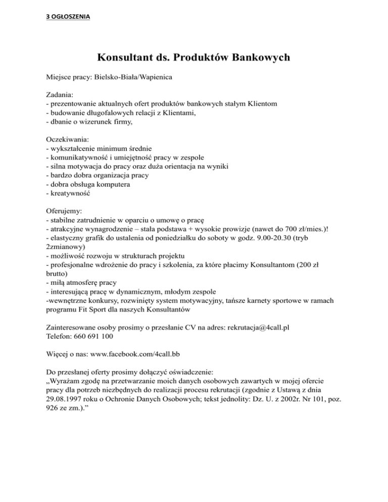 3 OGŁOSZENIA Konsultant ds. Produktów Bankowych Miejsce pracy: Bielsko-Biała/Wapienica Zadania: - prezentowanie aktualnych ofert produktów bankowych stałym Klientom - budowanie długofalowych relacji z Klientami, - dbanie o wizerunek firmy, Oczekiwania: - wykształcenie minimum średnie - komunikatywność i umiejętność pracy w zespole - silna motywacja do pracy oraz duża orientacja na wyniki - bardzo dobra organizacja pracy - dobra obsługa komputera - kreatywność Oferujemy: - stabilne zatrudnienie w oparciu o umowę o pracę - atrakcyjne wynagrodzenie – stała podstawa + wysokie prowizje (nawet do 700 zł/mies.)! - elastyczny grafik do ustalenia od poniedziałku do soboty w godz. 9.00-20.30 (tryb 2zmianowy) - możliwość rozwoju w strukturach projektu - profesjonalne wdrożenie do pracy i szkolenia, za które płacimy Konsultantom (200 zł brutto) - miłą atmosferę pracy - interesującą pracę w dynamicznym, młodym zespole -wewnętrzne konkursy, rozwinięty system motywacyjny, tańsze karnety sportowe w ramach programu Fit Sport dla naszych Konsultantów Zainteresowane osoby prosimy o przesłanie CV na adres: [email protected] Telefon: 660 691 100 Więcej o nas: www.facebook.com/4call.bb Do przesłanej oferty prosimy dołączyć oświadczenie: „Wyrażam zgodę na przetwarzanie moich danych osobowych zawartych w mojej ofercie pracy dla potrzeb niezbędnych do realizacji procesu rekrutacji (zgodnie z Ustawą z dnia 29.08.1997 roku o Ochronie Danych Osobowych; tekst jednolity: Dz. U. z 2002r. Nr 101, poz. 926 ze zm.).” Konsultant w Dziale Utrzymania Klienta Zadania: - Kontakt z aktualnymi Klientami (TV cyfrowa) w celu przedłużenia umowy - Prezentowanie aktualnej oferty w trakcie rozmowy telefonicznej - Propozycja rozszerzenia oferty - Doradzanie Klientom przy wyborze najlepszej oferty, produktu lub usługi - Budowanie i podtrzymywanie dobrych relacji z aktualnymi Klientami Oczekiwania: - Motywacja do osiągania wyznaczonych celów - Komunikatywność - Mile widziane doświadczenie w obsłudze Klienta lub sprzedaży - Bardzo dobre umiejętności interpersonalne - Mile widziani również studenci Oferujemy: - Konkurencyjne wynagrodzenie (część stała oraz prowizja uzależniona od jakości i wyników pracy) – średnio 2000-3500zł! - Pracę w trybie zmianowym (pn-sb, 9-21) - Przyjazną atmosferę pracy - Profesjonalne szkolenia wstępne (produkt, sprzedaż, negocjacje) - Opiekę doświadczonego coacha - Możliwości awansu w dynamicznie rosnących strukturach firmy – u nas masz szansę awansować na stanowisko lidera! - Specjalne programy motywacyjne -Tańsze karnety Fit Sport dla naszych Konsultantów Nie czekaj - wyślij swoje CV na adres: [email protected] /[email protected] Masz pytania? Zadzwoń: 660 691 100 Więcej o nas na: www.facebook.com/4call.bb Do przesłanej oferty prosimy dołączyć oświadczenie: „Wyrażam zgodę na przetwarzanie moich danych osobowych zawartych w mojej ofercie pracy dla potrzeb niezbędnych do realizacji procesu rekrutacji zgodnie z ustawą z 29.08.1997. o Ochronie Danych Osobowych (Dz.U. z 2002 r. Nr101, poz.926).” DZIAŁ WSPARCIA KLIENTA- tylko połączenia przychodzące miejsce pracy: Bielsko-Biała/Wapienica Do zadań osoby zatrudnionej na tym stanowisku należeć będzie: -odbieranie połączeń do Abonentów, którzy posiadają umowę na usługę w zakresie Internetu, telefonu lub telewizji - udzielaniu informacji dotyczących prawidłowego działania świadczonych usług, -budowanie pozytywnego wizerunku oraz długofalowej relacji z Klientami. - bieżące rozwiązywanie i odnotowywanie w systemie zgłoszeń Klientów, - realizacja stawianych celów w oparciu o jednolite procedury obsługi. W zamian za zaangażowanie oferujemy: - Profesjonalne szkolenie wstępne , za które płacimy (400 zł), - Program wdrożeniowy – system szkoleń wewnętrznych - Atrakcyjne wynagrodzenie średnio od 2000zł – 3000zł brutto, - Niezbędne narzędzia do pracy, - Możliwość rozwoju i awansu (być może to Ty jesteś naszym przyszłym liderem?), - Przyjazną atmosferę pracy w zintegrowanym zespole. – tańsze karnety sportowe z programu Fit Sport Oczekujemy: - Dobrej znajomości obsługi komputera i pakietu MS Office, - Wysokiej kultury osobistej i zdolności komunikacyjnych, - Dyspozycyjności pomiędzy godzinami 9-21. (w weekendy i święta WOLNE) Zainteresowane osoby prosimy o wysyłanie aplikacji [email protected] ;) Telefon: 660-691-100 Prosimy o dopisanie następującej klauzuli: Wyrażam zgodę na przetwarzanie moich danych osobowych zawartych w mojej ofercie pracy dla potrzeb niezbędnych do realizacji procesu rekrutacji (zgodnie z ustawą z dn. 29.08.97 roku o Ochronie Danych Osobowych Dz. Ust Nr 133 poz. 883).