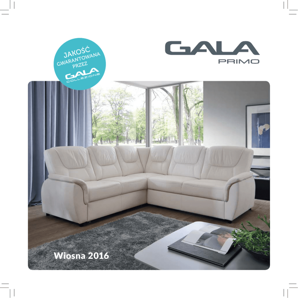 Wiosna 2016 MARKA GALA PRIMO Marka Gala Primo to design odwołujący się do ponadczasowej klasyki i gwarancja zastosowania sprawdzonych rozwiązań użytkowych. Meble z tej linii świetnie sprawdzają się w mieszkaniach o mniejszej powierzchni. Są szczególnie chętnie wybierane przez osoby oczekujące wygody oraz satysfakcjonującej relacji jakości i wyglądu do ceny i funkcjonalności. Dostępne są w gotowych układach konfiguracyjnych w siedmiu kolorach tapicerki skórzanej (łączenie skóra/skaj) oraz podstawowej gamie tapicerki tkaninowej. OBJAŚNIENIA SYMBOLI pojemnik na pościel ruchome elementy pianka poliuretanowa nóżki plastikowe funkcja spania sprężyny bonell pianka wysokoelastyczna nóżki drewniane funkcja relaksu rozkładana manualnie sprężyny faliste Meble dostępne w skróconym terminie realizacji – do 4 tygodni w zależności od dostępności ZADBAJ O PIĘKNY WYGLĄD TWOJEJ SOFY Prawidłowa pielęgnacja naturalnej skóry i skaju gwarantuje ich żywotność oraz efektowny wygląd. Sięgnij po sprawdzone środki do pielęgnacji mebli „SKÓRA NATURALNA”, których formułę opracowaliśmy wspólnie z renomowanym ośrodkiem badawczym Lederzentrum. Dzięki nim usuniesz wszelkie zanieczyszczenia i odpowiednio zabezpieczysz powierzchnię, zapewniając długotrwałą miękkość i odpowiednią impregnację skóry. Jest to jedyny rekomendowany przez nas środek konserwacyjny, którego stosowanie podtrzymuje warunki gwarancji producenta. Oferta niniejsza nie jest ofertą w rozumieniu przepisów Kodeksu Cywilnego. Kolorystyka tapicerki może odbiegać od prezentowanej na zdjęciach. Producent zastrzega sobie prawo dokonywania zmian konstrukcyjnych w oferowanych modelach nie zmieniając ich ogólnego charakteru. Wymiary mebli tapicerowanych są podane z tolerancją 3%. Standardowy termin realizacji (od 6 do 8 tygodni) NOWOŚĆ Udine str. 4-5 Choco str. 6-7 Linate str. 8-9 Velvet str. 10-11 Spin str. 12-13 Vito str. 14-15 Pop str. 16-17 Grant str. 18-19 elementy systemu Udine Fotel z funkcją relaksu 1TV szer szer./gł./wys. 94/94-163/95 - 73 cm 94/ wys. siedziska - 46 cm wys Narożnik z funkcją spania 2.5QFL-SEF-2SP szer./gł./wys. 240/220/95 cm wys. siedziska - 46 cm Narożnik z funkcją spania 2SL SEF 2 5QFP 2SL-SEF-2.5QFP szer./gł./wys. 220/240/95 cm wys. siedziska - 46 cm System rozkładania (DELFIN) pow. spania 184x127 cm Narożnik 2.5QFL-SEF-2SP / skóra G-105 4 NOWOŚĆ Udine Skrócony termin realizacji dla zamówień w kolorach G - 220 Standardowy termin realizacji dla zamówień w kolorach G - 000 G - 105 G - 160 G - 200 G - 310 G - 323 Mebel dostępny także w szerokiej gamie tkanin 5 elementy systemu Choco Fotel stały 1 szer./gł./wys. 91/98/106 cm wys. siedziska - 47 cm Fotel z fnkcja relaksu 1TV F s szer./gł./wys. 91/98/78 - 106 cm 9 wys. siedziska - 47 cm w Sofa z funkcją spania 3F szer./gł./wys. 190/98/106 cm wys. siedziska - 47 cm System rozkładania (BELGIJKA) pow. spania 138x185 cm fotel 1TV, sofa 3F / skóra G-200 6 Choco Skrócony termin realizacji dla zamówień w kolorach G - 220 G - 160 G - 000 Standardowy termin realizacji dla zamówień w kolorach G - 105 G - 200 G - 323 G - 310 Możliwość zamówienia zestawu w całości w skórze madras Mebel dostępny także w szerokiej gamie tkanin 7 elementy systemu Linate Narożnik z funkcją spania OTMSL-2,5QFP szer./gł./wys. 260/200/81 - 95 cm wys. siedziska - 44 cm Narożnik z funkcją spania 2,5QFL-OTMSP szer./gł./wys. 260/200/81 - 95 cm wys. siedziska - 44 cm System rozkładania (DELFIN) pow. spania 128x193 cm 8 Linate Skrócony termin realizacji dla zamówień w kolorach G - 220 G - 160 G - 000 Standardowy termin realizacji dla zamówień w kolorach G - 105 G - 200 G - 323 G - 310 Mebel dostępny także w szerokiej gamie tkanin narożnik OTMSL-2,5QFP / skóra G-105 9 elementy systemu Velvet Pufa TM szer./gł./wys. 52/52/43 cm wys. siedziska - 43 cm Fotel stały 1 szer./gł./wys. 87/88/87 cm wys. siedziska - 43 cm Sofa z funkcją spania 3F szer./gł./wys. 240/93/87 cm wys. siedziska - 43 cm System rozkładania (DL) pow. spania 143x190 cm 10 Velvet Skrócony termin realizacji dla zamówień w kolorach G - 160 G - 220 Standardowy termin realizacji dla zamówień w kolorach G - 000 G - 105 G - 323 G - 310 G - 200 Mebel dostępny także w szerokiej gamie tkanin sofa 3F, fotel 1, pufa TM / skóra G-200 11 elementy systemu Spin Narożnik z funkcją spa spania 1DFL-2.5QFP szer./gł./wys. 228/165/92 cm wys. siedziska - 44 cm Narożnik z funkcją spania 2.5QFL-1DFP szer./gł./wys. 228/165/92 cm wys. siedziska - 44 cm System rozkładania (DELFIN) pow. spania 120x196 cm narożnik 1DFL-2.5QFP / skóra G-160 12 Spin Skrócony termin realizacji dla zamówień w kolorach G - 160 G - 220 Standardowy termin realizacji dla zamówień w kolorach G - 000 G - 105 G - 323 G - 310 G - 200 Mebel dostępny także w szerokiej gamie tkanin 13 elementy systemu Vito Fotel stały 1 szer./gł./wys. 100/88/90 cm wys. siedziska - 43 cm Narożnik z funkcją spania OTML-2FP szer./gł./wys. 235/169/90 cm wys. siedziska - 43 cm Narożnik z funkcją spania 2FL-OTMP szer./gł./wys. 235/169/90 cm wys. siedziska - 43 cm System rozkładania (DELFIN) pow. spania 118x205 cm narożnik 2FL-OTMP / skóra G-200 14 Vito Skrócony termin realizacji dla zamówień w kolorach G - 200 G - 323 Standardowy termin realizacji dla zamówień w kolorach G - 000 G - 105 G - 220 G - 160 G - 310 Możliwość zamówienia zestawu w całości w skórze madras Mebel dostępny także w szerokiej gamie tkanin 15 elementy systemu Pop Fotel FIN1 szer./gł./wys. 75/75/102 cm Sofa z funkcją spania 3F szer./gł./wys. 200/90/102 cm wys. siedziska - 44 cm System rozkładania (KLIK-KLAK) pow. spania 114 x 200 cm 16 Pop Skrócony termin realizacji dla zamówień w kolorach G - 200 G - 323 Standardowy termin realizacji dla zamówień w kolorach G - 000 G - 105 G - 220 G - 160 G - 310 Możliwość zamówienia zestawu w całości w skórze madras Mebel dostępny tak
