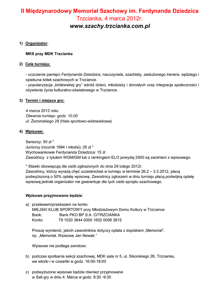 II Międzynarodowy Memoriał Szachowy im. Ferdynanda Dziedzica Trzcianka, 4 marca 2012r. www.szachy.trzcianka.com.pl 1) Organizator: MKS przy MDK Trzcianka 2) Cele turnieju: - uczczenie pamięci Ferdynanda Dziedzica, nauczyciela, szachisty, zasłużonego trenera, sędziego i opiekuna kółek szachowych w Trzciance. - popularyzacja „królewskiej gry” wśród dzieci, młodzieży i dorosłych oraz integracja społeczności i ożywienie życia kulturalno-oświatowego w Trzciance. 3) Termin i miejsce gry: 4 marca 2012 roku Otwarcie turnieju: godz. 10.00 ul. Żeromskiego 28 (Hala sportowo-widowiskowa) 4) Wpisowe: Seniorzy: 50 zł * Juniorzy (rocznik 1994 i młodsi): 25 zł * Wychowankowie Ferdynanda Dziedzica: 15 zł Zawodnicy z tytułem WGM/GM lub z rankingiem ELO powyżej 2500 są zwolnieni z wpisowego. * Stawki obowiązują dla osób zgłoszonych do dnia 26 lutego 2012r. Zawodnicy, którzy wyrażą chęć uczestnictwa w turnieju w terminie 26.2 – 3.3.2012, płacą podwyższoną o 50% opłatę wpisową. Zawodnicy zgłoszeni w dniu turnieju płacą podwójną opłatę wpisową jednak organizator nie gwarantuje dla tych osób sprzętu szachowego. Wpisowe przyjmowane będzie: a) przelewem/przekazem na konto: MIEJSKI KLUB SPORTOWY przy Młodzieżowym Domu Kultury w Trzciance Bank: Bank PKO BP S.A. O/TRZCIANKA Konto: 79 1020 3844 0000 1602 0058 3815 Proszę wymienić, jakich zawodników dotyczy opłata z dopiskiem „Memoriał”, np. „Memoriał. Wpisowe Jan Nowak.” Wpisowe nie podlega zwrotowi. b) podczas spotkania sekcji szachowej, MDK sala nr 5, ul. Sikorskiego 26, Trzcianka, we wtorki i w czwartki w godz. 16:00-18:00 c) podwyższone wpisowe będzie również przyjmowane w Sali gry w dniu 4. Marca w godz. 8:30 -9:30 5) Zgłoszenia Formularz: E-mail: www.szachy.trzcianka.com.pl/zgloszenia/ [email protected] Potwierdzeniem przyjęcia zawodnika do turnieju będzie umieszczenie jego nazwiska na liście startowej publikowanej pod adresem www.szachy.trzcianka.com.pl Zawodnicy, którzy zgłoszą się i uiszczą podwyższoną opłatę wpisową po 26.2.2012, i przed 3.3.2012 nie będą umieszczeni na liście startowej, proszeni są o dostarczenie organizatorowi potwierdzenia wpłaty. 6) Warunki specjalne: a) Bezpłatne zakwaterowanie w terminie 3.3.2011 — 4.3.2012 w hotelu, dla zawodników z tytułem WGM/GM lub z rankingiem ELO co najmniej 2500 (kobiety ELO co najmniej 2350), pod warunkiem zachowania terminu zgłoszenia do 26.2.2012. b) Zwrot kosztów podróży na podstawie przedłożonych biletów (do 200€) dla zawodników z rankingiem ELO co najmniej 2600, pod warunkiem zachowania terminu zgłoszenia do 26.2.2012. c) Honoraria startowe dla zawodników z rankingiem ELO co najmniej 2700 (kobiety z rankingiem ELO co najmniej 2500) negocjowane indywidualnie z Andrzejem Dassuj, pod warunkiem zgłoszenia na minimum 14 dni przed turniejem. 7) System rozgrywek i tempo gry: Turniej zostanie rozegrany systemem szwajcarskim, na dystansie 9 rund, 15 minut na zawodnika. 8) Przepisy gry, ocena wyników i informacje dodatkowe: W turnieju obowiązują aktualne przepisy gry FIDE. O zajętym miejscu w turnieju decyduje: suma zdobytych punktów, średni Buchholz, Buchholz, liczba zwycięstw, wyższy średni ranking przeciwników. O zajętym I miejscu decyduje tylko suma zdobytych punktów. W przypadku, gdy więcej niż jeden zawodnik uzyska największą w turnieju ilość punktów, przewidziana jest dogrywka. Organizatorzy nie zapewniają ubezpieczenia oraz wiz dla zawodników z zagranicy. Sędzia Główny turnieju: FA Waldemar Kopydłowski Osoba kontaktowa ds. sportowych: Maciej Cybulski Tel. 889 539 628, e-mail: [email protected] Osoba kontaktowa ds. marketingowych: Andrzej Dassuj Tel. 503 543 210, e-mail: [email protected] Notatka o Ferdynandzie Dziedzicu (PZSzach): http://www.szachy.trzcianka.com.pl/Dziedzic/ 9) Nagrody: Open: I miejsce II miejsce III miejsce IV miejsce V miejsce VI miejsce VII miejsce VIII miejsce IX miejsce X miejsce XI miejsce XII miejsce XIII miejsce XIV miejsce XV miejsce Kobiety: 10 000 PLN 7 500 PLN 5 000 PLN 4 000 PLN 3 000 PLN 2 000 PLN 1 800 PLN 1 600 PLN 1 400 PLN 1 200 PLN 1 000 PLN 800 PLN 600 PLN 400 PLN 200 PLN I miejsce II miejsce III miejsce 1 500 PLN 1 000 PLN 500 PLN Juniorzy starsi (ur. 1994 lub młodsi): I miejsce II miejsce III miejsce 500 PLN 300 PLN 200 PLN Juniorzy młodsi (ur. 1998 lub młodsi): I miejsce II miejsce III miejsce 500 PLN 300 PLN 200 PLN Zawodnicy z rankingiem ELO* ≤ 2300: I miejsce II miejsce III miejsce 1 000 PLN 750 PLN 500 PLN Zawodnicy z rankingiem ELO* ≤ 2000: I miejsce II miejsce III miejsce 700 PLN 500 PLN 300 PLN Zawodnicy z rankingiem ELO* ≤ 1700: I miejsce II miejsce III miejsce 500 PLN 300 PLN 200 PLN Organizator przewiduje nagrody specjalne dla najmłodszego zawodnika oraz dla najlepszego wychowanka Ferdynanda Dziedzica. Wszystkie ww. nagrody można łączyć. * Nagrody w grupach rankingowych może otrzymać zawodnik nieposiadający ELO. Wtedy brany jest pod uwagę ranking PZSzach. Wysokość nagród podana jest w kwotach brutto. Zgodnie z przepisami obowiązującymi w Polsce, nagrody do 760 PLN zwolnione są z podatku. Podatek od pozostałych nagród wynosi 10%. Organizator zastrzega sobie prawo do zmiany powyższego regulaminu. Serdecznie zapraszamy!
