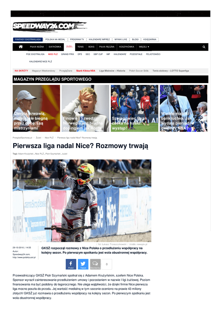 FANTASY EKSTRAKLASA POLSKA NA MEDAL PIŁKA NOŻNA ŻUŻEL SIATKÓWKA NICE PLŻ PGE EKSTRALIGA NICE PLŻ PROGRAM TV ŻUŻEL GRAND PRIX KALENDARZ IMPREZ TENIS DPŚ BOKS SEC WYNIKI LIVE PIŁKA RĘCZNA SBP CUP IMP BLOGI KOSZYKÓWKA KALENDARZ KSIĘGARNIA WIĘCEJ ▼ POZOSTAŁE FELIETONIŚCI KALENDARZ NICE PLŻ NA SKRÓTY Magazyn Weekendowy PrzegląDane Skarb Kibica NBA Liga Mistrzów – Historia Polish Soccer Skills Tenis stołowy – LOTTO Superliga MAGAZYN PRZEGLĄDU SPORTOWEGO Cierpią, krwawią, mdleją, ale biegną przez dobę. I są mistrzyniami PrzegladSportowy.pl › Żużel › Nice PLŻ Finowie i Szwedzi: Norwegia jest brudna dopingiem jak Rosja › Szeregowiec Ryan czeka na hasło: wystąp! Pierwsza liga nadal Nice? Rozmowy trwają Pierwsza liga nadal Nice? Rozmowy trwają Tagi: Adam Krużyński , Nice PLŻ , Piotr Szymański , żużel / fot. Łukasz Trzeszczkowski / źródło: newspix.pl 29-10-2016 | 14:55 Autor: Speedway24.com, GKSŻ rozpoczął rozmowy z Nice Polska o przedłużeniu współpracy na kolejny sezon. Po pierwszym spotkaniu jest wola obustronnej współpracy. http://www.polskizuzel.pl 0 Poleć Tweet Skomentuj Przewodniczący GKSŻ Piotr Szymański spotkał się z Adamem Krużyńskim, szefem Nice Polska. Sponsor wyraził zainteresowanie przedłużeniem umowy i pozostaniem w nazwie I ligi żużlowej. Poziom finansowania ma być podobny do tegorocznego. Nie ulega wątpliwości, że dzięki firmie Nice pierwsza liga mocno poszła do przodu. Jej wartość medialną w tym sezonie oceniono na prawie 43 miliony złotych! GKSŻ już rozmawia o przedłużeniu współpracy na kolejny sezon. Po pierwszym spotkaniu jest wola obustronnej współpracy. Wielkie majątki i bankructwa. Jak wydają pieniądze gwiazdy NBA? Na żużlowe władze naciskają jednak przedstawiciele niektórych zespołów. Podczas spotkania prezesów klubów I ligi Witold Skrzydlewski - prezes Orła Łódź skrytykował poziom wsparcia ze strony firmy Nice dla pierwszoligowych klubów. Wystąpił z wnioskiem, że w związku z wzrostem medialnej wartości rozgrywek z PZM i GKSŻ powinni zawrzeć "prawdziwą umowę za prawdziwe pieniądze". Jeśli więc poziom dofinansowania ze strony Nice nie zyska akceptacji klubów, to liga będzie musiała poszukać nowego sponsora tytularnego. Wszystko jednak wskazuje, że większość postawi na stabilizację i kontynuację współpracy z Nice. RE KL A M A RE KL A M A Waszym zdaniem Czy kluby I ligi postawią w sezonie 2017 na kontynuację współpracy z firmą Nice? Tak Nie Przeczytaj także Celebryta Iwan znów przemówił. Niestety Co 19 sekund diagnozuje się Obraniak: Wymiotowałem po wizycie u przypadek… Mariusza Lewandowskiego Podkarpacki ZPN zawiadamia Masz własną firmę? To oferta dla Boniek dla „PS”: Bardziej od prokuraturę Ciebie… Wojciechowskiego w PZPN-ie chcieli rządzić... dostarczone przez plista CO O TYM SĄDZISZ? WYPOWIEDZ SIĘ NA FORUM! Bądź pierwszy! Wyraź swoją opinię! Piłka nożna Sporty zimowe Biliński zaskoczył wszystkich, Jodłowiec znów zawiódł. Oceny za 14. kolejkę Johaug współpracuje z psychologiem. „Mamy plan awaryjny” Trwa 14. kolejka LOTTO Ekstraklasy. Zapraszamy do przeczytania ocen, które nasi dziennikarze wystawiają po każdym meczu. 28-latka zatrudni jeszcze prywatnego trenera, ponieważ przez zawieszenie nie może współpracować z reprezentacją. 0 Śląsk łatwo wygrał w Lublinie z Górnikiem Łęczna Górnik Łęczna przegrał w Lublinie ze Śląskiem Wrocław 0:3 po golach Ryoty Morioki, Kamila Bilińskiego i Petera Grajciara. Zobacz... Therese Johaug po dopingu najpopularniejszą osobą wszech czasów w Norwegii 0 Koszykówka Zdobył złoto, wraca do Zielonej Góry W okresie dwóch tygodni liczba artykułów prasowych na temat Therese Johaug w mediach przekroczyła kilka tysięcy. 1 Piłka ręczna NBA - Westbrook zdobył 51 punktów i zanotował triple double W piątkowym spotkaniu drużyna Thunder pokonała u siebie Phoenix Suns 113:110 (po dogrywce). 0 Serbska zagadka 0 W piątek w Gdańsku rozpoczęło się zgrupowanie przed meczami eliminacji mistrzostw Europy z Serbią i Rumunią. 0 Lubinianie stracili dwa punkty w ostatniej chwili Russell Robinson był jednym z autorów mistrzostwa Polski dla Stelmetu w sezonie 2014/2015. Teraz znowu zobaczymy go w Zielonej... 0 Prestiżowe zawody? Tylko we wspomnieniach PGE Skra nie dała szans Lotosowi! Pewne zwycięstwo bełchatowian Medalistki igrzysk europejskich w finałach turnieju im. Feliksa Stamma. 0 Powtórka z meczów o brąz! PGE Skra wygrywa z Lotosem Treflem PGE Skra Bełchatów pokonała Lotos Trefl Gdańsk 3:0, choć mecz mógł wymknąć się gospodarzom spod kontroli. 1 Boks Siatkówka Siatkarze PGE Skry Bełchatów pokonali we własnej hali 3:0 Lotos Trefl Gdańsk w PlusLidze. W meczu 9. kolejki PGNiG Superligi szczypiorniści Zagłębia Lubin przegrali 24:25 z MMTS Kwidzyn. 1 0 Saleta o walce Brodnicka - Torti: Myślę, że pas zostanie w Polsce Mistrzyni Europy wagi lekkiej , Ewa Brodnicka (11-0, 2 KO) przed listopadową obroną tytułu z Anitą Torti (10-5-1, 3 KO) na gali... 11 Dołącz do nas RE KL A M A Z ostatniej chwili 18:08 16:35 16:20 15:24 14:39 13:04 11:06 10:02 09:03 08:10 Nice PLŻ Pierwsza liga nadal Nice? Rozmowy trwa… PGE Ekstraliga Prezes może spać spokojnie. Sponsorzy… Nice PLŻ Tarasienko podpisał. W Pile budują skład Nice PLŻ Bjerre ma ambicję. Chce błyskawicznie w… PGE Ekstraliga W tym roku zachwycił Fricke. Kto będzie… PGE Ekstraliga Janowski to inteligentny zawodnik. Sam … Grand Prix Sajfutdinow wraca do Grand Prix. W prze… PGE Ekstraliga Przedpełski: Niedosyt po finale był ogrom… PGE Ekstraliga Junior na wagę złota. Kluby niewolnikam… Felietony Janowski? Można było wybrać lepiej więcej 1 2 3 PGE Ekstraliga Statystyki PGE Ekstraligi więcej Tabela Nice PLŻ więcej Statystyki Nice PLŻ więcej Statystyki Elite League więcej Statystyki Elitserien więcej Pobierz Skarb Kibica więc