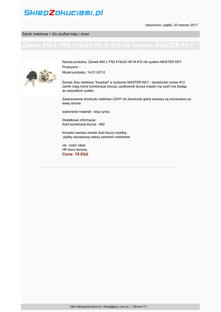 Utworzono: piątek, 03 marzec 2017 Zamki meblowe > Do szuflad klap i drzwi Zamek 850 L FN2 fi19x22 HK M #12 nik system MASTER KEY Nazwa produktu: Zamek 850 L FN2 fi19x22 HK M #12 nik system MASTER KEY Producent: Model produktu: 14.01.027-0 Zamek Siso meblowy "kwadrat" w systemie MASTER KEY - dyrektorski numer #12 zamki mają różne kombinacje klucza, użytkownik klucza master (np szef) ma dostęp do wszystkich szafek. Zastosowanie drzwiczki meblowe LEWY do drzwiczek gdzie zawiasy są montowane po lewej stronie wykonanie materiał - stop cynku Dodatkowe informacje: ilość kombinacji klucza - 400 komplet zawiera zamek 2szt kluczy rozetkę, płytkę zaczepową należy zamówić oddzielnie nik - kolor nikiel HK klucz łamany Cena: 18.65zł http://sklepzokuciami.pl | [email protected] | | Strona 1/1