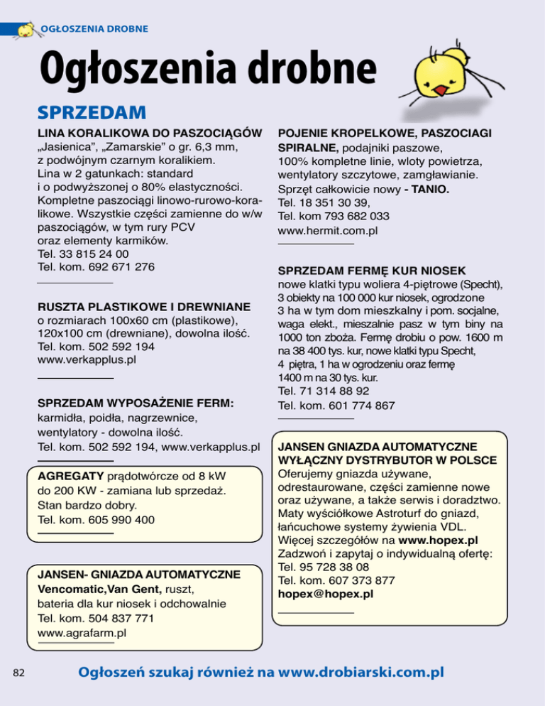 OGŁOSZENIA DROBNE Ogłoszenia drobne SPRZEDAM LINA KORALIKOWA DO PASZOCIĄGÓW „Jasienica”, „Zamarskie” o gr. 6,3 mm, z podwójnym czarnym koralikiem. Lina w 2 gatunkach: standard i o podwyższonej o 80% elastyczności. Kompletne paszociągi linowo-rurowo-koralikowe. Wszystkie części zamienne do w/w paszociągów, w tym rury PCV oraz elementy karmików. Tel. 33 815 24 00 Tel. kom. 692 671 276 RUSZTA PLASTIKOWE I DREWNIANE o rozmiarach 100x60 cm (plastikowe), 120x100 cm (drewniane), dowolna ilość. Tel. kom. 502 592 194 www.verkapplus.pl SPRZEDAM WYPOSAŻENIE FERM: karmidła, poidła, nagrzewnice, wentylatory - dowolna ilość. Tel. kom. 502 592 194, www.verkapplus.pl AGREGATY prądotwórcze od 8 kW do 200 KW - zamiana lub sprzedaż. Stan bardzo dobry. Tel. kom. 605 990 400 JANSEN- GNIAZDA AUTOMATYCZNE Vencomatic,Van Gent, ruszt, bateria dla kur niosek i odchowalnie Tel. kom. 504 837 771 www.agrafarm.pl 82 POJENIE KROPELKOWE, PASZOCIAGI SPIRALNE, podajniki paszowe, 100% kompletne linie, wloty powietrza, wentylatory szczytowe, zamgławianie. Sprzęt całkowicie nowy - TANIO. Tel. 18 351 30 39, Tel. kom 793 682 033 www.hermit.com.pl SPRZEDAM FERMĘ KUR NIOSEK nowe klatki typu woliera 4-piętrowe (Specht), 3 obiekty na 100 000 kur niosek, ogrodzone 3 ha w tym dom mieszkalny i pom. socjalne, waga elekt., mieszalnie pasz w tym biny na 1000 ton zboża. Fermę drobiu o pow. 1600 m na 38 400 tys. kur, nowe klatki typu Specht, 4 piętra, 1 ha w ogrodzeniu oraz fermę 1400 m na 30 tys. kur. Tel. 71 314 88 92 Tel. kom. 601 774 867 JANSEN GNIAZDA AUTOMATYCZNE WYŁĄCZNY DYSTRYBUTOR W POLSCE Oferujemy gniazda używane, odrestaurowane, części zamienne nowe oraz używane, a także serwis i doradztwo. Maty wyściółkowe Astroturf do gniazd, łańcuchowe systemy żywienia VDL. Więcej szczegółów na www.hopex.pl Zadzwoń i zapytaj o indywidualną ofertę: Tel. 95 728 38 08 Tel. kom. 607 373 877 [email protected] Ogłoszeń szukaj również na www.drobiarski.com.pl OGŁOSZENIA DROBNE SPRZEDAM AGREGATY prądotwórcze od 10 kVA do 2500 kVA - dobór agregatu w obiekcie inwestora - dostawy własnym transporetem - montaż - serwis gwarancyjny i pogwarancyjny Tel. 52 351 62 45 Tel. kom. 601 639 554 www.janaszkiewicz.eu ŁUSKARKI lodu „MAJA” i „HIGEL” od 100 do 6000 kg/dobę. Nowe i używane z gwarancją. Remonty maszyn. Najniższe ceny w kraju. Tel. kom. 602 283 252, Tel./fax. 33 815 61 35, e-mail: [email protected] Zapraszamy na naszą stronę: www.phu-west.pl ODCHOWALNIA Big Dutchman, - jak nowa Tel. kom. 507 186 237, 512 622 868 www.agrafarm.pl AGOS SILOSY PASZOWE / ZBOŻOWE 5-140 t największy producent silosów Dozownik ziarna 5% - 50% - montowany pod koszem paszociągu lub z zasobnikiem 1200 kg. www.silosypaszowe.pl Tel/fax. 95 741 16 27 AGREGATY PRĄDOTWÓRCZE od 20 KW do 1000 KW, nowe i używane z gwarancją i dowozem na miejsce, naprawy główne i bieżące. Tel. kom. 605 209 828 www.agregaty-pradotworcze-kruszwica.pl MATY DEZYNFEKCYJNE do ferm drobiarskich, wylęgarni, ubojni. Rozmiar standard : 90x60 cm. Firma realizuje również zamówienia wg indywidualnych potrzeb Klienta. V I L S Tel. kom. 698 085 200 SORTOWNICE DO JAJ - naprawy bieżące, remonty kapitalne sortownic do jaj - skup, sprzedaż sortownic do jaj Tomax S.c. Tel. kom. 603 533 506, 603 533 502 www.sortownice.cba.pl SPRZEDAM KACZKI I GĘSI ODCHOWANE, od 0-4 tygodni. Mulard, dworka, pekin, barbery, gęsi szare i białe. Transport cały kraj, zapraszamy do współpracy, ceny konkurencyjne. www.napadlek.pl Tel. kom. 507 969 066, 506 472 432 Ogłoszeń szukaj również na www.drobiarski.com.pl 83 OGŁOSZENIA DROBNE SPRZEDAM SPRZEDAM KURKI ODCHOWANE rasy Lohmann Brown i Lohmann Sendy (produkuje kremowe jajka) wstawione 20.03.2015 w systemie volierowym oraz kurki rasy Lohmann Brown wstawione 02.04.2015 w systemie ściółkowym i kurki Bovans Brown, które będą wstawione 12.06.2015 w systemie Volierowym. Przyjmę zamówienie na odchów 22000 tysięcy kurek w systemie Volierowym data wstawienia 17.08.2015. Pełna profilaktyka weterynaryjna. Papierz Aleksander,woj.wielkopolskie Tel. kom. 603 741 360 email: [email protected] SPRZEDAM GNIAZDA AUTOMATYCZNE firmy Jansen, dł. od 65 do 100 m wraz z pozostałym wyposażeniem, stan techniczny bardzo dobry. Tel. kom. 502 592 194 www.verkapplus.pl KARCHER - NOWE I UŻYWANE MYJKI CIŚNIENIOWE. Gwarancja, serwis, osprzęt. TRAKTOROWE AGREGATY PRĄDOTWÓRCZE WOM 16-110 kVa. Największy wybór w Polsce. ROZDRABNIACZE, SIECZKARNIE, ŚCIELARKI DO SŁOMY TAGLE, KIDD. Milicz, Tel. kom. 606 211 056, 507 158 699 84 SORTOWNICE Sprzedaż - Skup Wydajność od 1600 szt./h do 50.000 szt./h, możliwość wraz z drukarką. Naprawy, remonty kapitalne - wszystkie typy. Tel./fax. 61 286 38 38 Tel. kom. 603 930 803 www.sortownicejuszczak.pl SPRZEDAM KURKI ODCHOWANE, towarowe i ogólnoużytkowe w różnym wieku. Tel. kom. 605 834 710 JAJA KURZE SKUP-SPRZEDAŻ Zakład Pakowania Jaj „KURAK”, Bieżuń, woj. mazowieckie. Tel./fax 23 68 41 718 Tel. kom. 606 334 400 SPRZEDAŻ KUREK ODCHOWANYCH MESSA I ROSSA (KOLOROWE) wstawione 29.04.2015, 40 000 szt. Tel. kom. 501 671 848 Drugie stado wstawione 30.03.2015, 60 000 szt. Tel. kom. 510 898 979 Program szczepień, możliwość transportu. www.fermywiejak.pl, Lublin Ogłoszeń szukaj również na www.drobiarski.com.pl OGŁOSZENIA DROBNE SPRZEDAM SPRZEDAM UŻYWANĄ KLATKĘ Pow. podł. na kurę 750 cm2/szt. Obsada 17 600 szt. Tel. 606 339 042 607 159 798 KURKI ODCHOWANE ROSA kolorowe w różnym wieku, możliwy dowóz. Sępólno Tel. kom. 600 539 790, 600 500 706 SPRZEDAM GNIAZDA AUTOMATYCZNE VENCOMATIC długość 108 mb, rok prod. 2011, ruszty z obydwóch stron, stan bardzo dobry, atrakcyjna cena. woj. wielkopolskie, Tel. kom. 602 83 11 99 SPRZEDAM KURKI Novogen, Rosa i Lohmann brązowy, biały oraz sandy (produkuje kremowe jaja) w ilości 150 tys. sztuk, wstawione 13.01.2015, 02.02.2015, 27.02.2015, 05.03.2015. Specjalistyczny transport. Sprzedam jajka od ku