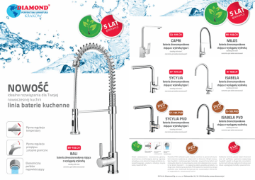 KRAKÓW NOWOŚĆ idealne rozwiązania dla Twojej nowoczesnej kuchni CA-181.CH MI-183.CH CAPRI MILOS bateria zlewozmywakowa stojąca z wylewką typu C bateria zlewozmywakowa stojąca z wyciąganą wylewką standing sink mixer C смеситель для мойки консольный C standing sink mixer смеситель для мойки консольный SY-181.CH IS-183.CH SYCYLIA ISABELA bateria zlewozmywakowa stojąca z wylewką typu C bateria zlewozmywakowa stojąca z wyciąganą wylewką standing sink mixer C смеситель для мойки консольный C standing sink mixer смеситель для мойки консольный linia baterie kuchenne IS-183.PVD SY-181.PVD SYCYLIA PVD bateria zlewozmywakowa stojąca z wylewką typu C bateria zlewozmywakowa stojąca z wyciąganą wylewką standing sink mixer C смеситель для мойки консольный C Płynna regulacja przepływu 3 stopnie graniczne ISABELA PVD standing sink mixer смеситель для мойки консольный BA-183.CH BALI bateria zlewozmywakowa stojąca z wyciąganą wylewką standing sink mixer смеситель для мойки консольный Płynna regulacja przepływu 3 stopnie graniczne Dzięki zastosowaniu nowoczesnej głowicy ceramicznej umożliwiającej płynną regulację przepływu oraz ekonomicznego perlatora napowietrzającego uzyskano redukcję zużycia wody nawet do 50%. Powłoka PVD nakładana jako trzecia warstwa na powierzchnię baterii znacznie zwiększa jej odporność na ścieranie. Dzięki niezwykłej trwałości zastosowanego materiału powierzchnia baterii jest niezwykle odporna na zarysowania oraz jest zabezpieczona na wiele lat przed zużyciem - co zapewnia piękną powłoką produktu na długi czas. Dekoracyjna powłoka PVD zapewnia nowoczesny design produktu oraz doskonale komponuje się z pozostałymi elementami wyposażenia nowoczesnej kuchni. Dokładna kontrola jakości baterii Diamond oraz ich perfekcja wykonania zapewniają trwałość i jakość na długie lata. Linia baterii kuchennych oferuje praktyczne funkcje oraz łatwe w pielęgnacji kształty i powierzchnie.