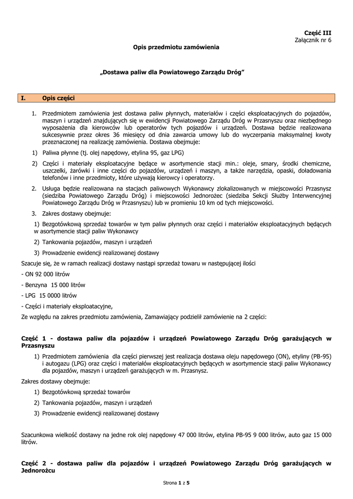 Część III Załącznik nr 6 Opis przedmiotu zamówienia „Dostawa paliw dla Powiatowego Zarządu Dróg” I. Opis części 1. Przedmiotem zamówienia jest dostawa paliw płynnych, materiałów i części eksploatacyjnych do pojazdów, maszyn i urządzeń znajdujących się w ewidencji Powiatowego Zarządu Dróg w Przasnyszu oraz niezbędnego wyposażenia dla kierowców lub operatorów tych pojazdów i urządzeń. Dostawa będzie realizowana sukcesywnie przez okres 36 miesięcy od dnia zawarcia umowy lub do wyczerpania maksymalnej kwoty przeznaczonej na realizację zamówienia. Dostawa obejmuje: 1) Paliwa płynne (tj. olej napędowy, etylina 95, gaz LPG) 2) Części i materiały eksploatacyjne będące w asortymencie stacji min.: oleje, smary, środki chemiczne, uszczelki, żarówki i inne części do pojazdów, urządzeń i maszyn, a także narzędzia, opaski, doładowania telefonów i inne przedmioty, które używają kierowcy i operatorzy. 2. Usługa będzie realizowana na stacjach paliwowych Wykonawcy zlokalizowanych w miejscowości Przasnysz (siedziba Powiatowego Zarządu Dróg) i miejscowości Jednorożec (siedziba Sekcji Służby Interwencyjnej Powiatowego Zarządu Dróg w Przasnyszu) lub w promieniu 10 km od tych miejscowości. 3. Zakres dostawy obejmuje: 1) Bezgotówkową sprzedaż towarów w tym paliw płynnych oraz części i materiałów eksploatacyjnych będących w asortymencie stacji paliw Wykonawcy 2) Tankowania pojazdów, maszyn i urządzeń 3) Prowadzenie ewidencji realizowanej dostawy Szacuje się, że w ramach realizacji dostawy nastąpi sprzedaż towaru w następującej ilości - ON 92 000 litrów - Benzyna 15 000 litrów - LPG 15 0000 litrów - Części i materiały eksploatacyjne, Ze względu na zakres przedmiotu zamówienia, Zamawiający podzielił zamówienie na 2 części: Część 1 - dostawa paliw dla pojazdów i urządzeń Powiatowego Zarządu Dróg garażujących w Przasnyszu 1) Przedmiotem zamówienia dla części pierwszej jest realizacja dostawa oleju napędowego (ON), etyliny (PB-95) i autogazu (LPG) oraz części i materiałów eksploatacyjnych będących w asortymencie stacji paliw Wykonawcy dla pojazdów, maszyn i urządzeń garażujących w m. Przasnysz. Zakres dostawy obejmuje: 1) Bezgotówkową sprzedaż towarów 2) Tankowania pojazdów, maszyn i urządzeń 3) Prowadzenie ewidencji realizowanej dostawy Szacunkowa wielkość dostawy na jedne rok olej napędowy 47 000 litrów, etylina PB-95 9 000 litrów, auto gaz 15 000 litrów. Część 2 - dostawa paliw dla pojazdów i urządzeń Powiatowego Zarządu Dróg garażujących w Jednorożcu Strona 1 z 5 1) Przedmiotem zamówienia dla części drugiej jest dostawa oleju napędowego (ON) i etyliny (PB-95) oraz części i materiałów eksploatacyjnych będących w asortymencie stacji paliw Wykonawcy dla pojazdów, maszyn i urządzeń garażujących w m. Jednorożec. Zakres dostawy obejmuje: 1) Bezgotówkową sprzedaż towarów 2) Tankowanie pojazdów, maszyn i urządzeń 3) Prowadzenie ewidencji realizowanej dostawy Szacunkowa wielkość dostawy na jedne rok olej napędowy 45 000 litrów, etylina PB-95 6 000 litrów. II. Ustalenia ekonomiczne 1. Przez okres realizacji umowy podpisanej w wyniku rozstrzygniętego postępowania na dostawę paliw, suma realizowanych sukcesywnie dostaw nie przekroczy maksymalnej kwoty brutto przeznaczonej na realizację zamówienia. 2. Wynagrodzenie Wykonawcy rozliczne będzie w stosunku miesięcznym za zrealizowane usługi na podstawie: a) b) Faktury VAT Zestawienia pobranych paliw płynnych, olei i części samochodowych (wzór zestawienia jest załącznikiem do szczegółowego opisu przedmiotu zamówienia) w rozbiciu miesięcznym na samochody ciężarowe i osobowe 3. Wykonawca dostarcza ww. dokumenty najpóźniej do 7 dnia kolejnego miesiąca. 4. Za realizację usługi Zamawiający zapłaci Wykonawcy należności w terminie do 14 dni od dnia dostarczenia poprawnie wypełnionej faktury. 5. Sprzedaż paliw, części i materiałów eksploatacyjnych oraz wyposażenia kierowcy będzie dokonywana według cennika cen detalicznych stacji paliw obowiązującego w chwili tankowania z każdorazowym uwzględnieniem przysługującego Zamawiającemu rabatu (upustu), gdzie rabat (upust) będzie stałym i niezmiennym składnikiem ceny dla każdej pozycji w asortymencie oferowanym przez stację Wykonawcy. Wysokość rabatu (upustu) będzie wartością niezmienną w czasie całego okresu trwania umowy. 6. Rabat (upust) jest wyrażony w postaci % (np. 3%, 6%, 10% itd.) 7. Zamawiający podaje maksymalną ilość paliw jakie zamierza nabyć w okresie trwania umowy oraz maksymalną kwotę jaką zamierza przeznaczyć na zakup, części i materiałów eksploatacyjnych będących w asortymencie stacji, a także narzędzi, opasek, doładowania telefonów i innych przedmiotów, które używają kierowcy i operatorzy 8. Zamawiający zastrzega sobie prawo do niewykorzystania całości w/w ilości paliwa i kwoty przewidzianej na zakup części i materiałów eksploatacyjnych w okresie obowiązywania umowy. Podana wielkość dostawy jest wartością szacunkową. III. Ustalenia rzeczowe 1. Dostawa realizowana będzie sukcesywnie w odniesieniu do potrzeb bieżących zamawiającego. 2. Oferowane paliwa płynne powinny spełniać poniższe normy jakościowe: 1) Benzyna PN-EN 228 Rozporządzenie Ministra Gospodarki z dnia 9.12.2008 r w sprawie wymagań jakościowych dla paliw ciekłych 2) Olej napędowy PN-EN 590 Rozporządzenie Ministra Gospodarki z dnia 9.12.2008 r w sprawie wymagań jakościowych dla paliw ciekłych 3) LPG PN-EN 589:2009 Rozporządzenie Ministra Gospodarki z dnia 28.12.2006 r w sprawie wymagań jakościowych dla gazu skroplonego (LPG) 3. Stacje Wykonawców powinny być dostępne (czynne) w co najmniej godzinach 7.00 – 20.00 przez 7 dni w tygodniu w okresie zimowy. IV. Termin realizacji Okres realizacji zamówienia obejmuje czas 36 miesięcy, liczony od miesiąca w którym dojdzie do pod