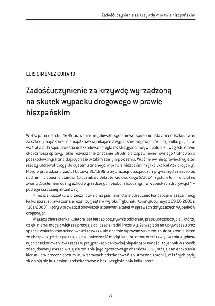 Zadośćuczynienie za krzywdę w prawie hiszpańskim LUIS GIMÉNEZ GUITARD Zadośćuczynienie za krzywdę wyrządzoną na skutek wypadku drogowego w prawie hiszpańskim W Hiszpanii do roku 1995 prawo nie regulowało systemowo sposobu ustalania odszkodowań za szkody majątkowe i niemajątkowe wynikające z wypadków drogowych. W przypadku gdy sprawa trafiała do sądu, kwestia odszkodowania była rozstrzygana indywidualnie z uwzględnieniem okoliczności sprawy. Takie rozwiązanie znacznie utrudniało zapewnienie równego traktowania poszkodowanych znajdujących się w takim samym położeniu. Właśnie ów niesprawiedliwy stan rzeczy utorował drogę do systemu znanego w prawie hiszpańskim jako „kalkulator drogowy”, który wprowadzony został Ustawą 30/1995 o organizacji ubezpieczeń prywatnych i nadzorze nad nimi, a obecnie stanowi Załącznik do Dekretu Królewskiego 8/2004. System ten – oficjalnie zwany „Systemem oceny szkód wyrządzonych osobom fizycznym w wypadkach drogowych” – podlega corocznej aktualizacji. Mimo iż z początku w orzecznictwie oraz piśmiennictwie odrzucano koncepcję wiążącej mocy kalkulatora, sprawa została rozstrzygnięta w wyroku Trybunału Konstytucyjnego z 29.06.2000 r. (181/2000), który wprowadził obowiązek stosowania tabel w sprawach dotyczących wypadków drogowych. Wiążący charakter kalkulatora jest bardzo pozytywnie odbierany przez ubezpieczycieli, którzy dzięki niemu mogą z większą precyzją obliczać składki i rezerwy. Ze względu na upływ czasu oraz spadek wskaźników szkodowości rozważa się obecnie wprowadzenie zmian do systemu. Mimo że ubezpieczyciele zgadzają się na konieczność modyfikacji systemu w celu zwiększenia wypłacanych odszkodowań, zwłaszcza w przypadkach całkowitej niepełnosprawności, to jednak w sposób zdecydowany sprzeciwiają się zmianie jego ryczałtowego charakteru i wyrażają zaniepokojenie kierunkiem orzecznictwa m.in. w sprawach odszkodowań za utracone zarobki, w których sądy skłaniają się ku ustalaniu odszkodowania bez uwzględniania kalkulatora. – 93 – Wiadomości Ubezpieczeniowe numer specjalny 2/2012 I. Stosowanie „Systemu oceny szkód wyrządzonych osobom fizycznym w wypadkach drogowych” (Załącznik do Dekretu Królewskiego 8/2004) Jak już wspomniano, Załącznik do Dekretu Królewskiego 8/2004 z 29 października 2004 r. w sprawie ujednolicenia przepisów o odpowiedzialności cywilnej i ubezpieczeniu w ruchu drogowym pojazdów mechanicznych, przewiduje wiążący dla sądów powszechnych system oceny szkód na osobie, powstałych wskutek wypadków drogowych. I. a) Rodzaje uszczerbków dających prawo do odszkodowania1: a) śmierć, b) trwałe obrażenia, niezależnie od ewentualnej niepełnosprawności czy inwalidztwa, c) czasowe ograniczenie funkcjonowania. Poza odszkodowaniem za każdy rodzaj szkody, zawsze bierze się pod uwagę także – i to bez ustalonego z góry limitu – koszty świadczeń medycznych i leków, poniesione do czasu wyzdrowienia lub utrwalenia się następstw, z zastrzeżeniem, że poniesione koszty muszą być uzasadnione ze względu na charakter udzielonych świadczeń. a) Śmierć Prawo przewiduje kilka różnych rodzajów odszkodowania (zadośćuczynienia) dla różnych członków rodziny zmarłego, w zależności od wieku oraz stopnia bliskości wobec zmarłego. Do wyszczególnionych kwot stosuje się szereg współczynników korygujących, które uwzględniają na przykład dochody zmarłego oraz warunki, w jakich znajduje się jego rodzina.2 b) Trwałe obrażenia b.1. Pojęcie trwałych obrażeń Pojęcie trwałych obrażeń dotyczy skutków, które nie ustępują wraz z upływem czasu. Przepisy zawierają rozbudowany i szczegółowy katalog obrażeń stanowiących podstawę żądania odszkodowania. Katalog ten sformułowany jest w terminologii medycznej i podzielony według części ciała. Warto zauważyć, że brak jest odrębnego traktowania bólu i cierpienia przy ustalaniu odszkodowania. Uważa się, że zadośćuczynienie za tego rodzaju krzywdę zawiera się już w odszkodowaniu orzeczonym z tytułu danego obrażenia. Natomiast jako odrębny tytuł do zadośćuczynienia traktuje się, będące następstwem wypadku, oszpecenie. 1. 2. Artykuł 1 ust. 5 Załącznika do Dekretu Królewskiego 8/2004 z 29 października 2004 r. w sprawie ujednolicenia przepisów o odpowiedzialności cywilnej i ubezpieczeniu w ruchu drogowym pojazdów mechanicznych. Tabele I i II Załącznika do Dekretu Królewskiego 8/2004 z 29 października 2004 r. w sprawie ujednolicenia przepisów o odpowiedzialności cywilnej i ubezpieczeniu w ruchu drogowym pojazdów mechanicznych. – 94 – Zadośćuczynienie za krzywdę w prawie hiszpańskim b.2. Inwalidztwo Współczynniki korygujące kwotę odszkodowania za trwałe obrażenia3 stosuje się przede wszystkim w przypadku trwałych obrażeń, które powodują poważne kalectwo (inwalidztwo) bądź niemożność wykonywania czynności zawodowych lub życiowych w zwykłym wymiarze. W tej kategorii zawierają się również dodatkowe kwoty niezbędne do adaptacji domu i samochodu poszkodowanego. Do współczynników korygujących z tego tytułu zalicza się ponadto utratę płodu przez ciężarną. c) Czasowe ograniczenie funkcjonowania Odszkodowanie z tytułu czasowego ograniczenia funkcjonowania poszkodowanego należy się za każdy dzień takiego stanu, przy czym rozróżnia się trzy odrębne kategorie tego rodzaju ograniczenia: c.1) czasowe ograniczenie funkcjonowania w związku z hospitalizacją, c.2) niezwiązane z hospitalizacją czasowe pełne ograniczenie funkcjonowania: oznacza niemożność wykonywania przez poszkodowanego czynności zawodowych lub życiowych w zwykłym wymiarze. Jak podano poniżej, obowiązujące w 2011 r. odszkodowanie za każdy dzień takich ograniczeń jest ryczałtowe i wynosi 55,27 EUR, c.3) niezwiązane z hospitalizacją czasowe niepełne ograniczenie funkcjonowania: ozn