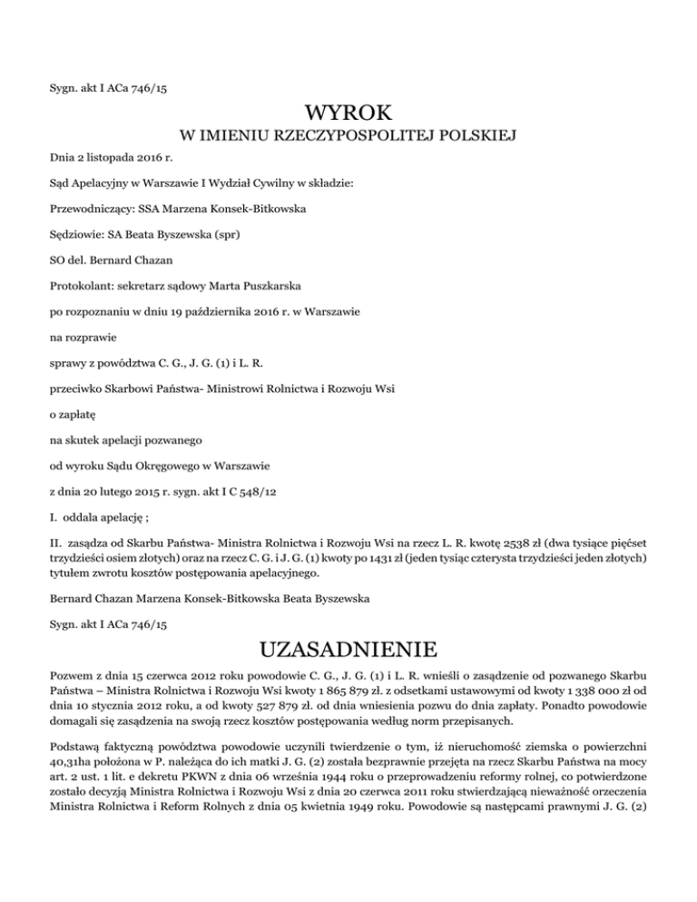 Sygn. akt I ACa 746/15 WYROK W IMIENIU RZECZYPOSPOLITEJ POLSKIEJ Dnia 2 listopada 2016 r. Sąd Apelacyjny w Warszawie I Wydział Cywilny w składzie: Przewodniczący: SSA Marzena Konsek-Bitkowska Sędziowie: SA Beata Byszewska (spr) SO del. Bernard Chazan Protokolant: sekretarz sądowy Marta Puszkarska po rozpoznaniu w dniu 19 października 2016 r. w Warszawie na rozprawie sprawy z powództwa C. G., J. G. (1) i L. R. przeciwko Skarbowi Państwa- Ministrowi Rolnictwa i Rozwoju Wsi o zapłatę na skutek apelacji pozwanego od wyroku Sądu Okręgowego w Warszawie z dnia 20 lutego 2015 r. sygn. akt I C 548/12 I. oddala apelację ; II. zasądza od Skarbu Państwa- Ministra Rolnictwa i Rozwoju Wsi na rzecz L. R. kwotę 2538 zł (dwa tysiące pięćset trzydzieści osiem złotych) oraz na rzecz C. G. i J. G. (1) kwoty po 1431 zł (jeden tysiąc czterysta trzydzieści jeden złotych) tytułem zwrotu kosztów postępowania apelacyjnego. Bernard Chazan Marzena Konsek-Bitkowska Beata Byszewska Sygn. akt I ACa 746/15 UZASADNIENIE Pozwem z dnia 15 czerwca 2012 roku powodowie C. G., J. G. (1) i L. R. wnieśli o zasądzenie od pozwanego Skarbu Państwa – Ministra Rolnictwa i Rozwoju Wsi kwoty 1 865 879 zł. z odsetkami ustawowymi od kwoty 1 338 000 zł od dnia 10 stycznia 2012 roku, a od kwoty 527 879 zł. od dnia wniesienia pozwu do dnia zapłaty. Ponadto powodowie domagali się zasądzenia na swoją rzecz kosztów postępowania według norm przepisanych. Podstawą faktyczną powództwa powodowie uczynili twierdzenie o tym, iż nieruchomość ziemska o powierzchni 40,31ha położona w P. należąca do ich matki J. G. (2) została bezprawnie przejęta na rzecz Skarbu Państwa na mocy art. 2 ust. 1 lit. e dekretu PKWN z dnia 06 września 1944 roku o przeprowadzeniu reformy rolnej, co potwierdzone zostało decyzją Ministra Rolnictwa i Rozwoju Wsi z dnia 20 czerwca 2011 roku stwierdzającą nieważność orzeczenia Ministra Rolnictwa i Reform Rolnych z dnia 05 kwietnia 1949 roku. Powodowie są następcami prawnymi J. G. (2) i stosownie do posiadanych udziałów w spadku domagają się zapłaty odszkodowania obejmującego nieruchomości oraz składniki gospodarstwa należącego do ich poprzedniczki prawnej ujęte w protokole w sprawie przejęcia na cele reformy rolnej z dnia 13 września 1949 roku, tj. zabudowania o wartości 600 000 zł., grunty o wartości 1 155 919 zł., inwentarz martwy o wartości 30 000 zł., produkty roślinne o wartości 48 000 zł., inwentarz żywy o wartości 31 960 zł. (k. 4). Powodowie wyjaśnili, że odsetek ustawowych od części dochodzonej kwoty odszkodowania, tj. od 1 338 000 zł. domagają się począwszy od dnia 10 stycznia 2012 roku do dnia zapłaty ze względu na doręczenie im w dniu 09 stycznia 2012 roku postanowienia Ministra Rolnictwa i Rozwoju Wsi z dnia 30 grudnia 2011 roku, na mocy którego zwrócono wniosek powodów o dobrowolne przyznanie odszkodowania na podstawie art. 160 § 1 i 3 k.p.a. W toku tamtego postępowania powodowie nie domagali się odszkodowania stanowiącego równowartości utraconego domu mieszkalnego z przyległym do niego gruntem licząc na zwrot w naturze. Jednak wobec ustalenia, że budynek mieszkalny z przyległym terenem nie stanowi już własności Skarbu Państwa lecz Gminy L., wartość odszkodowania została powiększona o ten składnik i dlatego odsetki ustawowe od kwoty 527 879 zł. należą się im od dnia wniesienia pozwu (k. 4-5). Powodowie wskazali art. 160 k.p.a. w brzmieniu sprzed 01 września 2004 roku jako podstawę prawną powództwa. Pozwany Skarb Państwa - Minister Rolnictwa i Rozwoju Wsi w odpowiedzi na pozew z dnia 01 października 2012 wniósł o oddalenie powództwa oraz zasądzenie od każdego z powodów kosztów procesu, w tym na podstawie art. 11 ust. 3 ustawy z dnia 08 lipca 2005 roku o Prokuratorii Generalnej Skarbu Państwa (Dz. U. nr 169, poz. 1417) na rzecz Skarbu Państwa – Prokuratorii Generalnej Skarbu Państwa kosztów zastępstwa procesowego. Ostatecznie w piśmie procesowym złożonym na rozprawie w dniu 06 lutego 2015 roku powodowie zmodyfikowali powództwo, wnosząc o zasądzenie od pozwanego kwoty 1 105 583,47 zł., zaś na rozprawie 06 lutego 2015 roku powodowie wskazali, że domagają się zasądzenia od pozwanego na rzecz powódki L. R. kwoty 513 133 zł., na rzecz C. i J. G. (1) kwot po 296 226 zł. z ustawowymi odsetkami od dnia 10 stycznia 2012 toku i cofnęli pozew w pozostałym zakresie ze zrzeczeniem się roszczenia. Wyjaśnili, że część odszkodowania przypadająca na rzecz L. R. jest większa wobec dokonania darowizny 10ha gruntu na jej rzecz w 1949 roku przez J. G. (2). Pozwany na tej rozprawie wniósł o oddalenie powództwa. Wyrokiem z dnia 20 lutego 2015 r. Sąd Okręgowy w Warszawie zasądza od pozwanego Skarbu Państwa - Ministra Rolnictwa i Rozwoju Wsi na rzecz C. G. i J. G. (1) kwoty po 296 226 zł z ustawowymi odsetkami od dnia 20 lutego 2015 roku do dnia zapłaty oraz na rzecz L. R. kwotę 512 590,38 zł- z ustawowymi odsetkami od dnia 20 lutego 2015 roku do dnia zapłaty, w pozostałym zakresie powództwo oddalił oraz rozstrzygnął o sposobie poniesienia kosztów procesu. Powyższy wyrok zapadł po dokonaniu przez Sąd Okręgowy następujących ustaleń faktycznych i rozważań prawnych: J. G. (2) była właścicielką nieruchomości ziemskiej położonej w P. powiecie (...) o powierzchni 40,3108ha na podstawie umowy sporządzonej w dniu 09 lutego 1926 roku przed notariuszem w P. A. T. za nr Rep.(...). Jej mąż A. G. stał się właścicielem nieruchomości ziemskiej położonej w P. o powierzchni 16,7962ha na podstawie umowy sporządzonej w dniu 12 maja 1933 roku przed notariuszem w P. A. W. za nr Rep.(...) Obydwie nieruchomości o łącznej powierzchni 56,44ha zostały przejęte na cele reformy rolnej na podstawie art. 2 ust. 1 lit. e dekretu PKWN z dnia 06 września 1944 roku o przeprowadzeniu reformy rolnej, co zostało ujawnione w protokole przejęcia z dnia 17 l