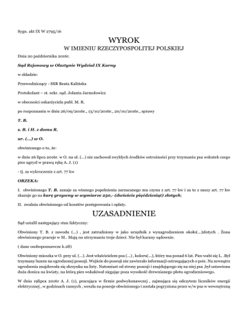 Sygn. akt IX W 2795/16 WYROK W IMIENIU RZECZYPOSPOLITEJ POLSKIEJ Dnia 20 października 2016r. Sąd Rejonowy w Olsztynie Wydział IX Karny w składzie: Przewodniczący - SSR Beata Kalińska Protokolant – st. sekr. sąd. Jolanta Jarmołowicz w obecności oskarżyciela publ. M. R. po rozpoznaniu w dniu 26/09/2016r., 13/10/2016r., 20/10/2016r., sprawy T. B. s. B. i H. z domu R. ur. (...) w O. obwinionego o to, że: w dniu 26 lipca 2016r. w O. na ul. (...) nie zachował zwykłych środków ostrożności przy trzymaniu psa wskutek czego pies ugryzł w prawą rękę A. J. (1) - tj. za wykroczenie z art. 77 kw ORZEKA: I. obwinionego T. B. uznaje za winnego popełnienia zarzucanego mu czynu z art. 77 kw i za to z mocy art. 77 kw skazuje go na karę grzywny w wymiarze 250,- (dwieście pięćdziesiąt) złotych; II. zwalnia obwinionego od kosztów postępowania i opłaty. UZASADNIENIE Sąd ustalił następujący stan faktyczny: Obwiniony T. B. z zawodu (...) , jest zatrudniony w jako urzędnik z wynagrodzeniem około(...)złotych . Żona obwinionego pracuje w M.. Mają na utrzymaniu troje dzieci. Nie był karany sądownie. ( dane osobopoznawcze k.28) Obwiniony mieszka w O. przy ul. (...). Jest właścicielem psa (...) , koloru(...), który ma ponad 6 lat. Pies wabi się L. .Był trzymany luzem na ogrodzonej posesji. Wejście do posesji nie zawierało informacji ostrzegających o psie. Na zewnątrz ogrodzenia znajdowała się skrzynka na listy. Natomiast od strony posesji i znajdującego się na niej psa ,był ustawiona duża donica na kwiaty, na którą pies wskakiwał sięgając poza wysokość drewnianego płotu ogrodzeniowego. W dniu 19lipca 2016r A. J. (1), pracująca w firmie podwykonawczej , zajmująca się odczytem liczników energii elektrycznej , w godzinach rannych , weszła na posesje obwinionego i została pogryziona przez w/w psa w wewnętrzną część uda lewego. .Przed wejściem nie było żadnej tablicy ostrzegającej o obecności psa na posesji. A. J. udała się w dniu 20.07.2016r. do lekarza , który sporządził obdukcję wraz z zaleceniami ,w tym szczepienie przeciwtężcowe. Pokrzywdzona w związku z zakupem leków w dniu 20.07.2107r .,wykonała ksero paragonu z apteki na kwotę 58,43 zł. Na odwrocie kartki zamieściła dodatkową informację wraz z numerem konta , na które prosiła o przelanie kwoty pieniędzy określonej na paragonie. Jednocześnie zawarła prośbę o zamontowanie tabliczki na furtce ,informującej o posiadaniu psa oraz o konsekwencjach związanych z dalszym jej brakiem. W dniu 26.07.2016r. ponownie udała się do obwinionego wraz z w/w kartką . Będąc przed bramą wejściową , zbliżyła się do zamontowanej na zewnątrz skrzynki pocztowej by wrzucić kartkę . W trakcie jej wrzucania, po uniesieniu wieka od skrzynki, został ugryziona przez psa obwinionego. Pies ten wskoczył na donicę stojącą w pobliżu furtki , podskoczył i ugryzł pokrzywdzoną w prawe ramię . Nikogo wówczas nie było na posesji. .Pokrzywdzona ponownie udała się o obdukcję lekarską , gdzie założono jej opatrunek . Obwiniony w dniu 28.07.2016r. dokonał przelewu kwoty 58,43 zł na konto pokrzywdzonej , jak dopisał „Dla Św. spokoju.” A. K. (1) dzielnicowy, przyjmujący zawiadomienie o popełnieniu wykroczenia , po udaniu się na posesję obwinionego ,początkowo miał wątpliwości czy mały pies był w stanie tak wysoko skoczyć ,by ugryźć w ramię pokrzywdzoną. Dopiero po wejściu na posesję stwierdził ,że pod płotem stoi wielka donica, praktyczne do wysokości połowy płotu ,na która pies wskakiwał . Agresywnie reagował na ludzi, i po wskoczeniu na donicę mógł ugryźć pokrzywdzoną.. ( d. oryginał kartki pokrzywdzonej k.26, karta leczenia szpitalnego z 20.07.2019r k.34, oraz z dnia 26.07.2016 k.33,skierowanie do poradni specjalistycznej k.35 , duplikat wykonania przelewu k.27,r, zaświadczenie przeciwko wściekliźnie k.39, szczepienia k.40.zeznania A. J. k.36-36 verte, A. K. k.37) Obwiniony T. B. nie przyznał się do popełnia zrzucanego mu wykroczenia. Wyjaśnił , że tydzień przed zdarzeniem ,objętym zarzutem , pokrzywdzona weszła bez uprzedzenia na teren jego posesji . W tym czasie jego pies był z matką w ogrodzie. Pies po usłyszeniu dźwięku ,otwieranej furtki pobiegł do pokrzywdzonej. O tym , że pokrzywdzona została ugryziona w udo ,dowiedział się od matki .Sam w tym czasie przebywał w pracy. Obwiniony zaprzeczył by jego pies (...) był agresywny. Określił go jako ułożonego , posłusznego . Nic nie widział na temat drugiego pogryzienia. Myślał , że to pomyłka, kiedy w dniu 30.07.2016r. otrzymał wezwanie od Powiatowego lekarza weterynarii. Potwierdził , że wykonał przelew a rzecz pokrzywdzonej ,po zapoznaniu się z treścią kartki pozostawionej przez pokrzywdzona w skrzynce na listy. O drugim pogryzieniu w ramię , dowiedział się od dzielnicowego. Podał , że tabliczka z napisem „Uwaga zły pies pojawiła się w dniu 22.07.2016r.Nastapiło to po pierwszym pogryzieniu , gdy pokrzywdzona przyszła po dowód szczepienia psa. Twierdził , że ta tabliczka wisiała również w dniu 26.07r. 2016r. kiedy pokrzywdzona przyszła jeszcze raz. Wyrażał pretensje , dlaczego pokrzywdzona po pierwszym pogryzieniu, przyszła ponownie i jak określił „ dała się pogryźć przez mojego psa”. ( d. wyjaśniania obwinionego k.28-28 verte verte) Sąd nie dał wiary wyjaśnieniom obwinionego w takim zakresie ,w jaki pozostają sprzecznymi z ustaleniami dowodowymi w przedmiotowej sprawie. Wskazać należy , że mimo formalnego nie przyznania się , obwiniony w swoich wyjaśnieniach nie wykluczył , że jego pies zaatakował i ugryzł pokrzywdzoną . Nie dostrzega jednak po swojej stronie żadnych uchybień .Zaprzeczył , że pies jest agresywny . Podał , że to nie zachowanie psa było niewłaściwe ,ale zachowanie pokrzywdzonej , która dała mu się pogryźć . Tym bardziej , że skoro w dniu 19.07.2016r, przyszła od