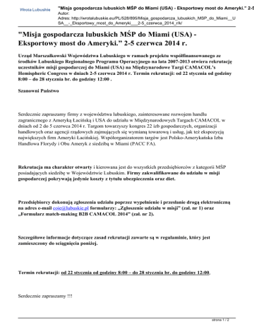 "Misja gospodarcza lubuskich MŚP do Miami (USA) - Eksportowy most do Ameryki.” 2-5 Autor: Adres: http://wrotalubuskie.eu/PL/528/895/Misja_gospodarcza_lubuskich_MSP_do_Miami__U SA__-_Eksportowy_most_do_Ameryki___2-5_czerwca_2014_r/k/ "Misja gospodarcza lubuskich MŚP do Miami (USA) Eksportowy most do Ameryki.” 2-5 czerwca 2014 r. Urząd Marszałkowski Województwa Lubuskiego w ramach projektu współfinansowanego ze środków Lubuskiego Regionalnego Programu Operacyjnego na lata 2007-2013 otwiera rekrutację uczestników misji gospodarczej do Miami (USA) na Międzynarodowe Targi CAMACOL’s Hemispheric Congress w dniach 2-5 czerwca 2014 r. Termin rekrutacji: od 22 stycznia od godziny 8:00 – do 28 stycznia br. do godziny 12:00 . Szanowni Państwo Serdecznie zapraszamy firmy z województwa lubuskiego, zainteresowane rozwojem handlu zagranicznego z Ameryką Łacińską i USA do udziału w Międzynarodowych Targach CAMACOL w dniach od 2 do 5 czerwca 2014 r. Targom towarzyszy kongres 22 izb gospodarczych, organizacji handlowych oraz agencji rządowych zajmujących się wymianą towarową i usług, jak też ekspozycją największych firm Ameryki Łacińskiej. Współorganizatorem targów jest Polsko-Amerykańska Izba Handlowa Florydy i Obu Ameryk z siedzibą w Miami (PACC FA). Rekrutacja ma charakter otwarty i kierowana jest do wszystkich przedsiębiorców z kategorii MŚP posiadających siedzibę w Województwie Lubuskim. Firmy zakwalifikowane do udziału w misji gospodarczej pokrywają jedynie koszty z tytułu ubezpieczenia oraz diet. Przedsiębiorcy dokonują zgłoszenia udziału poprzez wypełnienie i przesłanie drogą elektroniczną na adres e-mail [email protected] formularzy: „Zgłoszenie udziału w misji” (zał. nr 1) oraz „Formularz match-making B2B CAMACOL 2014” (zał. nr 2). Szczegółowe informacje dotyczące zasad rekrutacji zawarte są w regulaminie, który jest zamieszczony do sciągnięcia poniżej. Termin rekrutacji: od 22 stycznia od godziny 8:00 – do 28 stycznia br. do godziny 12:00. Serdecznie zapraszamy !!! strona 1 / 2 "Misja gospodarcza lubuskich MŚP do Miami (USA) - Eksportowy most do Ameryki.” 2-5 Autor: Adres: http://wrotalubuskie.eu/PL/528/895/Misja_gospodarcza_lubuskich_MSP_do_Miami__U SA__-_Eksportowy_most_do_Ameryki___2-5_czerwca_2014_r/k/ strona 2 / 2 Powered by TCPDF (www.tcpdf.org)