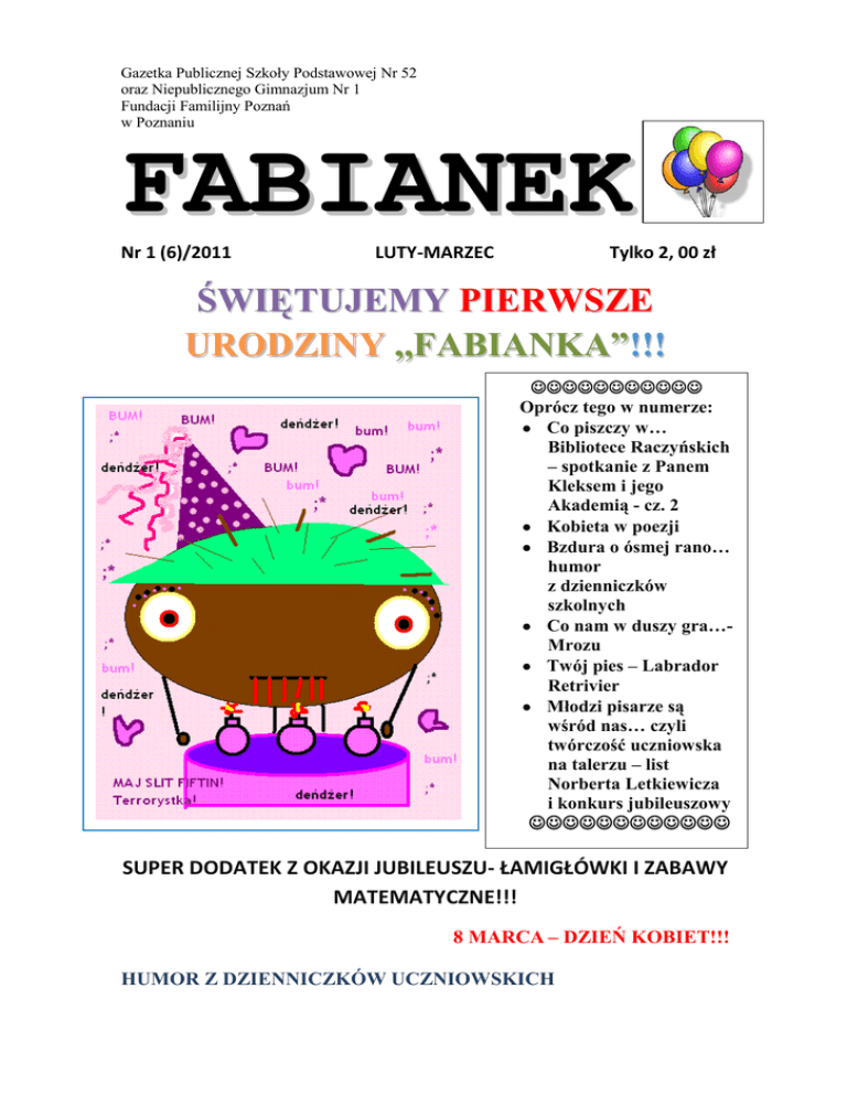 Gazetka Publicznej Szkoły Podstawowej Nr 52 oraz Niepublicznego Gimnazjum Nr 1 Fundacji Familijny Poznań w Poznaniu FABIANEK Nr 1 (6)/2011 LUTY-MARZEC Tylko 2, 00 zł ŚWIĘTUJEMY PIERWSZE URODZINY ,,FABIANKA”!!! Oprócz tego w numerze: Co piszczy w… Bibliotece Raczyńskich – spotkanie z Panem Kleksem i jego Akademią - cz. 2 Kobieta w poezji Bzdura o ósmej rano… humor z dzienniczków szkolnych Co nam w duszy gra…Mrozu Twój pies – Labrador Retrivier Młodzi pisarze są wśród nas… czyli twórczość uczniowska na talerzu – list Norberta Letkiewicza i konkurs jubileuszowy SUPER DODATEK Z OKAZJI JUBILEUSZU- ŁAMIGŁÓWKI I ZABAWY MATEMATYCZNE!!! 8 MARCA – DZIEŃ KOBIET!!! HUMOR Z DZIENNICZKÓW UCZNIOWSKICH OD REDAKCJI… Drodzy Drodzy Czytelnicy! Macie przed sobą szósty numer ,,Fabianka”, który obchodzi właśnie swoją pierwszą rocznicę istnienia. Dokładnie w lutym zeszłego roku trafiło do Was pierwsze wydanie pisma, poświęcone obchodom dnia zakochanych. Liczyło ono osiemnaście stron. W tym roku w Wasze ręce powierzamy dwadzieścia sześć stron tekstu. Z okazji obchodzonej rocznicy przygotowaliśmy też super dodatek specjalny z łamigłówkami matematycznymi. Zachęcamy Was też do wzięcia udziału w organizowanym przez członków koła polonistycznego gimnazjum konkursu recytatorskiego o nazwie ,,Miłość w poezji”. Dziękujemy Wam za to, że przez cały ten czas byliście z nami i zachęcamy Was do dalszej współpracy!!! Monika Szymańska oraz członkowie koła polonistycznego KĄCIK ASTROLOGICZNY SYMBOLIKA ZNAKÓW ZODIAKU Symbolika Barana Drzewa – głóg, drzewa iglaste Dzień- wtorek Owoce- cytrusy, pomarańcze, cytryny, grejpfruty Przedmioty- wybory z żelaza lub stali Kolory- czerwień Kwiaty-mięta, przestęp, oset Zwierzęta- baran, wilk, pszczoła, osa Kamienie- chalcedon, diament, jaspis, rubin Symbolika Bliźniąt Owoce- kasztan, daktyle, morele Kamienie- perła, agat, topaz, krwawnik Kolory- żółty, brązowy, niebieski Kwiaty- lawenda, konwalia, paproć, mirt Dzień- środa Drzewa- orzech, kasztanowiec, migdałowiec Zwierzęta- ptaki, papuga, paw, małpa Symbolika Lwa Drzewa- oliwne, pomarańczowe, palma, cytrynowiec, orzech Kwiaty- słonecznik, nagietek, Dzień- niedziela Kolory- czerwony, pomarańczowy, żółty, złoty, brązowy Zwierzęta- koty, lwy, rysie Owoce- winogrona Kamienie- rubin, jaspis, chryzolit Symbolika Byka Drzewa- figowiec, winorośl, cyprys Dzień- piątek Kolory- niebieski, różowy, jasnozielony Owoce- jabłko, gruszka, porzeczki, winogrona, śliwki Metale- miedź Zapachy- piżmo Liczby- 7 Zwierzęta- wół Kamienie- szafir, szmaragd, koral Kwiaty-róża, mak, fiołek, stokrotka Symbolika Raka Drzewa- wszystkie zwłaszcza te silnie pylące Dzień- poniedziałek Kolory- niebieski, grafitowy, srebrzysty, jasnozielony Zwierzęta- kaczka, kot, koza, żaba, świnia, pszczoła, kura, krowa Owoce- wszystkie Kamienie- perła, kwarc, chalcedon, kamień księżycowy Kwiaty- białe, lilia, biała róża Symbolika Panny Drzewa- z suchymi owocami Dzień- środa Kolory- granatowy, fioletowy, zielony Zwierzęta – domowe, kot i pies Owoce- orzech laskowy, morele, daktyle Kamienie- agat, chalcedon, szmaragd, topaz Kwiaty-mniszek pospolity, gajowiec żółty Symbolika Wagi Drzewa- brzoza, cyprys jabłoń ,winorośl, lipa Kwiaty- róże, kwiaty niebieskie, fiołki, stokrotki Dzień- piątek Owoce- banany, czereśnie, truskawki, jabłka, gruszki, śliwki Kamienie- agat, koral, szmaragd, perła, szafir, turkus Zwierzęta – sarna, motyl, gołąb, ptaki śpiewające Symbolika Strzelca Drzewa- brzoza, kasztanowiec, cytrynowiec, morwa Kamienie-ametyst, szafir, topaz Zwierzęta-koń, sowa, słoń, łoś Dzień- czwartek Kolory-ciemnoniebieski, jasnoniebieski Kwiaty-mniszek pospolity, jaśmin, goździk Symbolika Wodnika Drzewa- owocowe- czereśnie, grusza, jabłoń Kamienie- bursztyn, ametyst, bazalt Zwierzęta- orzeł, jeż, dzik, słoń, sowa Dni- czwartek, sobota Owoce- suszone i pestkowe, kiwi Symbolika Skorpiona Drzewa- krzewy, drzewa kolczaste i iglaste Kwiaty- pelargonia, Zwierzęta- koty, hieny, owady, skorpiony Kolory- ciemna czerwień, brąz, cynober Owoce- cytrusy Kamienie-ametyst, chryzopraz, opal, rubin, jaspis Symbolika Koziorożca Drzewa- dąb, olcha, świerk, topola, palma, wierzba Zwierzęta- osioł, kozioł, wielbłąd, koń, pies, świnia, szczur Kolory-ciemny brąz, zieleń, czarny Dzień- sobota Owoce-ananas, owoc, kiwi Kamienie- ametyst, czarny diament, onyks, turkus, Kwiaty- bluszcz, bratek Symbolika Ryb Drzewa- figowiec, topola, Zwierzęta – ryby, meduzy, krokodyle, mewy Kolory- granatowy, szarozielony Owoce- topaz, szafir, opal, kamień księżycowy Kwiaty- niezapominajka Dzień- środa CHIŃSKIE CIASTECZKO Wybierz jeden numer wśród cyfr od 1 do 10…i zajrzyj na kolejną stronę, by odczytać przepowiednię! Chińskie ciasteczko: 1. Dobry to czas na zawieranie nowych znajomości. 2. Poczynisz nagły postęp w pewnej dziedzinie swego życia. 3. Jesteś szczęśliwym człowiekiem, nawet jeśli o tym nie wiesz. 4. Świat jest zawsze gotów przyjąć z otwartymi ramionami nowy talent. 5. Nic na tym świecie nie będzie wielkim sukcesem bez pasji. 6. Życie jest tragedią dla tych co czują i komedią dla tych co myślą. 7. Niczego w życiu nie trzeba się bać, należy tylko zrozumieć. 8. W przypływie wielkiej radości nie obiecuj nikomu niczego. W przypływie wielkiego gniewu nie odpisuj na listy. 9. Głębokie wątpliwości, głęboka mądrość. Małe wątpliwości, mała mądrość. 10. Nie ma mądrości większej niż życzliwość. CIEKAWOSTKI ASTROLOGICZNE z przymrużeniem oka;) Strach ma wielkie oczy! Jest częścią naszego życia. Naturalne uczucie, które towarzyszy ludzkości od początków jej istnienia. Od czasu d czasu boimy się wszyscy, nie ma chyba na świecie zdrowego człowieka, który nigdy nie zaznałby lęku. Boją się nie tylko ludzie, ale i zwierzęta. Strach może uratować