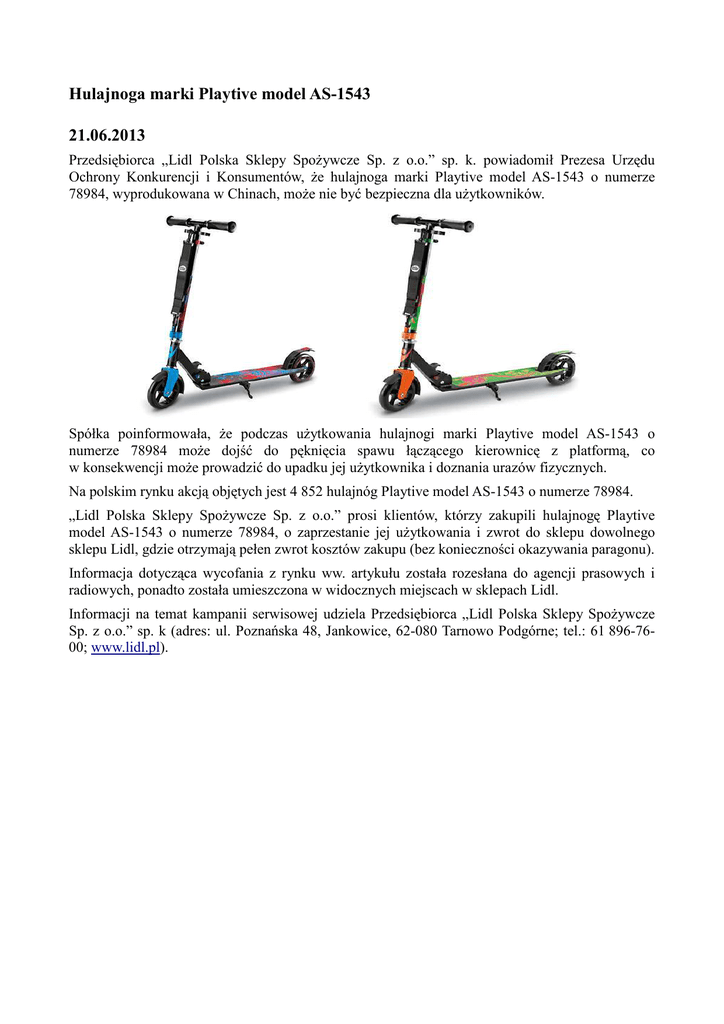 Hulajnoga marki Playtive model AS-1543 21.06.2013 Przedsiębiorca „Lidl Polska Sklepy Spożywcze Sp. z o.o.” sp. k. powiadomił Prezesa Urzędu Ochrony Konkurencji i Konsumentów, że hulajnoga marki Playtive model AS-1543 o numerze 78984, wyprodukowana w Chinach, może nie być bezpieczna dla użytkowników. Spółka poinformowała, że podczas użytkowania hulajnogi marki Playtive model AS-1543 o numerze 78984 może dojść do pęknięcia spawu łączącego kierownicę z platformą, co w konsekwencji może prowadzić do upadku jej użytkownika i doznania urazów fizycznych. Na polskim rynku akcją objętych jest 4 852 hulajnóg Playtive model AS-1543 o numerze 78984. „Lidl Polska Sklepy Spożywcze Sp. z o.o.” prosi klientów, którzy zakupili hulajnogę Playtive model AS-1543 o numerze 78984, o zaprzestanie jej użytkowania i zwrot do sklepu dowolnego sklepu Lidl, gdzie otrzymają pełen zwrot kosztów zakupu (bez konieczności okazywania paragonu). Informacja dotycząca wycofania z rynku ww. artykułu została rozesłana do agencji prasowych i radiowych, ponadto została umieszczona w widocznych miejscach w sklepach Lidl. Informacji na temat kampanii serwisowej udziela Przedsiębiorca „Lidl Polska Sklepy Spożywcze Sp. z o.o.” sp. k (adres: ul. Poznańska 48, Jankowice, 62-080 Tarnowo Podgórne; tel.: 61 896-7600; www.lidl.pl).
