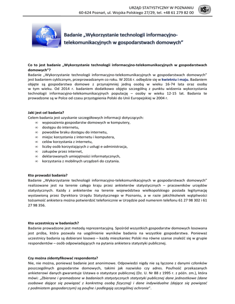 URZĄD STATYSTYCZNY W POZNANIU 60-624 Poznań, ul. Wojska Polskiego 27/29, tel. +48 61 279 82 00 Badanie „Wykorzystanie technologii informacyjnotelekomunikacyjnych w gospodarstwach domowych” Co to jest badanie „Wykorzystanie technologii informacyjno-telekomunikacyjnych w gospodarstwach domowych”? Badanie „Wykorzystanie technologii informacyjno-telekomunikacyjnych w gospodarstwach domowych” jest badaniem cyklicznym, przeprowadzanym co roku. W 2016 r. odbędzie się w kwietniu i maju. Badaniem objęte są gospodarstwa domowe z przynajmniej jedną osobą w wieku 16-74 lata oraz osoby w tym wieku. Od 2014 r. badaniem dodatkowo objęto szczególną z punktu widzenia wykorzystania technologii informacyjno-telekomunikacyjnych populację – osoby w wieku 12-15 lat. Badania te prowadzone są w Polce od czasu przystąpienia Polski do Unii Europejskiej w 2004 r. Jaki jest cel badania? Celem badania jest uzyskanie szczegółowych informacji dotyczących: • wyposażenia gospodarstw domowych w komputery, • dostępu do internetu, • powodów braku dostępu do internetu, • miejsc korzystania z internetu i komputera, • celów korzystania z internetu, • liczby osób korzystających z usługi e-administracja, • zakupów przez internet, • deklarowanych umiejętności informatycznych, • korzystania z mobilnych urządzeń do czytania. Kto prowadzi badania? Badanie „Wykorzystanie technologii informacyjno-telekomunikacyjnych w gospodarstwach domowych” realizowane jest na terenie całego kraju przez ankieterów statystycznych – pracowników urzędów statystycznych. Każdy z ankieterów na terenie województwa wielkopolskiego posiada legitymację wystawioną przez Dyrektora Urzędu Statystycznego w Poznaniu, a w razie jakichkolwiek wątpliwości tożsamość ankietera można potwierdzić telefonicznie w Urzędzie pod numerem telefonu 61 27 98 302 i 61 27 98 356. Kto uczestniczy w badaniach? Badanie prowadzone jest metodą reprezentacyjną. Spośród wszystkich gospodarstw domowych losowana jest próba, która pozwala na uogólnienie wyników badania na wszystkie gospodarstwa. Ponieważ uczestnicy badania są dobierani losowo – każdy mieszkaniec Polski ma równe szanse znaleźć się w grupie respondentów – osób odpowiadających na pytania ankietera statystyki publicznej. Czy można zidentyfikować respondenta? Nie, nie można, ponieważ badanie jest anonimowe. Odpowiedzi nigdy nie są łączone z danymi członków poszczególnych gospodarstw domowych, takimi jak nazwisko czy adres. Poufność przekazanych ankieterowi danych gwarantuje Ustawa o statystyce publicznej (Dz. U. Nr 88 z 1995 r. z późn. zm.), która mówi: „Zbierane i gromadzone w badaniach statystycznych statystyki publicznej dane jednostkowe (dane osobowe dające się powiązać z konkretną osobą fizyczną) i dane indywidualne (dające się powiązać z podmiotem gospodarczym) są poufne i podlegają szczególnej ochronie”. URZĄD STATYSTYCZNY W POZNANIU 60-624 Poznań, ul. Wojska Polskiego 27/29, tel. +48 61 279 82 00 Dlaczego warto wziąć udział w badaniu ankietowym? Wyniki badania „Wykorzystanie technologii informacyjno-telekomunikacyjnych w gospodarstwach domowych” pozwolą ocenić skalę zmian zachodzących w życiu obywateli na skutek korzystania z komputerów i internetu, ocenić rozwój rynku e-usług oraz skuteczność działań państwa w zakresie e-administracji. Co się dzieje z odpowiedziami respondenta? Wszystkie informacje zebrane w badaniu są dostępne jedynie dla pracowników statystyki publicznej zobowiązanych do zachowania tajemnicy statystycznej. Po przeprowadzeniu analiz i opracowaniu danych są one publikowane w formie zbiorczych tablic wynikowych, diagramów, wykresów czy map. Z wynikami badań można zapoznać się korzystając z roczników statystycznych, biuletynów i innych publikacji statystycznych, udostępnianych w formie papierowej, na płytach CD oraz w internecie (www.stat.gov.pl). Przykłady wynikowych informacji statystycznych: Wyposażenie gospodarstw domowych w komputery w 2014 r. Dostęp do internetu w gospodarstwach domowych (w % ogółu gospodarstw) 59,1 Powody braku dostępu do internetu w domu w 2014 r. (w % gospodarstw bez dostępu do tej sieci) Źródło: „Wykorzystanie technologii informacyjno-(tele)komunikacyjnych w przedsiębiorstwach i gospodarstwach domowych w 2013 r. Więcej informacji o badaniach ankietowych na stronie http://form.stat.gov.pl/BadaniaAnkietowe/2016/index.htm oraz http://poznan.stat.gov.pl/co-gdzie-jak-zalatwic/gdy-skontaktuje-sie-z-nami-ankieter/ URZĄD STATYSTYCZNY W POZNANIU 60-624 Poznań, ul. Wojska Polskiego 27/29, tel. +48 61 279 82 00
