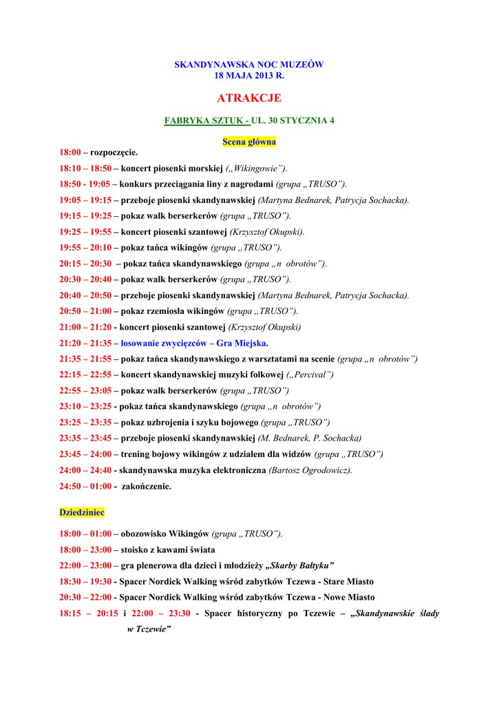 SKANDYNAWSKA NOC MUZEÓW 18 MAJA 2013 R. ATRAKCJE FABRYKA SZTUK - UL. 30 STYCZNIA 4 Scena główna 18:00 – rozpoczęcie. 18:10 – 18:50 – koncert piosenki morskiej („Wikingowie”). 18:50 - 19:05 – konkurs przeciągania liny z nagrodami (grupa „TRUSO”). 19:05 – 19:15 – przeboje piosenki skandynawskiej (Martyna Bednarek, Patrycja Sochacka). 19:15 – 19:25 – pokaz walk berserkerów (grupa „TRUSO”). 19:25 – 19:55 – koncert piosenki szantowej (Krzysztof Okupski). 19:55 – 20:10 – pokaz tańca wikingów (grupa „TRUSO”). 20:15 – 20:30 – pokaz tańca skandynawskiego (grupa „n obrotów”). 20:30 – 20:40 – pokaz walk berserkerów (grupa „TRUSO”). 20:40 – 20:50 – przeboje piosenki skandynawskiej (Martyna Bednarek, Patrycja Sochacka). 20:50 – 21:00 – pokaz rzemiosła wikingów (grupa „TRUSO”). 21:00 – 21:20 - koncert piosenki szantowej (Krzysztof Okupski) 21:20 – 21:35 – losowanie zwycięzców – Gra Miejska. 21:35 – 21:55 – pokaz tańca skandynawskiego z warsztatami na scenie (grupa „n obrotów”) 22:15 – 22:55 – koncert skandynawskiej muzyki folkowej („Percival”) 22:55 – 23:05 – pokaz walk berserkerów (grupa „TRUSO”) 23:10 – 23:25 - pokaz tańca skandynawskiego (grupa „n obrotów”) 23:25 – 23:35 – pokaz uzbrojenia i szyku bojowego (grupa „TRUSO”) 23:35 – 23:45 – przeboje piosenki skandynawskiej (M. Bednarek, P. Sochacka) 23:45 – 24:00 – trening bojowy wikingów z udziałem dla widzów (grupa „TRUSO”) 24:00 – 24:40 - skandynawska muzyka elektroniczna (Bartosz Ogrodowicz). 24:50 – 01:00 - zakończenie. Dziedziniec 18:00 – 01:00 – obozowisko Wikingów (grupa „TRUSO”). 18:00 – 23:00 – stoisko z kawami świata 22:00 – 23:00 – gra plenerowa dla dzieci i młodzieży „Skarby Bałtyku” 18:30 – 19:30 - Spacer Nordick Walking wśród zabytków Tczewa - Stare Miasto 20:30 – 22:00 - Spacer Nordick Walking wśród zabytków Tczewa - Nowe Miasto 18:15 – 20:15 i 22:00 – 23:30 - Spacer historyczny po Tczewie – „Skandynawskie ślady w Tczewie” Budynek główny Fabryki Sztuk Parter 18:00 – 01:00 – wystawa „Browarnictwo w Tczewie” - wystawa „Siła i delikatność. Poezja Tomasa Tranströmera” (Ambasada Szwecji) 18:15 – 21:00 – Gra Miejska „Poszukiwanie skarbu Wikinga” I piętro 18:00 – 01:00 – wystawa „Z Forsterami i Cookiem na kraniec świata” II piętro (sala konferencyjna) 18:10 – 19:10 – prelekcja podróżnicza „ Islandia- wyspa ognia i lodu” (dr Zdzisław Preisner) 19:20 – 20:20 - prelekcja „Norwegia: nie tylko trolle, fiordy i wieże wiertnicze” (dr Maria Sibińska) 20:30 – 21:30 - prelekcja „Życie codzienne w Szwecji” (prof. Hieronim Chojnacki) 21:45 – 22:45 - prelekcja „Między Europą a Skandynawią. Dania – kraj mały lecz ciekawy” (dr Agata Lubowicka) 23:00 – 24:00 - prelekcja podróżnicza „Podróż po Norwegii” (Andrzej Grzyb) 18:00 – 01:00 – wystawa „Szwecja – pejzaże powieści kryminalnej” (Ambasada Szwecji) Mały Budynek parter 18:30 – 21:00 - „Mały Wiking” warsztaty plastyczne dla dzieci i młodzieży. I piętro 18:15 – 19:15 – warsztaty tradycyjnego tańca skandynawskiego - Rundpolska (grupa „n obrotów”) 20:00 – 20:45 – prelekcja „W łunie zorzy polarnej. Finlandia – jej tradycje narodowe, święta oraz kuchnia” (Zofia Wojtysiak) 21:00 – 21:45 – prelekcja „Stół szwedzki – kulinarna podróż do serca Skandynawii”(Monika Dunajska) II piętro 20:00 – 21:00 - warsztaty bębniarskie (zespół „Percival”) 22:15 – 24:00 – prelekcja „Piwowarstwo w Skandynawii” (Michał Dąbrowski) KAMIENICA PRZY UL. PODMURNEJ 12 Spotkanie z bajką skandynawską (Tomasz Olczak) 18:00 – 21:15 Warsztaty „Street art” 18:00 - 19:30 19:30 – 21:00 21:00 – 22:30 Zwiedzanie wystaw 18:00 – 24:00 – „W mieszczańskiej kamienicy” KAMIENICA PRZY UL. PODMURNEJ 15 Projekcje filmów duńskich (Duński Instytut Kultury) 18:15 – 19:30 („Wielki niedźwiedź”, kino familijne) 20:00 – 21:30 („Karla i Jonas”, kino familijne) 21:45 – 23:30 („Uczta Babette”, film obyczajowy) Zwiedzanie wystaw 18:00 – 24:30 – „Tczew poprzez wieki i zdarzenia” 18:00 – 24:30 – „Wielka wojna w małym mieście”