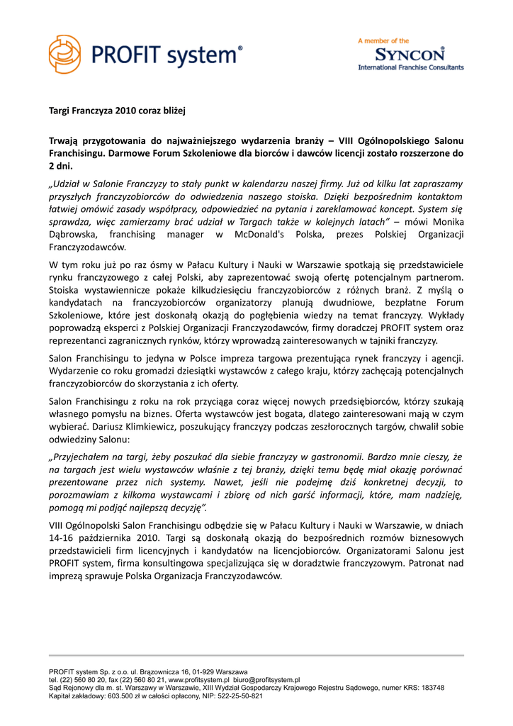Targi Franczyza 2010 coraz bliżej Trwają przygotowania do najważniejszego wydarzenia branży – VIII Ogólnopolskiego Salonu Franchisingu. Darmowe Forum Szkoleniowe dla biorców i dawców licencji zostało rozszerzone do 2 dni. „Udział w Salonie Franczyzy to stały punkt w kalendarzu naszej firmy. Już od kilku lat zapraszamy przyszłych franczyzobiorców do odwiedzenia naszego stoiska. Dzięki bezpośrednim kontaktom łatwiej omówić zasady współpracy, odpowiedzieć na pytania i zareklamować koncept. System się sprawdza, więc zamierzamy brać udział w Targach także w kolejnych latach” – mówi Monika Dąbrowska, franchising manager w McDonald's Polska, prezes Polskiej Organizacji Franczyzodawców. W tym roku już po raz ósmy w Pałacu Kultury i Nauki w Warszawie spotkają się przedstawiciele rynku franczyzowego z całej Polski, aby zaprezentować swoją ofertę potencjalnym partnerom. Stoiska wystawiennicze pokaże kilkudziesięciu franczyzobiorców z różnych branż. Z myślą o kandydatach na franczyzobiorców organizatorzy planują dwudniowe, bezpłatne Forum Szkoleniowe, które jest doskonałą okazją do pogłębienia wiedzy na temat franczyzy. Wykłady poprowadzą eksperci z Polskiej Organizacji Franczyzodawców, firmy doradczej PROFIT system oraz reprezentanci zagranicznych rynków, którzy wprowadzą zainteresowanych w tajniki franczyzy. Salon Franchisingu to jedyna w Polsce impreza targowa prezentująca rynek franczyzy i agencji. Wydarzenie co roku gromadzi dziesiątki wystawców z całego kraju, którzy zachęcają potencjalnych franczyzobiorców do skorzystania z ich oferty. Salon Franchisingu z roku na rok przyciąga coraz więcej nowych przedsiębiorców, którzy szukają własnego pomysłu na biznes. Oferta wystawców jest bogata, dlatego zainteresowani mają w czym wybierać. Dariusz Klimkiewicz, poszukujący franczyzy podczas zeszłorocznych targów, chwalił sobie odwiedziny Salonu: „Przyjechałem na targi, żeby poszukać dla siebie franczyzy w gastronomii. Bardzo mnie cieszy, że na targach jest wielu wystawców właśnie z tej branży, dzięki temu będę miał okazję porównać prezentowane przez nich systemy. Nawet, jeśli nie podejmę dziś konkretnej decyzji, to porozmawiam z kilkoma wystawcami i zbiorę od nich garść informacji, które, mam nadzieję, pomogą mi podjąć najlepszą decyzję”. VIII Ogólnopolski Salon Franchisingu odbędzie się w Pałacu Kultury i Nauki w Warszawie, w dniach 14-16 października 2010. Targi są doskonałą okazją do bezpośrednich rozmów biznesowych przedstawicieli firm licencyjnych i kandydatów na licencjobiorców. Organizatorami Salonu jest PROFIT system, firma konsultingowa specjalizująca się w doradztwie franczyzowym. Patronat nad imprezą sprawuje Polska Organizacja Franczyzodawców. PROFIT system Sp. z o.o. ul. Brązownicza 16, 01-929 Warszawa tel. (22) 560 80 20, fax (22) 560 80 21, www.profitsystem.pl [email protected] Sąd Rejonowy dla m. st. Warszawy w Warszawie, XIII Wydział Gospodarczy Krajowego Rejestru Sądowego, numer KRS: 183748 Kapitał zakładowy: 603.500 zł w całości opłacony, NIP: 522-25-50-821
