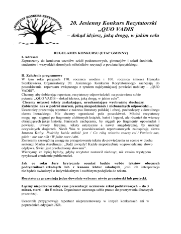 20. Jesienny Konkurs Recytatorski „QUO VADIS – dokąd idziesz, jaką drogą, w jakim celu REGULAMIN KONKURSU (ETAP GMINNY) I. Adresaci Zapraszamy do konkursu uczniów szkół podstawowych, gimnazjów i szkół średnich, studentów i wszystkich dorosłych miłośników recytacji z powiatu łęczyńskiego. II. Założenia programowe W tym roku przypada 170. rocznica urodzin i 100. rocznica śmierci Henryka Sienkiewicza. Organizatorzy 20. Jesiennego Konkursu Recytatorskiego zachęcają do poszukiwania repertuaru związanego z tytułem najsłynniejszej powieści noblisty – „QUO VADIS”. Chcemy, aby dobierając repertuar, recytatorzy odpowiedzieli na postawione sobie pytanie: „QUO VADIS – dokąd idziesz, jaką drogą, w jakim celu”. Chcemy usłyszeć teksty zaskakujące, uruchamiające wyobraźnię słuchaczy. Zabierzcie nas w podróż marzeń, pełną niespodzianek i niebanalnych odpowiedzi… Uczestnicy prezentują repertuar z zakresu literatury polskiej i obcej, pochodzący z dowolnego okresu literackiego. Nie chcemy ograniczać pola poszukiwań. Młodsi recytatorzy mogą np. sięgnąć po fragmenty ulubionych książek, baśni i legend, ale również do wierszy obrazujących jakąś historię. Starszych zachęcamy, by sięgali po fragmenty opowiadań i powieści, utwory liryczne, teksty satyryczne a nawet anegdotyczne, by uniknąć oczywistych skojarzeń. Niech Was w poszukiwaniach repertuarowych zainspirują słowa Jonasza Kofty: Podróżą każda miłość jest / Co różą wiatrów znaczy cel / Poniesie nas, gdzie - nie wie nikt / W jakie noce i dni. Zwracamy szczególną uwagę na przygotowanie tekstu do powiedzenia na scenie w duchu sentencji Marka Aureliusza: „Bądź zwięzły! Każde niepotrzebnie wypowiedziane słowo odpływa. Świat jest przeludniony słowami”. Wierzymy, że lepiej byłoby, gdyby recytator zostawił niedosyt, niż swoim występem ryzykował znudzenie publiczności. Jak co roku Jury krytycznie oceniać będzie wybór tekstów obecnych podręcznikach szkolnych lub z kanonu lektur szkolnych, jeśli ich interpretacja nie będzie świadczyć o indywidualnym i osobistym podejściu do tekstu. Recytatorzy prezentują jeden dowolnie wybrany utwór prozatorski lub poetycki. Łączny nieprzekraczalny czas prezentacji: uczniowie szkół podstawowych – do 3 minut, starsi – do 5 minut. Organizator zastrzega sobie prawo do przerywania dłuższych prezentacji. Uczestnik przygotowuje repertuar nieprezentowany w innych konkursach ani w poprzednich edycjach JKR. III. Kryteria oceny Oceny prezentacji konkursowych dokona Jury powołane przez organizatora. Kryteria oceny: - wybór i dobór tekstu; - dostosowanie tekstu do możliwości wykonawczych i interpretacyjnych recytatora; - interpretacja utworu; - kultura słowa; - ogólny wyraz artystyczny. Jury może wytypować do Turnieju Powiatowego 5 recytatorów. Werdykt jury jest niepodważalny. Jury przyzna nagrody i wyróżnienia w poszczególnych grupach wiekowych, wszyscy wykonawcy otrzymają pamiątkowe dyplomy. IV. Zasady organizacyjne i terminy A. ELIMINACJE ŚRODOWISKOWE W przypadku dużej liczby chętnych, prosimy dyrektorów szkół, domów kultury, nauczycieli i instruktorów o przeprowadzenie wstępnych eliminacji. B. TURNIEJ GMINNY Organizator etapu gminnego konkursu –Gminna Biblioteka Publiczna w Spiczynie Etap gminny odbędzie się 25 października 2016 r. (wtorek) od godz.10 Miejsce eliminacji: lokal GBP w Spiczynie. Warunkiem uczestnictwa są dokładnie wypełnione karty zgłoszeń przekazane do 18 października 2016 r. w formie papierowej na adres: Gminna Biblioteka Publiczna w Spiczynie lub e-mailowej (skan PDF) [email protected]. W Turnieju Gminnym może wziąć udział do 5 recytatorów z instytucji organizującej eliminacje środowiskowe. Nie przewidujemy bezpośrednich zgłoszeń uczestników do organizatora konkursu gminnego. Karty, które dotrą do GBP po wyznaczonym terminie, nie będą brane pod uwagę. Uczestnicy są zobowiązani do osobistego odbioru nagród, wyróżnień i dyplomów podczas oficjalnego odczytania protokołu. Nieodebrane nagrody i wyróżnienia nie będą wysyłane. Organizator etapu gminnego konkursu – GBP w Spiczynie – nie pokrywa kosztów podróży. C. TURNIEJ POWIATOWY Organizator etapu powiatowego konkursu – Powiatowa Biblioteka Publiczna w Łęcznej Etap powiatowy odbędzie się 10 listopada 2016 r.(czwartek) od godz. 10.00. Miejsce eliminacji PBP w Łęcznej poda w późniejszym terminie. Warunkiem uczestnictwa są dokładnie wypełnione karty zgłoszeń oraz protokół z eliminacji środowiskowych przekazany do 26 października 2016 r. w formie papierowej na adres: Powiatowa Biblioteka Publiczna w Łęcznej, ul. Staszica 9 lub e-mailowej (skan PDF) [email protected]. W Turnieju Powiatowym może wziąć udział do 5 recytatorów z instytucji organizującej eliminacje środowiskowe. Nie przewidujemy bezpośrednich zgłoszeń uczestników do organizatora konkursu powiatowego. Karty, które dotrą do PBP po wyznaczonym terminie, nie będą brane pod uwagę. Uczestnicy są zobowiązani do osobistego odbioru nagród, wyróżnień i dyplomów podczas oficjalnego odczytania protokołu. Nieodebrane nagrody i wyróżnienia nie będą wysyłane. Organizator etapu powiatowego konkursu – PBP w Łęcznej – nie pokrywa kosztów podróży. D. TURNIEJ WOJEWÓDZKI Wojewódzkie przesłuchania recytatorów odbędą się w dniach 23-24 listopada 2016 r. w Wojewódzkim Ośrodku Kultury w Lublinie, ul. Dolna Panny Marii 3 od godz. 10.00. Uczestnicy otrzymają pisemne zawiadomienie o terminie występu. Uczestników oraz ich nauczycieli lub instruktorów obowiązuje obecność trwania przesłuchań konkursowych w każdym z turniejów. od początku do końca E. KONCERT FINAŁOWY Wyłonieni laureaci eliminacji wojewódzkich Konkursu wystąpią w koncercie, który odbędzie się 12 grudnia 2016 r. o godz. 11.00 w Centrum Kultury w Lublinie, ul. Peowiaków 12. Zgodnie z ustawą