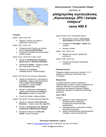 Stowarzyszenie “Cosmopolite Village” zaprasza na pielgrzymkę wycieczkową „Kanonizacja JPII i święte miejsca” cena 490 € Program Dzień 6 (Nd 27.04.14) Bazyliki Rzymu Dzień 1 (Wt. 22.04.14) ● Wyjazd z Aulnay sous Bois w godzinach wieczornych ● Bezpośredni udział w kanonizacji Jana Pawła II na Placu Św. Piotra ● Przejazd do Viareggio i relaks nad morzem ● Nocleg w hotelu Dzień 2 (Śr. 23.04.14) ● ● Przejazd przez Francję, po drodze słynny tunel pod Mont Blanc Przyjazd do Loreto zakwaterowanie i obiado-kolacja. Dzień 7 (Pn. 28.04.14) ● Dzień 3 (Cz. 24.04.14) Loreto, Asyż ● Wizyta w sanktuarium maryjnym Santa Casa ze Świetym Domkiem ● Zwiedzanie Asyżu – miejsca urodzin Św, Franciszka i Św Klary ● Przyjazd do Lanciano, zakwaterowanie i obiado-kolacja Dzień 4 (Pt 25.04.14) Lanciano, Manopelo ● Wizyta w kościele Św. Franciszka w Lanciano, miejscu przechowywania relikwi Ciała i Krwi Pańskiej powstałych w wyniku Cudu Eucharystycznego ● Wizyta w sanktuarium Manoppello miejscu przechowywania Całunu z Manopello (chusty św. Weroniki) ● Powrót do hotelu i obiado-kolacja Dzień 5 (So.26.04.14) San Giovanni Rotondo ● Wizyta w sanktuariu San Giovanni Rotondo – miejscu życia św. ojca Pio ● Wizyta w sanktuarium św. Michała Archanioła w Monte Sant’Angelo ● Przejazd do Rzymu na Plac Św. Piotra i nocne czuwanie. Wyjazd do Francji w godzinach porannych Dzień 8 (Wt. 29.04.14) ● Przyjazd do Paryża w godzinach porannych Zakwaterowanie Wygodne hotele turystyczne, pokoje 2, 3 i 4osobowe z łazienką i prysznicem oraz TV.Dojazd Wyżywienie 2 posiłki dziennie w hotelu (sniadania i obiadokolacje), posiłki w czasie zwiedzania we własnym zakresie. W czasie przejazdu wyżywienie we własnym zakresie. Będzie możliwość zakupów w markecie przed drogą powrotną. Cena 490 € zawiera: ● przejazd w pełni wyposażonym, klimatyzowanym autokarem turystycznym renomowanego przewoźnika, ● zakwaterowanie i wyżywienie według specyfikacji powyżej, ● opieka przedstawiciela stowarzyszenia i księdza, usługi przewodnickie Informacje dodatkowe i zapisy: Internet: www.cosmoville.eu, 06.13.36.62.60, tel. 06.14.31.98.47 ; email: [email protected]