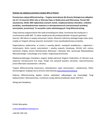 Szykuje się najlepsza premiera targów BIO w Polsce! Premierowa edycja BIOcontracting – Targów kontraktacji dla Branży Ekologicznej odbędzie się 13 i 14 stycznia 2016 roku w Warsaw Expo w Nadarzynie pod Warszawą. Ponad 160 wystawców, blisko 300 najbardziej znanych marek, międzynarodowy charakter, unikalne produkty, wysokojakościowe wytwory w akompaniamencie wartościowych prelekcji, warsztatów, prezentacji. To wszystko czeka odwiedzających Targi BIOcontracting. Targi zostaną zorganizowane dla osób prowadzących sklep, hurtownię lub myślących o uruchomieniu półki BIO. To także wydarzenie dla profesjonalistów chcących gotowad i tworzyd BIO dania w swojej restauracji, hotelu. Również miłośnicy ekologicznego trybu życia znajdą na Targach zdrową żywnośd, kosmetyki i inne wysokojakościowe produkty. Organizatorzy wydarzenia, w trosce o wysoką jakośd, nawiązali współpracę z regionami i instytucjami, które swoim autorytetem i wiedzą wsparły inicjatywę. Wśród nich można wymienid między innymi Ministerstwo Rolnictwa i Rozwoju Wsi, Samorząd Województwa Mazowieckiego i Lubuskiego oraz media i organizacje branżowe. Międzynarodowego charakteru targom dodał patronat Organic Federation of Ukraine oraz wsparcie merytoryczne Eco Expo. Dzięki nim powstał pawilon ukraioski, reprezentowany przez kilkunastu wystawców z Ukrainy. Targom BIOcontracting towarzyszy rozbudowana częśd seminaryjna i szkoleniowa. Pełen harmonogram znajduje się na stronie internetowej www.biocontracting.pl. Podczas BIOcontracting będzie można odwiedzid odbywające się równolegle Targi Sadownictwa i Warzywnictwa, na których swoją ofertę przedstawi około 250 firm. Wstęp jest bezpłatny. Emilia Skorupska [email protected] +48 501 239 126