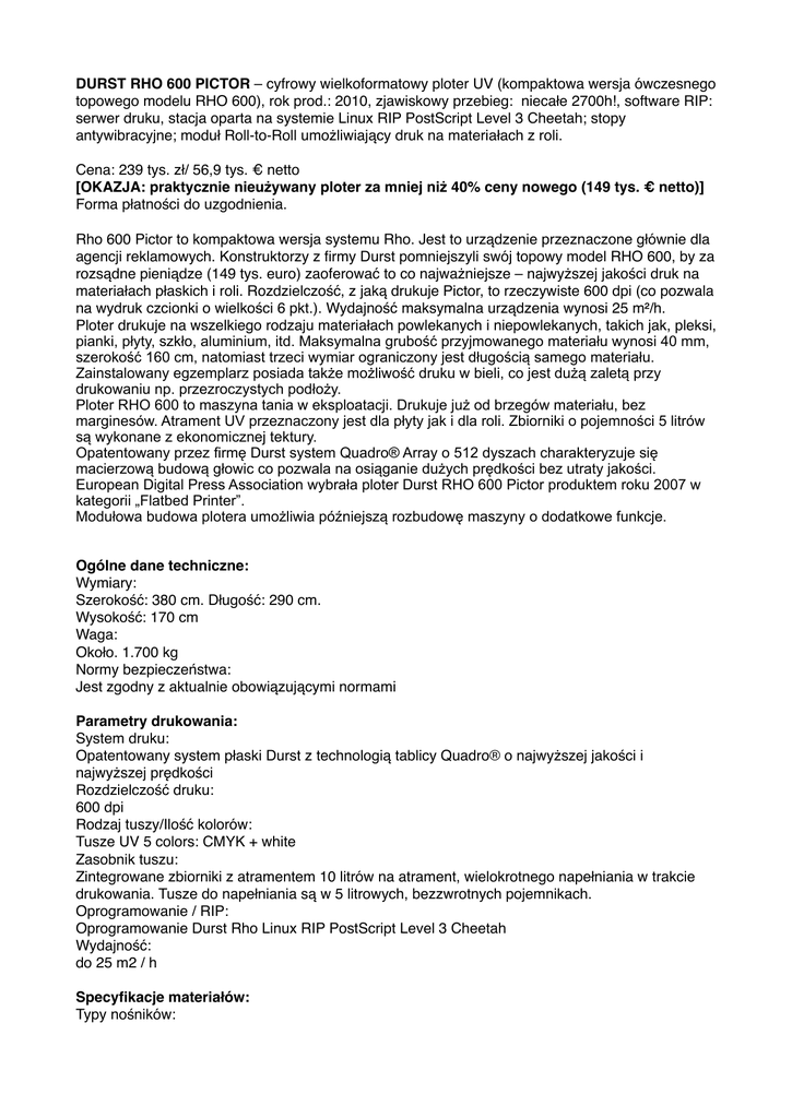 DURST RHO 600 PICTOR – cyfrowy wielkoformatowy ploter UV (kompaktowa wersja ówczesnego topowego modelu RHO 600), rok prod.: 2010, zjawiskowy przebieg: niecałe 2700h!, software RIP: serwer druku, stacja oparta na systemie Linux RIP PostScript Level 3 Cheetah; stopy antywibracyjne; moduł Roll-to-Roll umożliwiający druk na materiałach z roli. Cena: 239 tys. zł/ 56,9 tys. € netto [OKAZJA: praktycznie nieużywany ploter za mniej niż 40% ceny nowego (149 tys. € netto)] Forma płatności do uzgodnienia. Rho 600 Pictor to kompaktowa wersja systemu Rho. Jest to urządzenie przeznaczone głównie dla agencji reklamowych. Konstruktorzy z firmy Durst pomniejszyli swój topowy model RHO 600, by za rozsądne pieniądze (149 tys. euro) zaoferować to co najważniejsze – najwyższej jakości druk na materiałach płaskich i roli. Rozdzielczość, z jaką drukuje Pictor, to rzeczywiste 600 dpi (co pozwala na wydruk czcionki o wielkości 6 pkt.). Wydajność maksymalna urządzenia wynosi 25 m²/h. Ploter drukuje na wszelkiego rodzaju materiałach powlekanych i niepowlekanych, takich jak, pleksi, pianki, płyty, szkło, aluminium, itd. Maksymalna grubość przyjmowanego materiału wynosi 40 mm, szerokość 160 cm, natomiast trzeci wymiar ograniczony jest długością samego materiału. Zainstalowany egzemplarz posiada także możliwość druku w bieli, co jest dużą zaletą przy drukowaniu np. przezroczystych podłoży. Ploter RHO 600 to maszyna tania w eksploatacji. Drukuje już od brzegów materiału, bez marginesów. Atrament UV przeznaczony jest dla płyty jak i dla roli. Zbiorniki o pojemności 5 litrów są wykonane z ekonomicznej tektury. Opatentowany przez firmę Durst system Quadro® Array o 512 dyszach charakteryzuje się macierzową budową głowic co pozwala na osiąganie dużych prędkości bez utraty jakości. European Digital Press Association wybrała ploter Durst RHO 600 Pictor produktem roku 2007 w kategorii „Flatbed Printer”. Modułowa budowa plotera umożliwia późniejszą rozbudowę maszyny o dodatkowe funkcje. Ogólne dane techniczne: Wymiary: Szerokość: 380 cm. Długość: 290 cm. Wysokość: 170 cm Waga: Około. 1.700 kg Normy bezpieczeństwa: Jest zgodny z aktualnie obowiązującymi normami Parametry drukowania: System druku: Opatentowany system płaski Durst z technologią tablicy Quadro® o najwyższej jakości i najwyższej prędkości Rozdzielczość druku: 600 dpi Rodzaj tuszy/Ilość kolorów: Tusze UV 5 colors: CMYK + white Zasobnik tuszu: Zintegrowane zbiorniki z atramentem 10 litrów na atrament, wielokrotnego napełniania w trakcie drukowania. Tusze do napełniania są w 5 litrowych, bezzwrotnych pojemnikach. Oprogramowanie / RIP: Oprogramowanie Durst Rho Linux RIP PostScript Level 3 Cheetah Wydajność: do 25 m2 / h Specyfikacje materiałów: Typy nośników: Szeroki zakres niepowlekanych i powlekanych materiałów - również teksturowanych powierzchni takich jak arkusze twardej i miękkiej pianki, aluminium, szkła akrylowego, tektury, blachy falistej, itp. Maksymalna szerokość druku: 160 cm Maksymalna długość druku: Ograniczona tylko przez długość nośnika Maksymalna grubość: 40 mm Maksymalna masa: 20 kg Najmniejszy rozmiar arkusza: DIN-A3 - 29,7 x 42 cm Rejestracja materiałów: Materiały są zarejestrowane na przedniej krawędzi za pomocą czujników światłowodowych. Enkoder mierzy sekwencje komunikacyjne, zapewniając najwyższą precyzję dopasowania obrazu. Wymagania odnośnie stanowiska: Wymagane miejsce: min. 6 x 4 m Maksymalna wysokość: 2.400 m nad poziomem morza Zakres temperatury: +15 ° C do +30 ° C bez kondensacji Wilgotność względna powietrza: 25 - 80%, bez kondensacji Odbiór osobisty w Kamieńcu Wrocławskim (Perfecta). Pomoc przy załadunku. Forma płatności do uzgodnienia. Zakładam możliwość pomyłki w tekście ogłoszenia, dlatego proszę o kontakt przed zakupem. Tomasz Sawkiewicz +48 603 666 600 [email protected]