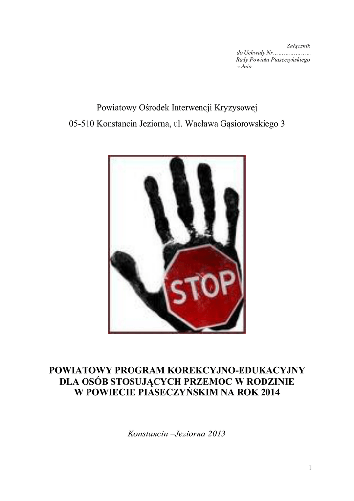 Załącznik do Uchwały Nr……….………… Rady Powiatu Piaseczyńskiego z dnia …………………………… Powiatowy Ośrodek Interwencji Kryzysowej 05-510 Konstancin Jeziorna, ul. Wacława Gąsiorowskiego 3 POWIATOWY PROGRAM KOREKCYJNO-EDUKACYJNY DLA OSÓB STOSUJĄCYCH PRZEMOC W RODZINIE W POWIECIE PIASECZYŃSKIM NA ROK 2014 Konstancin –Jeziorna 2013 1 Wstęp Zjawisko przemocy w rodzinie wymaga podjęcia różnych działań mających na celu łagodzenie skutków tego zjawiska. Jednym z podmiotów powołanych do zapobiegania skutkom przemocy w rodzinie jest Powiatowy Ośrodek Interwencji Kryzysowej w Konstancinie – Jeziornie przy ul. W. Gąsiorowskiego 3. Powiatowy Ośrodek Interwencji Kryzysowej realizuje zadanie określone w art. 6 ust. 3 pkt. 1 ustawa z dnia 29 lipca 2005 roku o przeciwdziałaniu przemocy w rodzinie ( Dz. U. z 2005 Nr 180, poz. 1493 z późn. zm.) w brzmieniu ustalonym ustawą z dnia 10 czerwca 2010 roku o zmianie ustawy o przeciwdziałaniu przemocy w rodzinie oraz niektórych innych ustaw ( Dz. U. z 2010r. Nr 125, poz. 842). Powyższe stanowi, iż zadaniem własnym powiatu jest opracowanie i wdrożenie do realizacji programu przeciwdziałania przemocy w rodzinie, natomiast zadaniem powiatu z zakresu administracji rządowej jest opracowanie i wdrożenie do realizacji programu korekcyjno – edukacyjnego dla osób stosujących przemoc w rodzinie. Powiatowy Program Korekcyjno – Edukacyjny dla osób stosujących przemoc w rodzinie na rok 2014 został opracowany w celu zwiększenia skuteczności działań mających na celu minimalizowanie zjawiska przemocy w rodzinie. Realizacja programu korekcyjno – edukacyjnego jest skuteczna jedynie przy współpracy wielu instytucji rządowych, samorządowych i organizacji pozarządowych realizujących zadania z zakresu pomocy społecznej. Niniejszy program powstał w oparciu o dotychczasowy stan wiedzy oraz diagnozę zjawiska przemocy w rodzinie w powiecie piaseczyńskim i innych powiatach. Program korekcyjno-edukacyjny przyjmuje możliwość realizacji w następujący sposób: 1. w skróconej wersji 3 miesięcznej (60 godzin) 2. w wersji 6 miesięcznej rozszerzonej o elementy metody „Porozumiewania się bez przemocy” Marshalla Rosenberga w formie dodatkowego spotkania omawiającego metodę oraz stosowania tej metody w trakcie ćwiczeń grupowych (120 godzin). 3. możliwość skorzystania z konsultacji indywidualnych i spotkań z rodziną dla osób zainteresowanych. 1. Podstawa prawna do opracowania Powiatowego Programu Korekcyjno – Edukacyjnego dla osób stosujących przemoc w rodzinie. 1. Ustawa z dnia 29 lipca 2005r. o przeciwdziałaniu przemocy w rodzinie (Dz. U. z 2005 Nr 180, poz. 1493 z późn. zm.), 2. Ustawa z dnia 12 marca 2004r. o pomocy społecznej ( Dz. U. z 2013, poz. 182, z późn. zm.), 3. Ustawa z dnia 5 czerwca 1998r. o samorządzie powiatowym (tekst jednolity :Dz. U. z 2013, poz. 595), 4. Ustawa z dnia 5 czerwca 1998r. o samorządzie województwa (tekst jednolity: Dz. U. z 2013, poz. 596), 2 5. Rozporządzenie Rady Ministrów z dnia 13 września 2011r., w sprawie procedury „ Niebieska Karta”(Dz. U. Nr 209, poz. 1245), 6. Ustawa z dnia 6 kwietnia 1990r. o Policji (Dz. U. z 2007 Nr 43, poz. 277, z późn. zm.), 7. Ustawę z dnia 7 września 1991r. o systemie oświaty (Dz. U. z 2004 Nr 256, poz. 2572, z późn. zm.), 8. Ustawę z dnia 6 czerwca 1997r. - Kodeks karny (Dz. U. z1997 Nr 88, poz. 553, z późn. zm.), 9. Ustawę z dnia 6 czerwca 1997r. - Kodeks postępowania karnego (Dz. U. z 1997 Nr 89, poz. 555, z późn. zm.), 10. Ustawa z dnia 26 października 1982r. o wychowaniu w trzeźwości i przeciwdziałaniu alkoholizmowi (Dz. U. z 2007 Nr 70, poz. 473, z późn. zm.). 2. Cele programu Zarówno głównymi jak i szczegółowymi celami programu jest pomoc sprawcom w zaprzestaniu stosowania przemocy poprzez edukację mającą na celu: 1. 2. 3. 4. 5. 6. 7. 8. 9. uświadomienie sprawcy czym jest przemoc zmniejszenie skali zjawiska przemocy w rodzinie, zwiększenie skuteczności ochrony ofiar przemocy w rodzinie, zwiększenie skuteczności działań interwencyjnych i korekcyjnych wobec osób stosujących przemoc w rodzinie, uzyskanie przez sprawcę przemocy świadomości własnych zachowań przemocowych wobec bliskich, rozpoznanie przez sprawcę przemocy sygnałów ostrzegawczych zapowiadających zachowania przemocowe, opracowanie „planu bezpieczeństwa” zapobiegającemu użyciu siły i przemocy, nabycie nowych umiejętności służących rozwiązywaniu sporów w rodzinie bez użycia agresji, naukę umiejętności partnerskiego układania stosunków w rodzinie oraz uczenie się korzystania z pomocy innych. 3 3. Założenia programu Problem przemocy w rodzinie jest jednym ze szczególnych problemów społecznych w Polsce trudnym do zdiagnozowania. Z uwagi na szkodliwość i rozmiar zjawiska zadaniem specjalistów jest podjęcie szerokiego, dobrze zorganizowanego, zaplanowanego działania uwzględniającego wiele sfer tj. prewencja, prawo, zdrowie, edukacja, praca socjalna. 1. działania uprzedzające – poprzez diagnozę, informację, edukację, kierowaną do ogółu społeczeństwa, a także do osób pracujących z ofiarami i sprawcami przemocy w rodzinie, 2. działania edukacyjne - przekazywanie wiedzy w sposób aktywizujący uczestników, między innymi przez prowadzenie otwartej dyskusji oraz odwoływanie się do indywidualnych doświadczeń, 3. działania wspierające - praca nad rozpoznawaniem i zmianą przekonań postaw osobistych (sprawców) poprzez analizę sytuacji życiowych dokonaną przy udziale specjalistów, 4. działania interwencyjne – opieka i terapia kierowana zarówno do ofiar przemocy w rodzinie jak i sprawców przemocy w rodzinie. 4. Sposób realizacji Powiatowy Ośrodek Interwencji Kryzysowej w Konstancinie – Jeziornie ściśle współpracuje z wieloma instytucjami lokalnymi działającymi w sferze pomocy społecznej i mającymi styczność z problemem przemo