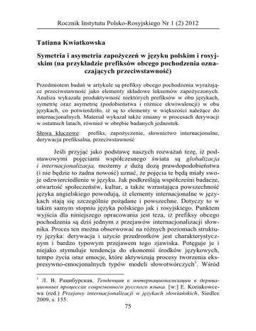 Rocznik Instytutu Polsko-Rosyjskiego Nr 1 (2) 2012 Tatiana Kwiatkowska Symetria i asymetria zapożyczeń w języku polskim i rosyjskim (na przykładzie prefiksów obcego pochodzenia oznaczających przeciwstawność) Przedmiotem badań w artykule są prefiksy obcego pochodzenia wyrażające przeciwstawność jako elementy składowe leksemów zapożyczonych. Analiza wykazała produktywność niektórych prefiksów w obu językach, symetrię oraz asymetrię (podobieństwa i różnice ekwiwalencji) w obu językach, co potwierdziło, iż są to elementy w większości należące do internacjonalnych. Materiał wykazał także zmiany w procesach derywacji w ostatnich latach, również w obrębie badanych jednostek. Słowa kluczowe: prefiks, zapożyczenie, słownictwo internacjonalne, derywacja prefiksalna, przeciwstawność Jeśli przyjąć jako podstawę naszych rozważań tezę, iż podstawowymi pojęciami współczesnego świata są globalizacja i internacjonalizacja, możemy z dużą dozą prawdopodobieństwa (i nie będzie to żadna nowość) uznać, że pojęcia te będą miały swoje odzwierciedlenie w języku. Jak podkreślają współcześni badacze, otwartość społeczeństw, kultur, a także wzrastająca powszechność języka angielskiego powodują, iż elementy internacjonalne w językach stają się szczególnie pożądane i powszechne. Dotyczy to w takim samym stopniu języka polskiego jak i rosyjskiego. Punktem wyjścia dla niniejszego opracowania jest teza, iż prefiksy obcego pochodzenia są dziś jednym z przejawów internacjonalizacji słownika. Proces ten można obserwować na różnych poziomach struktury języka: derywacja i użycie przedrostków jest charakterystycznym i bardzo typowym przejawem tego zjawiska. Potęguje je i niejako stymuluje tendencja do ekonomii środków językowych, tempo życia oraz emocje, które aktywizują procesy tworzenia ekspresywno-emocjonalnych typów modeli słowotwórczych1. Wśród 1 Л. В. Рацибурская, Тенденция к интернационализации в деривационных процессах современного русского языка. [w:] E. Koriakowcewa (red.) Przejawy internacjonalizacji w językach słowiańskich, Siedlce 2009, s. 155. 75 Rocznik Instytutu Polsko-Rosyjskiego Nr 1 (2) 2012 nich charakterystyczne są właśnie, często wartościujące, formacje z prefiksami obcego pochodzenia, które stają się produktywne dla formacji rodzimych. Prefiksy obcego pochodzenia łączą się dziś zarówno z rzeczownikami jak i przymiotnikami. Tak więc punkt widzenia rozpowszechniony w badaniach rosyjskiego systemu słowotwórczego, mówiący o tym, iż prefiksacja jest przywilejem czasownika szczególnie w dzisiejszych czasach nie może mieć racji bytu, co potwierdza rosyjska badaczka J. Ziemska w swoich pracach2. Współczesne badania języko-znawcze potwierdzają aktywizację procesów prefiksacji imiennej3. Formacje z prefiksami mają w językoznawstwie, jak wiele innych zjawisk będących obiektem badań językoznawców długą historię, która jednak nie doprowadziła do ostatecznych rozstrzygnięć w określeniach terminologicznych. Wręcz przeciwnie, problem statusu oraz określenia granicy między prefiksem, prefiksoidem a złożeniem wydaje się dziś ze względu na zmiany społeczne, kulturalne, obyczajowe, a co za tym idzie, również językowe, szczególnie aktualnym, ponieważ zarówno w języku polskim jak i rosyjskim obserwuje się intensywne rozszerzenie arsenału typów słowotwórczych rzeczowników i przymiotników złożonych. Złożenie jest najbardziej ekonomicznym i produktywnym sposobem derywacji w języku polskim i rosyjskim (oprócz oczywiście sufiksacji)4. K. Waszakowa potwierdzając swoimi badaniami dużą aktywność słowotwórstwa hybrydalnego, szczególnie z segmentami o zasięgu internacjonalnym typu auto-, mikro-, tele-, seks-, euro- i in. twierdzi, że postępująca łączliwość elementów obcych i rodzimych w niedalekiej przyszłości przyczyni się do zacierania granic między tym, co rodzime, a tym co zapożyczone5. W niniejszym opracowaniu przyjmujemy punkt widzenia badaczki rosyjskiej, uznając status części słów typu elektro-/электро-, kino-/кино, hydro-/гидро-, 2 Е. А. Земская, Словообразование как деятельность, Москва 1992, s. 77. 3 Л.В. Рацибурская, Тенденция к интернационализации...., op. cit., s. 156. 4 G. Lisowska, Заимствованные имена существительные в системе русского словообразования, Słupsk 2005, s. 72. 5 K. Waszakowa, Przejawy internacjonalizacji w słowotwórstwie współczesnej polszczyzny, Warszawa 2005, s. 23. 76 Rocznik Instytutu Polsko-Rosyjskiego Nr 1 (2) 2012 mini-/мини- itp. jako skrócone części złożeń6. W konsekwencji, elementy te nie są przedmiotem niniejszego opracowania. Dla potrzeb niniejszej pracy termin prefiksacja ujmuje się dość wąsko, jako cząstki, których znaczenie w większości może być oddane przez rodzime przedrostki, a ich semantyka jest modyfikacją znaczenia obecnego w podstawie słowotwórczej (niezależnie od tego czy jest ona zapożyczona czy rodzima). Warto jednak przyjrzeć się dyskusji, która trwa wśród językoznawców badających zapożyczenia, w tym zapożyczenia cząstek słowotwórczych. Wybierając do analizy przedrostki ze źródeł rosyjskich napotkaliśmy na podstawową trudność, a mianowicie kryteria według których określane jest zjawisko prefiksacji oraz brak jasnego stanowiska w określeniu co definiuje się jako prefiks, a co nim nie jest. Wśród prefiksów obcego pochodzenia w Русской грамматике7 znajdujemy 16 prefiksów zapożyczonych, w Словаре русского языка в 4-х т.8 tylko 9, natomiast w słownikach wyrazów obcych ich ilość jest większa (Нове