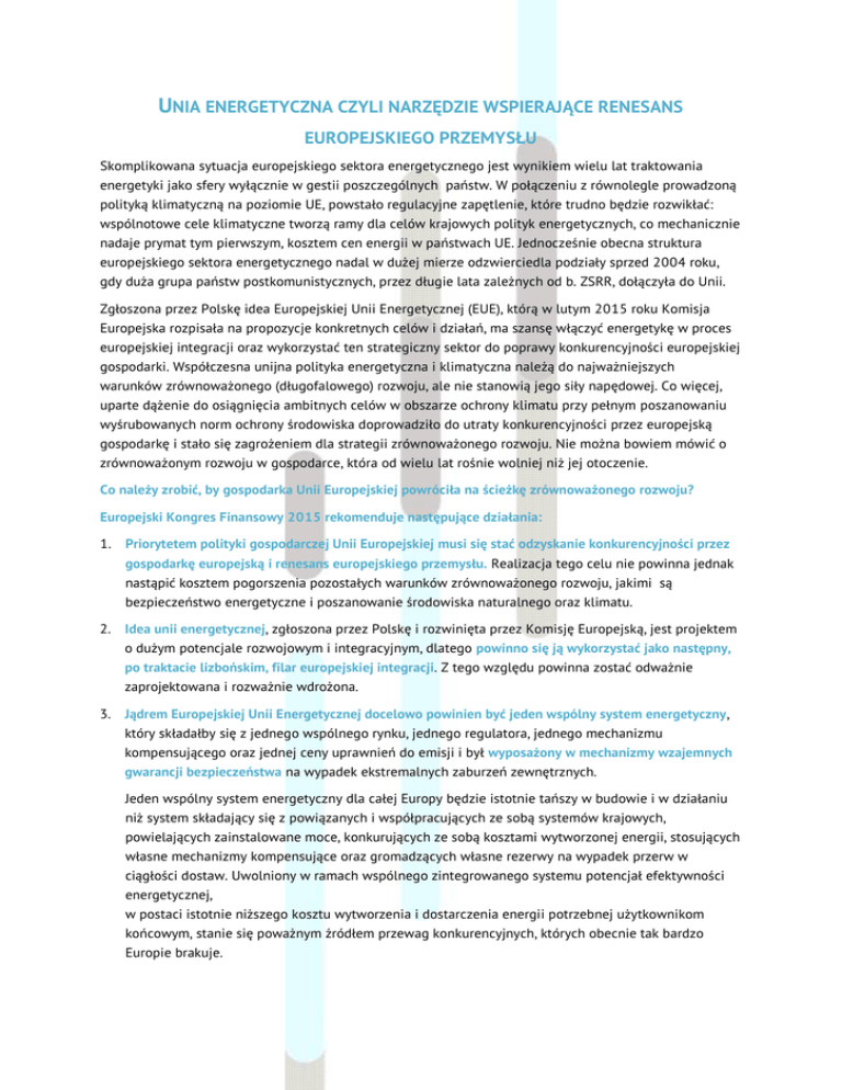 UNIA ENERGETYCZNA CZYLI NARZĘDZIE WSPIERAJĄCE RENESANS EUROPEJSKIEGO PRZEMYSŁU Skomplikowana sytuacja europejskiego sektora energetycznego jest wynikiem wielu lat traktowania energetyki jako sfery wyłącznie w gestii poszczególnych państw. W połączeniu z równolegle prowadzoną polityką klimatyczną na poziomie UE, powstało regulacyjne zapętlenie, które trudno będzie rozwikłać: wspólnotowe cele klimatyczne tworzą ramy dla celów krajowych polityk energetycznych, co mechanicznie nadaje prymat tym pierwszym, kosztem cen energii w państwach UE. Jednocześnie obecna struktura europejskiego sektora energetycznego nadal w dużej mierze odzwierciedla podziały sprzed 2004 roku, gdy duża grupa państw postkomunistycznych, przez długie lata zależnych od b. ZSRR, dołączyła do Unii. Zgłoszona przez Polskę idea Europejskiej Unii Energetycznej (EUE), którą w lutym 2015 roku Komisja Europejska rozpisała na propozycje konkretnych celów i działań, ma szansę włączyć energetykę w proces europejskiej integracji oraz wykorzystać ten strategiczny sektor do poprawy konkurencyjności europejskiej gospodarki. Współczesna unijna polityka energetyczna i klimatyczna należą do najważniejszych warunków zrównoważonego (długofalowego) rozwoju, ale nie stanowią jego siły napędowej. Co więcej, uparte dążenie do osiągnięcia ambitnych celów w obszarze ochrony klimatu przy pełnym poszanowaniu wyśrubowanych norm ochrony środowiska doprowadziło do utraty konkurencyjności przez europejską gospodarkę i stało się zagrożeniem dla strategii zrównoważonego rozwoju. Nie można bowiem mówić o zrównoważonym rozwoju w gospodarce, która od wielu lat rośnie wolniej niż jej otoczenie. Co należy zrobić, by gospodarka Unii Europejskiej powróciła na ścieżkę zrównoważonego rozwoju? Europejski Kongres Finansowy 2015 rekomenduje następujące działania: 1. Priorytetem polityki gospodarczej Unii Europejskiej musi się stać odzyskanie konkurencyjności przez gospodarkę europejską i renesans europejskiego przemysłu. Realizacja tego celu nie powinna jednak nastąpić kosztem pogorszenia pozostałych warunków zrównoważonego rozwoju, jakimi są bezpieczeństwo energetyczne i poszanowanie środowiska naturalnego oraz klimatu. 2. Idea unii energetycznej, zgłoszona przez Polskę i rozwinięta przez Komisję Europejską, jest projektem o dużym potencjale rozwojowym i integracyjnym, dlatego powinno się ją wykorzystać jako następny, po traktacie lizbońskim, filar europejskiej integracji. Z tego względu powinna zostać odważnie zaprojektowana i rozważnie wdrożona. 3. Jądrem Europejskiej Unii Energetycznej docelowo powinien być jeden wspólny system energetyczny, który składałby się z jednego wspólnego rynku, jednego regulatora, jednego mechanizmu kompensującego oraz jednej ceny uprawnień do emisji i był wyposażony w mechanizmy wzajemnych gwarancji bezpieczeństwa na wypadek ekstremalnych zaburzeń zewnętrznych. Jeden wspólny system energetyczny dla całej Europy będzie istotnie tańszy w budowie i w działaniu niż system składający się z powiązanych i współpracujących ze sobą systemów krajowych, powielających zainstalowane moce, konkurujących ze sobą kosztami wytworzonej energii, stosujących własne mechanizmy kompensujące oraz gromadzących własne rezerwy na wypadek przerw w ciągłości dostaw. Uwolniony w ramach wspólnego zintegrowanego systemu potencjał efektywności energetycznej, w postaci istotnie niższego kosztu wytworzenia i dostarczenia energii potrzebnej użytkownikom końcowym, stanie się poważnym źródłem przewag konkurencyjnych, których obecnie tak bardzo Europie brakuje. 4. Obszarem o dużym potencjale korzyści dla ochrony klimatu oraz konkurencyjności europejskiej gospodarki jest racjonalne wykorzystanie unijnych zasobów energii pierwotnej. W tym celu Unia Europejska powinna wprowadzić jednolite zasady wykorzystywania zasobów energii pierwotnej, zarówno pochodzącej z paliw kopalnych, jak i z odnawialnych źródeł energii. W procesie dekarbonizacji chodzi o to, by skutecznie ograniczać emisję dwutlenku węgla do atmosfery, a docelowo jej zaprzestać. W długiej perspektywie także paliwa kopalne mogą spełnić to kryterium pod warunkiem, że nie zostaną już dzisiaj arbitralnie wykluczone z programów badań i innowacji. Zgodnie z dzisiejszym stanem wiedzy, w 2040 roku węgiel będzie wciąż zaspokajał ¼ globalnego popytu na energię. W przypadku energii elektrycznej będzie to 30%. Zatem do tego czasu nie tylko nie uda się wyeliminować węgla z globalnego miksu energetycznego, ale jego udział pozostanie istotny. Z tego względu należy intensywnie inwestować w poszukiwanie efektywnej dekarbonizacji w obszarze wykorzystania węgla – gdyż jest to najbardziej dostępne pierwotne źródło energii – nie rezygnując jednak z poszukiwania innowacji w innych obszarach. Największymi konsumentami węgla będą Chiny i Indie. Jeśli powstaną innowacyjne technologie wykorzystania węgla, kraje te będą ich odbiorcami, jak to ma miejsce obecnie w przypadku OZE, i u siebie zredukują emisję dwutlenku węgla do atmosfery z korzyścią dla klimatu. 5. Ważne jest przejście z obecnego systemu wspierania rozwoju technologii w sposób selektywny (wiatr – tak, węgiel – nie, atom – tu tak, a tam nie itd.) na wsparcie technologicznie neutralne. W procesie kreowania innowacji Komisja Europejska powinna zająć pozycję lidera, na którym spoczywa misja wytyczenia kierunku rozwoju poprzez zidentyfikowanie głównych wyzwań oraz opracowanie wizji europejskiej gospodarki przyszłości. Taką wizją jest np. zintegrowana energetycznie gospodarka Europy, do której doprowadzi nas Europejska Unia Energetyczna. Rolą Komisji Europejskiej jest też wyasygnowanie adekwatnych kwot z budżetu, które poprzez programy badań narodowych, koordynowanych przez zespoły niezależnych ekspertów, zostan