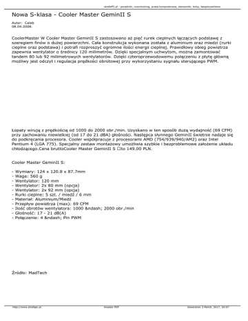 strefaPC.pl - poradniki, overclocking, prasa komputerowa, sterowniki, testy, bezpieczeństwo Nowa S-klasa - Cooler Master GeminII S Autor: Caleb 08.04.2008. CoolerMaster W Cooler Master GeminII S zastosowano aż pięć rurek cieplnych łączących podstawę z szeregiem finów o dużej powierzchni. Cała konstrukcja wykonana została z aluminium oraz miedzi (rurki cieplne oraz podstawa) i potrafi rozproszyć ogromne ilości energii cieplnej. Prawidłowy obieg powietrza zapewnia wentylator o średnicy 120 milimetrów. Dzięki specjalnym uchwytom, można zamontować tandem 80 lub 92 milimetrowych wentylatorów. Dzięki czteroprzewodowemu połączeniu z płytę główną możliwy jest odczyt i regulacja prędkości obrotowej przy wykorzystaniu sygnału sterującego PWM. Łopaty wirują z prędkością od 1000 do 2000 obr./min. Uzyskano w ten sposób dużą wydajność (69 CFM) przy zachowaniu niewielkiej (od 17 do 21 dBA) głośności. Następca słynnego GeminII świetnie nadaje się do podkręcania procesora. Cooler współpracuje z procesorami AMD (754/939/940/AM2) oraz Intel Pentium 4 (LGA 775). Specjalny zestaw montażowy umożliwia szybkie i bezproblemowe założenie układu chłodzącego.Cena bruttoCooler Master GeminII S to 149.00 PLN. Cooler Master GeminII S: - Wymiary: 124 x 120.8 x 87.7mm Waga: 560 g Wentylator: 120 mm Wentylator: 2x 80 mm (opcja) Wentylator: 2x 92 mm (opcja) Rurki cieplne: 5 szt. / miedź / 6 mm Materiał: Aluminium/Miedź Przepływ powietrza (max): 69 CFM Ilość obrotów wentylatora: 1000 – 2000 obr./min Głośność: 17 - 21 dB(A) Połączenie: 4 – Pin PWM Źródło: MadTech http://www.strefapc.pl Kreator PDF Utworzono 3 March, 2017, 20:07
