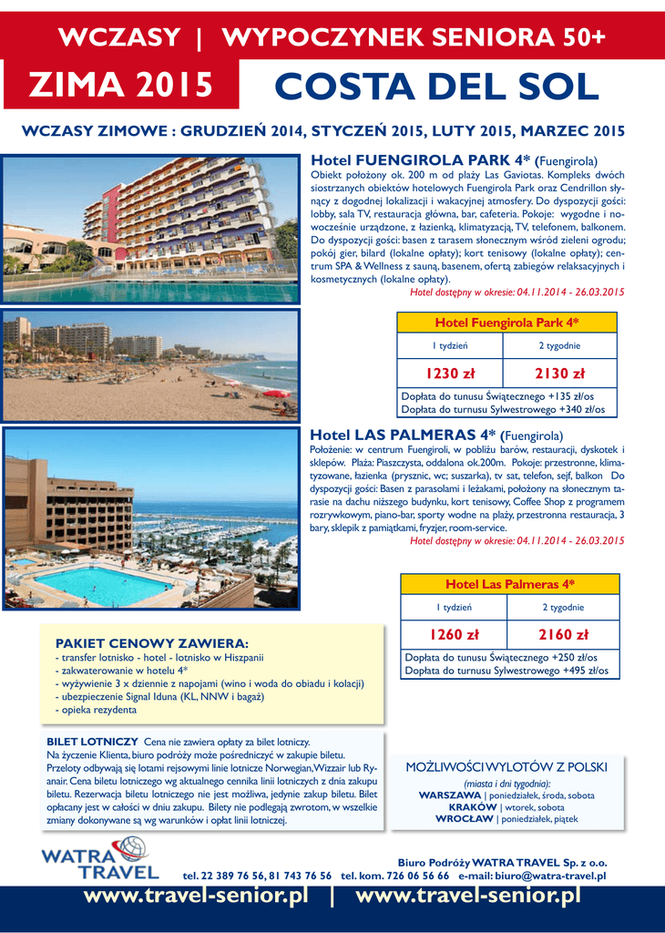 WCZASY | WYPOCZYNEK SENIORA 50+ ZIMA 2015 COSTA DEL SOL WCZASY ZIMOWE : GRUDZIEŃ 2014, STYCZEŃ 2015, LUTY 2015, MARZEC 2015 Hotel FUENGIROLA PARK 4* (Fuengirola) Obiekt położony ok. 200 m od plaży Las Gaviotas. Kompleks dwóch siostrzanych obiektów hotelowych Fuengirola Park oraz Cendrillon słynący z dogodnej lokalizacji i wakacyjnej atmosfery. Do dyspozycji gości: lobby, sala TV, restauracja główna, bar, cafeteria. Pokoje: wygodne i nowocześnie urządzone, z łazienką, klimatyzacją, TV, telefonem, balkonem. Do dyspozycji gości: basen z tarasem słonecznym wśród zieleni ogrodu; pokój gier, bilard (lokalne opłaty); kort tenisowy (lokalne opłaty); centrum SPA & Wellness z sauną, basenem, ofertą zabiegów relaksacyjnych i kosmetycznych (lokalne opłaty). Hotel dostępny w okresie: 04.11.2014 - 26.03.2015 Hotel Fuengirola Park 4* 1 tydzień 2 tygodnie 1230 zł 2130 zł Dopłata do tunusu Świątecznego +135 zł/os Dopłata do turnusu Sylwestrowego +340 zł/os Hotel LAS PALMERAS 4* (Fuengirola) Położenie: w centrum Fuengiroli, w pobliżu barów, restauracji, dyskotek i sklepów. Plaża: Piaszczysta, oddalona ok.200m. Pokoje: przestronne, klimatyzowane, łazienka (prysznic, wc; suszarka), tv sat, telefon, sejf, balkon Do dyspozycji gości: Basen z parasolami i leżakami, położony na słonecznym tarasie na dachu niższego budynku, kort tenisowy, Coffee Shop z programem rozrywkowym, piano-bar, sporty wodne na plaży, przestronna restauracja, 3 bary, sklepik z pamiątkami, fryzjer, room-service. Hotel dostępny w okresie: 04.11.2014 - 26.03.2015 Hotel Las Palmeras 4* PAKIET CENOWY ZAWIERA: - transfer lotnisko - hotel - lotnisko w Hiszpanii - zakwaterowanie w hotelu 4* - wyżywienie 3 x dziennie z napojami (wino i woda do obiadu i kolacji) - ubezpieczenie Signal Iduna (KL, NNW i bagaż) - opieka rezydenta BILET LOTNICZY Cena nie zawiera opłaty za bilet lotniczy. Na życzenie Klienta, biuro podróży może pośredniczyć w zakupie biletu. Przeloty odbywają się lotami rejsowymi linie lotnicze Norwegian,Wizzair lub Ryanair. Cena biletu lotniczego wg aktualnego cennika linii lotniczych z dnia zakupu biletu. Rezerwacja biletu lotniczego nie jest możliwa, jedynie zakup biletu. Bilet opłacany jest w całości w dniu zakupu. Bilety nie podlegają zwrotom, w wszelkie zmiany dokonywane są wg warunków i opłat linii lotniczej. 1 tydzień 2 tygodnie 1260 zł 2160 zł Dopłata do tunusu Świątecznego +250 zł/os Dopłata do turnusu Sylwestrowego +495 zł/os MOŻLIWOŚCI WYLOTÓW Z POLSKI (miasta i dni tygodnia): WARSZAWA | poniedziałek, środa, sobota KRAKÓW | wtorek, sobota WROCŁAW | poniedziałek, piątek Biuro Podróży WATRA TRAVEL Sp. z o.o. tel. 22 389 76 56, 81 743 76 56 tel. kom. 726 06 56 66 e-mail: [email protected] www.travel-senior.pl | www.travel-senior.pl