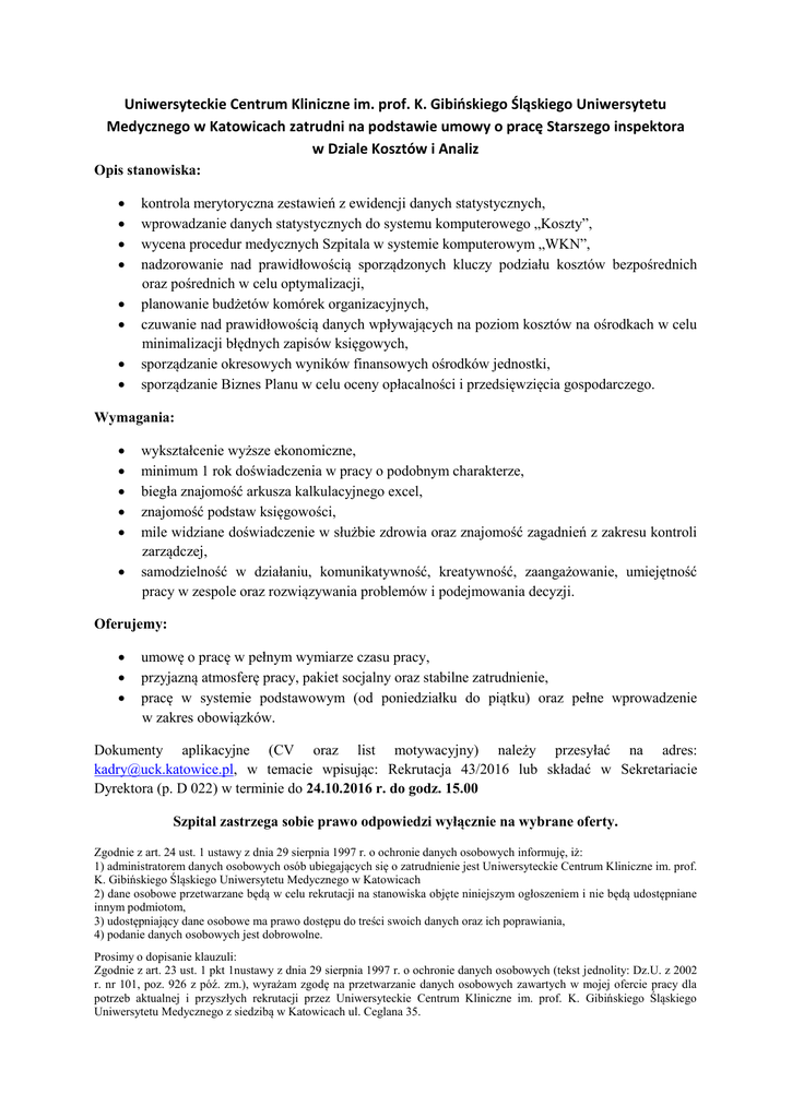 Uniwersyteckie Centrum Kliniczne im. prof. K. Gibińskiego Śląskiego Uniwersytetu Medycznego w Katowicach zatrudni na podstawie umowy o pracę Starszego inspektora w Dziale Kosztów i Analiz Opis stanowiska: kontrola merytoryczna zestawień z ewidencji danych statystycznych, wprowadzanie danych statystycznych do systemu komputerowego „Koszty”, wycena procedur medycznych Szpitala w systemie komputerowym „WKN”, nadzorowanie nad prawidłowością sporządzonych kluczy podziału kosztów bezpośrednich oraz pośrednich w celu optymalizacji, planowanie budżetów komórek organizacyjnych, czuwanie nad prawidłowością danych wpływających na poziom kosztów na ośrodkach w celu minimalizacji błędnych zapisów księgowych, sporządzanie okresowych wyników finansowych ośrodków jednostki, sporządzanie Biznes Planu w celu oceny opłacalności i przedsięwzięcia gospodarczego. Wymagania: wykształcenie wyższe ekonomiczne, minimum 1 rok doświadczenia w pracy o podobnym charakterze, biegła znajomość arkusza kalkulacyjnego excel, znajomość podstaw księgowości, mile widziane doświadczenie w służbie zdrowia oraz znajomość zagadnień z zakresu kontroli zarządczej, samodzielność w działaniu, komunikatywność, kreatywność, zaangażowanie, umiejętność pracy w zespole oraz rozwiązywania problemów i podejmowania decyzji. Oferujemy: umowę o pracę w pełnym wymiarze czasu pracy, przyjazną atmosferę pracy, pakiet socjalny oraz stabilne zatrudnienie, pracę w systemie podstawowym (od poniedziałku do piątku) oraz pełne wprowadzenie w zakres obowiązków. Dokumenty aplikacyjne (CV oraz list motywacyjny) należy przesyłać na adres: [email protected], w temacie wpisując: Rekrutacja 43/2016 lub składać w Sekretariacie Dyrektora (p. D 022) w terminie do 24.10.2016 r. do godz. 15.00 Szpital zastrzega sobie prawo odpowiedzi wyłącznie na wybrane oferty. Zgodnie z art. 24 ust. 1 ustawy z dnia 29 sierpnia 1997 r. o ochronie danych osobowych informuję, iż: 1) administratorem danych osobowych osób ubiegających się o zatrudnienie jest Uniwersyteckie Centrum Kliniczne im. prof. K. Gibińskiego Śląskiego Uniwersytetu Medycznego w Katowicach 2) dane osobowe przetwarzane będą w celu rekrutacji na stanowiska objęte niniejszym ogłoszeniem i nie będą udostępniane innym podmiotom, 3) udostępniający dane osobowe ma prawo dostępu do treści swoich danych oraz ich poprawiania, 4) podanie danych osobowych jest dobrowolne. Prosimy o dopisanie klauzuli: Zgodnie z art. 23 ust. 1 pkt 1nustawy z dnia 29 sierpnia 1997 r. o ochronie danych osobowych (tekst jednolity: Dz.U. z 2002 r. nr 101, poz. 926 z póź. zm.), wyrażam zgodę na przetwarzanie danych osobowych zawartych w mojej ofercie pracy dla potrzeb aktualnej i przyszłych rekrutacji przez Uniwersyteckie Centrum Kliniczne im. prof. K. Gibińskiego Śląskiego Uniwersytetu Medycznego z siedzibą w Katowicach ul. Ceglana 35.