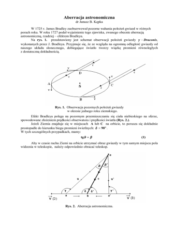Aberracja astronomiczna dr Janusz B. Kępka W 1725 r. James Bradley zaobserwował pozorne wahania położeń gwiazd w różnych porach roku. W roku 1727 podał wyjaśnienie tego zjawiska, zwanego obecnie aberracją astronomiczną, rzadziej – efektem Bradleya. Na rys. 1. przedstawiony jest schemat obserwacji położeń gwiazdy g - Draconis, wykonanych przez J. Bradleya. Przyjmuje się, że ze względu na ogromną odległość gwiazdy od naszego układu słonecznego, dobiegające światło tworzy wiązkę promieni równoległych z dostateczną dokładnością. Rys. 1. Obserwacja pozornych położeń gwiazdy w okresie jednego roku ziemskiego. Efekt Bradleya polega na pozornym przemieszczaniu się ciała niebieskiego na sferze, spowodowane złożeniem prędkości obserwatora i prędkości światła (Rys. 2.). Jeżeli Ziemia znajduje się w miejscach A lub C na orbicie, to porusza się dokładnie prostopadle do kierunku biegu promieni świetlnych: d = 90 o . W tych szczególnych przypadkach, mamy: tgJ = b (1) Aby w czasie ruchu Ziemi na orbicie utrzymać obraz gwiazdy w tym samym miejscu pola widzenia w teleskopie, należy odpowiednio obracać teleskop. Rys. 2. Aberracja astronomiczna. 2 Załóżmy, że Ziemia znajduje się w miejscu B na orbicie (Rys. 1). Niech promień świetlny biegnie od odległej gwiazdy z prędkością c in vacuo oraz pod kątem d do płaszczyzny ekliptyki, i niech w miejscu e promień ten wpada do teleskopu (lewa część Rys. 2). Gdyby obserwator był nieruchomy, to światło przebyłoby w teleskopie odległość eb w czasie t. Ponieważ obserwator porusza się z prędkością v, to w czasie t przebędzie on drogę ab = s = v·t, co spowoduje przesunięcie obrazu gwiazdy o odległość s w głównej płaszczyźnie ogniskowej teleskopu. Ze względu na ruch własny obserwatora wraz z teleskopem, prędkość światła względem teleskopu wynosi u. Jest to „widziana” prędkość światła w poruszającym się układzie obserwatora. Aby utrzymać obraz gwiazdy w miejscu b, należy pochylić teleskop w kierunku ruchu obserwatora o kąt J = (g - d ) , który zwany jest kątem aberracji astronomicznej. Stosując znane twierdzenie Snelliusa dla trójkąta dowolnego, z rys. 2 znajdujemy: v c = sin J sin(p - g ) Z powyższego, mamy: sin J = b sin g gdzie: b = v c (2) i jest to znany wzór na aberrację światła. Podobnie możemy rozpatrywać zagadnienie, gdy Ziemia znajduje się w miejscu D na orbicie. Obecnie, kierunek ruchu Ziemi jest dokładnie przeciwny do kierunku ruchu Ziemi w punkcie B. Widziana prędkość światła wynosi u’ (prawa część rys. 2). W tym przypadku, mamy: sin J ¢ = b sin g ¢ Maksymalna wartość kąta aberracji, w przybliżeniu Ja = 20,5' ' , zwana jest stałą aberracji rocznej. Nazywana jest też aberratio fixarum. Należy tu zaznaczyć, że jeżeli obserwator poruszałby się ruchem jednostajnym prostoliniowym, to nie mógłby on wykryć swego ruchu, ponieważ w takiej sytuacji kąt g miałby stałą wartość, i z tego właśnie względu kąt aberracji J byłby niewykrywalny. Natomiast pełne zmiany kąta g można obserwować w czasie ruchu po krzywej zamkniętej. Z bezpośrednich obserwacji możemy wyznaczyć wartości kątów g oraz J . Z kolei, jeżeli z innych pomiarów znamy wartość prędkości c światła in vacuo , to z zależności (2) możemy wyznaczyć wartość prędkości v orbitalnej Ziemi w różnych punktach na orbicie. James Bradley postąpił odwrotnie. Z innych pomiarów przyjął średnią wartość orbitalną Ziemi, i według zależności (1) wyliczył prędkość światła in vacuo. Przy okazji warto zwrócić uwagę, że orbity planetarne mają kształt owalu podobnego do jajka (patrz: Janusz B. Kępka – „Ruch absolutny i względny”, Warszawa 1999). Z tego względu, prędkość orbitalna Ziemi jest największa w perihelium, a najmniejsza w aphelium. Z przykrością należy stwierdzić, że zjawisko aberracji astronomicznej jest często mylnie interpretowane, na gruncie tzw. teorii względności Alberta Einsteina. I tak na przykład, na stronie internetowej : (http://pl.wikipedia.org/wiki/Aberracja_%C5%9Bwiat%C5%82a popularnej Wikipedii, czytamy: 3 Relatywistyczna interpretacja zjawiska aberracji Zjawisko poprzecznego efektu Dopplera dla światła poprawnie tłumaczy aberrację światła. Ruch Ziemi odbywa się prostopadle do kierunku rozchodzenia się fali świetlnej z gwiazdy, stanowiąc układ nieruchome źródło - ruchomy obserwator. Gwiazda wysyła fale o częstotliwości f0, które zgodnie z relatywistycznym efektem Dopplera są odbierane przez obserwatora na Ziemi jako fale o większej częstotliwości. Zgodnie z relatywistyczną transformacją kąta, kąt obserwacji fali w układzie spoczywającym: tgq = sin a , g (cos a + b ) gdzie b = v c α - kąt w układzie poruszającym się. Stosując relatywistyczną transformację kąta, traktując Ziemię jako układ spoczywający, a gwiazdę za obiekt poruszający się, dla aberracji światła uzyskujemy w pełni poprawny wzór na kąt aberracji: tgq = gb = v c 1- b 2 Wzór ten musi być stosowany dla dużych względnych wartości prędkości obserwatora i gwiazdy (istotne przy obserwacji odległych gwiazd). Poza tym, ruch względny Ziemi i gwiazdy można przy pomocy relatywistycznego składania prędkości sprowadzić do ruchu jednego układu względem spoczywającego drugiego. (koniec cytatu wskazanego tekstu z Wikipedii). Przeanalizujmy treści wyżej cytowanego tekstu z Wikipedii. 1. Nieprawdą jest, że – cytujemy: „Zjawisko poprzecznego efektu Dopplera dla światła poprawnie tłumaczy aberrację światła.”, koniec cytatu. Otóż, efekt Dopplera dotyczy zmian obserwowanej częstotliwości oraz długości fali świetlnej, a wynikających z ruchu źródła drgań oraz obserwatora. Natomiast, w przypadku aberracji astronomicznej, nie ma żadnego znaczenia częstotliwość oraz długość fali świetlnej. Za pomocą teleskopu nie jest rejestrowana 