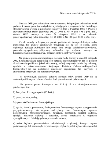 Warszawa, dnia 16 stycznia 2013 r. Strażak OSP jest członkiem stowarzyszenia, którym jest ochotnicza straż pożarna i zakres praw i obowiązków wynikających z przynależności do takiego stowarzyszenia wynika z przepisów: ustawy z dnia 7 kwietnia 1989 r. Prawo o stowarzyszeniach (tekst jednolity: Dz. U. 2001 r. Nr 79 poz. 855 z póź. zm.), statutu OSP, ustawy z dnia 24 sierpnia 1991 r. o ochronie przeciwpożarowej (tekst jednolity: Dz. U. 2009 r. Nr 178 poz. 1380 z póź. zm.). Co do zasady w krajowym prawie polskim nie istnieje definicja osoby publicznej. Na gruncie językowym przyjmuje się, że jest to osoba, która wykonuje funkcje publiczne lub przez inną swoją działalność zawodową, gospodarczą, społeczną, polityczną, kulturalną itp. wpływa znacząco na funkcjonowanie społeczeństwa, przeciwieństwo osoby prywatnej. Na gruncie prawa europejskiego Decyzja Rady Europy z dnia 28 listopada 2002 r. ustanawiająca europejską sieć ochrony osób publicznych dla jej potrzeb określa osobę publiczną jako każdą osobę, której przyznaje się służbę ochrony, zgodnie z ustawodawstwem krajowym Państwa Członkowskiego (Unii Europejskiej) lub na podstawie przepisów organizacji lub instytucji o charakterze krajowym lub ponadnarodowym. W powyższych ujęciach, członek zarządu OSP, strażak OSP nie są osobami publicznymi. Nie są również funkcjonariuszami publicznymi. Na gruncie prawa karnego - art. 115 § 13 k.k. funkcjonariuszem publicznym jest: 1) Prezydent Rzeczypospolitej Polskiej, 2) poseł, senator, radny, 2a) poseł do Parlamentu Europejskiego, 3) sędzia, ławnik, prokurator, funkcjonariusz finansowego organu postępowania przygotowawczego lub organu nadrzędnego nad finansowym organem postępowania przygotowawczego, notariusz, komornik, kurator sądowy, syndyk, nadzorca sądowy i zarządca, osoba orzekająca w organach dyscyplinarnych działających na podstawie ustawy, 4) osoba będąca pracownikiem administracji rządowej, innego organu państwowego lub samorządu terytorialnego, chyba że pełni wyłącznie czynności usługowe, a także inna osoba w zakresie, w którym uprawniona jest do wydawania decyzji administracyjnych, 5) osoba będąca pracownikiem organu kontroli państwowej lub organu kontroli samorządu terytorialnego, chyba że pełni wyłącznie czynności usługowe, 6) osoba zajmująca kierownicze stanowisko w innej instytucji państwowej, 7) funkcjonariusz organu powołanego do ochrony bezpieczeństwa publicznego albo funkcjonariusz Służby Więziennej, 8) osoba pełniąca czynną służbę wojskową, 9) pracownik międzynarodowego trybunału karnego, chyba że pełni wyłącznie czynności usługowe. Osobą pełniącą funkcję publiczną jest funkcjonariusz publiczny, członek organu samorządowego, osoba zatrudniona w jednostce organizacyjnej dysponującej środkami publicznymi, chyba że wykonuje wyłącznie czynności usługowe, a także inna osoba, której uprawnienia i obowiązki w zakresie działalności publicznej są określone lub uznane przez ustawę lub wiążącą Rzeczpospolitą Polską umowę międzynarodową (art. 115 § 19 k.k.). Natomiast w określonych wypadkach strażak OSP korzysta z ochrony prawnokarnej jak funkcjonariusz publiczny. W myśl art. 27 pkt 2 ustawy o ochronie przeciwpożarowej z ochrony przewidzianej w Kodeksie karnym dla funkcjonariuszy publicznych korzystają strażacy jednostek ochrony przeciwpożarowej i członkowie ochotniczych straży pożarnych biorący udział w działaniu ratowniczym lub wykonujący inne zadania związane z ochroną przeciwpożarową. Z wyrazami szacunku Krzysztof M. Miazga adwokat
