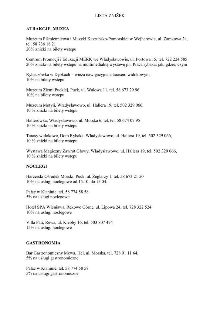 LISTA ZNIŻEK ATRAKCJE, MUZEA Muzeum Piśmiennictwa i Muzyki Kaszubsko-Pomorskiej w Wejherowie, ul. Zamkowa 2a, tel. 58 736 18 21 20% zniżki na bilety wstępu Centrum Promocji i Edukacji MERK we Władysławowie, ul. Portowa 15, tel. 722 224 585 20% zniżki na bilety wstępu na multimedialną wystawę pn. Praca rybaka: jak, gdzie, czym Rybaczówka w Dębkach – wieża nawigacyjna z tarasem widokowym 10% na bilety wstępu Muzeum Ziemi Puckiej, Puck, ul. Wałowa 11, tel. 58 673 29 96 10% na bilety wstępu Muzeum Motyli, Władysławowo, ul. Hallera 19, tel. 502 329 066, 10 % zniżki na bilety wstępu Hallerówka, Władysławowo, ul. Morska 6, tel. tel. 58 674 07 95 10 % zniżki na bilety wstępu Tarasy widokowe, Dom Rybaka, Władysławowo, ul. Hallera 19, tel. 502 329 066, 10 % zniżki na bilety wstępu Wystawa Magiczny Zawrót Głowy, Władysławowo, ul. Hallera 19, tel. 502 329 066, 10 % zniżki na bilety wstępu NOCLEGI Harcerski Ośrodek Morski, Puck, ul. Żeglarzy 1, tel. 58 673 21 50 10% na usługi noclegowe od 15.10. do 15.04. Pałac w Kłaninie, tel. 58 774 58 58 5% na usługi noclegowe Hotel SPA Wieniawa, Rekowo Górne, ul. Lipowa 24, tel. 728 322 524 10% na usługi noclegowe Villa Pati, Rewa, ul. Klebby 16, tel. 503 807 474 15% na usługi noclegowe GASTRONOMIA Bar Gastronomiczny Mewa, Hel, ul. Morska, tel. 728 91 11 64, 5% na usługi gastronomiczne Pałac w Kłaninie, tel. 58 774 58 58 5% na usługi gastronomiczne LISTA ZNIŻEK Bar "Kuchnia u Beni", al. Żeromskiego 53, Chłapowo, tel. 58 674 16 10 10% na usługi gastronomiczne Hotel SPA Wieniawa, Rekowo Górne, ul. Lipowa 24, tel. 728 322 524 10% na usługi gastronomiczne Restauracja Kaszubski Młyn, Wierzchucino, ul. Młyńska 11, tel. 782 909 070 5% na usługi gastronomiczne Pierogarnia Masza w Wejherowie, ul. 12 Marca 147, tel. 503 048 103 10% na usługi gastronomiczne Pod świerkami - bar rożen, Białogóra, ul. Moska 38, tel. 504 927 559 10% na usługi gastronomiczne Bar lokalny Merk, ul. Męczenników Piaśnicy 8, tel. 504 979 929 5% na usługi gastronomiczne Restauracja Sphinx Jastarnia (przy molo), ul. Nad Zatoką 2, tel. 602 392 237 5% na usługi gastronomiczne REKREACJA, SPA, USŁUGI Hotel SPA Wieniawa, Rekowo Górne, ul. Lipowa 24, tel. 728 322 524 10% na spa, basen, squash, tenis, minigolf Yacht Club Rewa, Rewa, ul. Morska 56, tel. 501 498 422 10% na wypożyczenie sprzętu żeglarskiego Aloha Paulina Ziółkowska, Rewa, ul. Sztormowa 3, tel. 504 238 179 5% na szkolenia kitesurfingu & 10% na zakupy w sklepie Aloha Shop Informacja Turystyczna, Hel, ul. Kuracyjna 26 (droga na Cypel) 10% na sprzedaż pamiątek Harcerski Ośrodek Morski, Puck, ul. Żeglarzy 1, tel. 58 673 21 50 10% na wypożyczanie łodzi od 01.05. do 31.10. Stanica wodna OKSiT, Swarzewo, tel. 58 673 16 55 10% na wypożyczenie sprzętu wodnego Przystań w Brzynie i Lubkowie, tel. 58 675 41 39 10% na wypożyczenie sprzętu wodnego Surf Szkoła, Jastarnia (przy molo), tel. 602 392 237 5% na szkołę kite- i windsurfingu oraz wypożyczenie sprzętu wodnego Galeria Niespodzianki, Wejherowo, ul. Klasztorna 7, tel. 608 456 469 5% na warsztaty artystyczne, pamiątki regionalne LISTA ZNIŻEK Wypożyczalnia rowerów w Swarzewie (początek ścieżki rowerowej), otwarte codziennie 9:30-19:30 w lipcu i sierpniu, tel. 504 713 131 20% na rowery i kijki nordic walking Masaż, manicure i pedicure w Jastarni Obiekt PAUZA na plaży w Jastarni po lewej stronie od wejścia na plażę nr 47, tel. 530 489 327, 10% na masaż relaksacyjny lub klasyczny (50 min.), manicure i pedicure hybrydowy; KOMUNIKACJA PKS Gdynia Sp. z o.o., Gdynia, ul. Hryniewieckiego 6c/43, tel. 801 11 22 11 10% na przewozy autobusowe na trasach w ramach siatki połączeń PKS Sp. z o.o. Meleksem po Helu, ul. Kuracyjna 1, tel. 505 090 570 10% na przewozy turystyczne w Helu