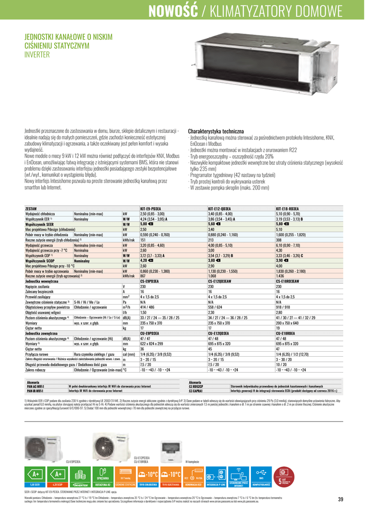 NOWOŚĆ / KLIMATYZATORY DOMOWE JEDNOSTKI KANAŁOWE O NISKIM CIŚNIENIU STATYCZNYM INVERTER Charakterystyka techniczna Jednostki przeznaczone do zastosowania w domu, biurze, sklepie detalicznym i restauracji idealnie nadają się do małych pomieszczeń, gdzie zachodzi konieczność estetycznej zabudowy klimatyzacji i ogrzewania, a także oczekiwany jest pełen komfort i wysoka wydajność. Nowe modele o mocy 9 kW i 12 kW można również podłączyć do interfejsów KNX, Modbus i EnOcean, umożliwiając łatwą integrację z istniejącymi systemami BMS, która nie stanowi problemu dzięki zastosowaniu interfejsu jednostki posiadającego zestyki bezpotencjałowe (wł./wył., komunikat o wystąpieniu błędu). Nowy interfejs Intesishome pozwala na proste sterowanie jednostką kanałową przez smartfon lub Internet. ZESTAW Wydajność chłodnicza Nominalna (min-max) Współczynnik EER 1) Nominalny Współczynnik SEER Moc projektowa Pdesign (chłodzenie) Pobór mocy w trybie chłodzenia Nominalny (min-max) Roczne zużycie energii (tryb chłodzenia) 2) Wydajność grzewcza Nominalna (min-max) Wydajność grzewcza przy -7 °C Nominalna Współczynnik COP 1) Nominalny Współczynnik SCOP Nominalny Moc projektowa Pdesign przy -10 °C Pobór mocy w trybie ogrzewania Nominalny (min-max) Roczne zużycie energii (tryb ogrzewania) 2) Jednostka wewnętrzna Napięcie zasilania Zalecany bezpiecznik Przewód zasilający Zewnętrzne ciśnienie statyczne 3) S-Hi / Hi / Me / Lo Objętościowy przepływ powietrza Chłodzenie / ogrzewanie Objętość usuwanej wilgoci Poziom ciśnienia akustycznego 4) Chłodzenie – Ogrzewanie (Hi / Lo / S-Lo) Wymiary wys. x szer. x głęb. Ciężar netto Jednostka zewnętrzna Poziom ciśnienia akustycznego 4) Chłodzenie / ogrzewanie (Hi) Wymiary 5) wys. x szer. x głęb. Ciężar netto Przyłącza rurowe Rura czynnika ciekłego / gazu kW W/W W/W kW kW kWh/rok kW kW W/W W/W kW kW kWh/rok V A mm² Pa m³/h l/h dB(A) mm kg dB(A) mm kg cal (mm) Zakres długości orurowania / Różnica wysokości zainstalowania jednostki wewn. i zewn. m Długość przewodu dodatkowego gazu / Dodatkowa ilość gazu m Zakres roboczy Chłodzenie / Ogrzewanie (min-max) °C Akcesoria PAW-AC-WIFI-1 PAW-IR-WIFI-1 · Jednostką kanałową można sterować za pośrednictwem protokołu Intesishome, KNX, EnOcean i Modbus · Jednostki można montować w instalacjach z orurowaniem R22 · Tryb energooszczędny – oszczędność rzędu 20% · Niezwykle kompaktowe jednostki wewnętrzne bez utraty ciśnienia statycznego (wysokość tylko 235 mm) · Programator tygodniowy (42 nastawy na tydzień) · Tryb prostej kontroli do wykrywania usterek · W zestawie pompka skroplin (maks. 200 mm) KIT-E9-PD3EA 2,50 (0,85 - 3,00) 4,24 (3,54 - 3,95) A 5,80 h KIT-E12-QD3EA 3,40 (0,85 - 4,00) 3,86 (3,54 - 3,45) A 5,60 a KIT-E18-RD3EA 5,10 (0,90 - 5,70) 3,19 (3,53 - 3,13) B 5,80 h 2,50 0,590 (0,240 - 0,760) 151 3,20 (0,85 - 4,60) 2,60 3,72 (3,7 - 3,33) A 4,20 h 3,40 0,880 (0,240 - 1,160) 213 4,00 (0,85 - 5,10) 3,00 3,54 (3,7 - 3,29) B 3,80 a 5,10 1,600 (0,255 - 1,820) 308 6,10 (0,90 - 7,10) 4,30 3,33 (3,46 - 3,26) C 3,90 a 2,60 0,860 (0,230 - 1,380) 867 CS-E9PD3EA 230 16 4 x 1,5 do 2,5 N/A 414 / 486 1,50 33 / 27 / 24 — 35 / 28 / 25 235 x 750 x 370 17 CU-E9PD3EA 47 / 47 622 x 824 x 299 36 1/4 (6,35) / 3/8 (9,52) 3 ~ 20 / 15 7,5 / 20 -10 ~ +43 / -10 ~ +24 2,90 1,130 (0,230 - 1,550) 1.068 CS-E12QD3EAW 230 16 4 x 1,5 do 2,5 N/A 558 / 624 2,30 34 / 27 / 24 — 36 / 28 / 25 235 x 750 x 370 17 CU-E12QD3EA 47 / 48 695 x 875 x 320 45 1/4 (6,35) / 3/8 (9,52) 3 ~ 20 / 15 7,5 / 20 -10 ~ +43 / -10 ~ +24 4,00 1,830 (0,260 - 2,180) 1.436 CS-E18RD3EAW 230 16 4 x 1,5 do 2,5 N/A 918 / 918 2,80 41 / 30 / 27 — 41 / 32 / 29 200 x 750 x 640 19 CU-E18RBEA 47 / 48 695 x 875 x 320 47 1/4 (6,35) / 1/2 (12,70) 3 ~ 30 / 20 10 / 20 -10 ~ +43 / -10 ~ +24 Akcesoria CZ-RD52CP CZ-CAPRA1 W pełni dwukierunkowy interfejs IR WiFi do sterowania przez Internet Interfejs IR WiFi do sterowania przez Internet Sterownik indywidualny przewodowy do jednostek kasetonowych i kanałowych Interfejs generacji H do integracji sterowania ECOi (produkt dostępny od czerwca 2016 r.) 1) Wskaźniki EER i COP podane dla zasilania 230 V zgodnie z dyrektywą UE 2002/31/WE. 2) Roczne zużycie energii obliczone zgodnie z dyrektywą ErP. 3) Dane podane w tabeli odnoszą się do wartości obowiązujących przy ciśnieniu 29 Pa (3,0 mmAq), stanowiących domyślne ustawienia fabryczne. Aby uzyskać ponad 6,0 mmAq, na płytce sterującej należy przełączyć Hi na S-Hi. 4) Podane wartości ciśnienia akustycznego dla jednostek odnoszą się do wartości zmierzonych 1,5 m poniżej jednostki z kanałem o dł. 1 m po stronnie ssawnej i kanałem o dł. 2 m po stronie tłocznej. Ciśnienie akustyczne mierzono zgodnie ze specyfikacją Eurovent 6/C/006-97. 5) Dodać 100 mm dla jednostki wewnętrznej i 70 mm dla jednostki zewnętrznej na przyłącze rurowe. CU-E12PD3EA CU-E18RBEA CU-E9PD3EA A+ A+ 5,80 SEER 4,20 SCOP SPRĘŻARKA DO 7 mmAq ROTACYJNA R2 CIŚNIENIE STATYCZNE -10°C TRYB CHŁODZENIA W komplecie -10°C TRYB OGRZEWANIA R22 R410A RENOWACJA R22 BMS INTEGRACJA P-LINE STEROWANIE PRZEZ INTERNET KOMPATYBILNOŚĆ 5 LAT GWARANCJI NA SPRĘŻARKĘ SEER i SCOP: dotyczy KIT-E9-PD3EA. STEROWANIE PRZEZ INTERNET I INTEGRACJA P-LINE: opcja. Warunki pomiaru: Chłodzenie – temperatura wewnętrzna 27 °C ts / 19 °C tm Chłodzenie – temperatura zewnętrzna 35 °C ts / 24 °C tm Ogrzewanie – temperatura wewnętrzna 20 °C ts Ogrzewanie – temperatura zewnętrzna 7 °C ts / 6 °C tm (ts: temperatura termometru suchego; tm: temperatura termometru mokrego) Dane techniczne mogą ulec zmianie bez uprzedzenia. Szczegółowe informacje o dyrektywie i rozporządzeniu ErP można znaleźć na naszych stronach www.aircon.panasonic.eu lub www.ptc.panasonic.eu. 39