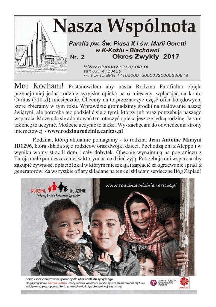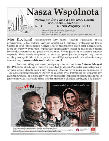 Nasza Wspólnota Parafia pw. Św. Piusa X i św. Marii Goretti w K-Koźlu - Blachowni Nr. 2 Okres Zwykły 2017 Www.blachownia.opole.pl tel: 077 4723455 nr. konta BPH 17106000760000320000330878 Moi Kochani! Postanowiłem aby nasza Rodzina Parafialna objęła przynajmniej jedną rodzinę syryjska opieką na 6 miesięcy, wpłacając na konto Caritas (510 zl) miesięcznie. Chcemy na to przeznaczyć część ofiar kolędowych, które zbieramy w tym roku. Wprawdzie gromadzimy środki na malowanie naszej świątyni, ale potrzeba też podzielić się z tymi, którzy już teraz potrzebują naszego wsparcia. Może uda się adoptować tzn. otoczyć opieką jeszcze jedną rodzinę. Ja sam też chcę to uczynić. Możecie uczynić to także i Wy- zachęcam do odwiedzenia strony internetowej - www.rodzinarodzinie.caritas.pl Rodzina, której aktualnie pomagamy - to rodzina Jean Antoine Mnayni ID1296, która składa się z rodziców oraz dwójki dzieci. Pochodzą oni z Aleppo i w wyniku wojny stracili dom i cały dobytek. Obecnie wynajmują na pograniczu z Turcją małe pomieszczenie, w którym na co dzień żyją. Potrzebują oni wsparcia aby zakupić żywność, opłacić lokal w którym mieszkają i zapłacić za ogrzewanie i prąd z generatorów. Za wszystkie ofiary składane na ten cel składam serdeczne Bóg Zapłać! Intencje mszalne od 16.01-05.02.2017 PONIEDZIAŁEK 16.01.2017 7.30 - I Za + Jacka Krawiec w 2 rocz. śmierci. II Za + Wiesława Roszkowskiego (p) ----------------------------------------------------------------------------------------------------------WTOREK 17.01.2017 św. Antoniego opata 7.30 - Msza św. i Nowenna do MBNP I 1. W int. dobrodziejów, ofiarodawców naszej Parafii 2. Przez wstawiennictwo MBNP dziękując za otrzymane łaski prosząc o dalsze błog. Boże, zdrowie i opiekę w rodzinie w p. int. 3. Przez wstawiennictwo MBNP dziękując za otrzymane łaski prosząc o dalsze błog. Boże, zdrowie i opiekę w int. Gotfryda Konieczko i Bronisławy Kowalskiej z ok. ur. od Caritasu. 4. O zdrowie w p. int. II W int. Parafian. --------------------------------------------------------------------------------------------------ŚRODA 18.01.2017 7.30 - Nowenna do św. Józefa I Za ++ kapłanów. II W int. Parafian ------------------------------------------------------------------------------------------------CZWARTEK 19.01.2017 7.30 - I Za + ojca Walentego Garbas w rocz. Śmierci + mamę Paulinę +z rodzin Garbas, Paździor i Suhs. II Z + Zbigniewa Bromek (p) ---------------------------------------------------------------------------------------------------PIĄTEK 20.01.2017 7.30 - I Za + Tadeusza Krzyż (p) II Za + Jana Mazurek (p) ---------------------------------------------------------------------------------------------------SOBOTA 21.01.2017 św. Agnieszki Dzień Babci 7.30 - Za śp. Wiesława od siostry Barbary z mężem 18.00 - Za ++ rodz. Władysławę i Józefa ++ rodz. Anielę i Ryszarda Czekala ++ 3 braci ++ Anielę i Henryka Swaczyna. ---------------------------------------------------------------------------------------------------- III NIEDZIELA ZWYKŁA - 22.01.2017 7.30 - Przez wstawiennictwo MBNP dziękując za otrzymane łaski prosząc o dalsze błog. Boże, zdrowie i opiekę w int. Władysława Żołyńskiego z ok. 80 rocz. urodzin. 8.45 - w j. Niem. Przez wstawiennictwo MBNP dziękując za otrzymane łaski prosząc o dalsze błog. Boże, zdrowie i opiekę w int. Piotra z ok. urodzin i w int. całej rodziny. 10.00 - W int. Rodzin odwiedzanych po kolędzie w minionym tygodniu. 11.30 - Przez wstawiennictwo MBNP dziękując za otrzymane łaski prosząc o dalsze błog. Boże, zdrowie i opiekę w int. Karoliny Mazurek z ok. 19 rocz. urodzin. 15.15 - Nieszpory Niedzielne - modlitwa w int. Naszych Babć i Dzidków 16.00 - Za + Władysławę Ołdak w rocz. śmierci. -------------------------------------------------------------------------------------------------PONIEDZIAŁEK 23.01.2017 7.30 - I Za + Wiesława Roszkowskiego (p) II W int. Parafian ----------------------------------------------------------------------------------------------------------WTOREK 24.01.2017 św. Franciszka Salezego 7.30 - Przez wstawiennictwo św. Antoniego za ++ Alfonsa i Teodozji Wawrzynek o radość nieba. 18.00 - Msza św. i Nowenna do MBNP 1. W int. dobrodziejów, ofiarodawców naszej Parafii 2. Przez wstawiennictwo MBNP dziękując za otrzymane łaski prosząc o dalsze błog. Boże, zdrowie i opiekę w rodzinie w p. int. 3. Przez wstawiennictwo MBNP dziękując za otrzymane łaski prosząc o dalsze błog. Boże, zdrowie i opiekę w int. Stanisława Kasprzak i Anastazji Planetorz z ok. ur. od Caritasu. 4. Przez wstawiennictwo MBNP dziękując za otrzymane łaski prosząc o dalsze błog. Boże, zdrowie i opiekę w int. Anny. 5. Przez wstawiennictwo MBNP dziękując za otrzymane łaski prosząc o dalsze błog. Boże, zdrowie i opiekę w int. męża Stanisława z ok. urodzin i w int. Wnuków. 6. Przez wstawiennictwo MBNP dziękując za otrzymane łaski prosząc o dalsze błog. Boże, zdrowie i opiekę w int. Adeli i Marioli z ok. urodzin. 7. Za ++ rodz. Martę i Eryka Konieczko w rocz. śmierci ++ z całego pokrewieństwa. 8. Za + mamę Walerię w rocz. śmierci ++ teścia Wacława + męża Krzysztofa. --------------------------------------------------------------------------------------------------ŚRODA 25.01.2017 Nawrócenie św. Pawła 7.30 - Nowenna do św. Józefa I Za + brata Czesława w 5 rocz. śmierci oraz ++ rodz. Mariannę i Piotra Wilińskich II Za śp. Szwagra Krzysztofa Kośmider i jego + matkę Jadwigę.. ------------------------------------------------------------------------------------------------CZWARTEK 26.01.2017 18.00 - I Za + Jana Mazurek od rodziny Andrzeja Henek. II Za + Zbigniewa Bromek (p) ---------------------------------------------------------------------------------------------------PIĄTEK 27.01.2017 7.30 - Za + Tadeusza Krzyż (p) 17.00 - Msza św. Szkolna. Za 